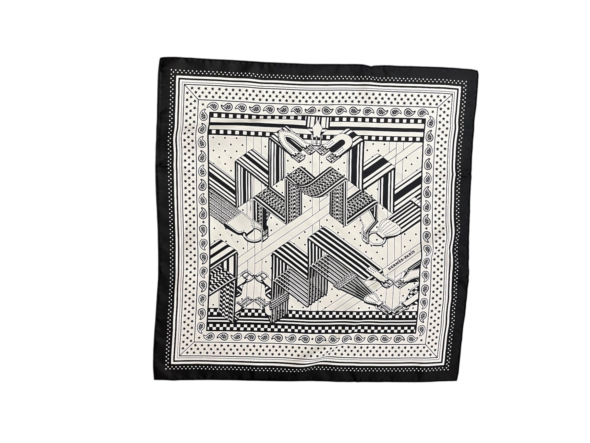 Carré en twill 100 % soie. Coloris noir et blanc avec imprimé sangle en zigzag et bandana.