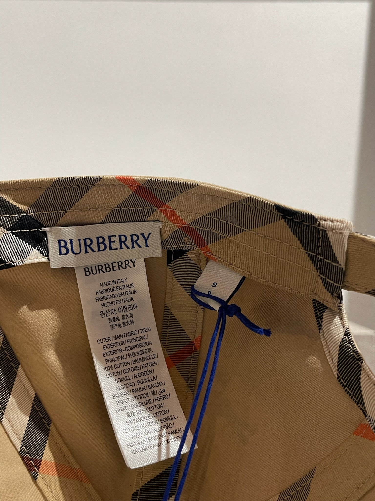 Casquette en gabardine de coton beige ornée du motif tartan Burberry sur la bride et sous la visière. Taille ajustable à l'arrière. Emblème Equestrian Knight brodé ton sur ton sur le côté.