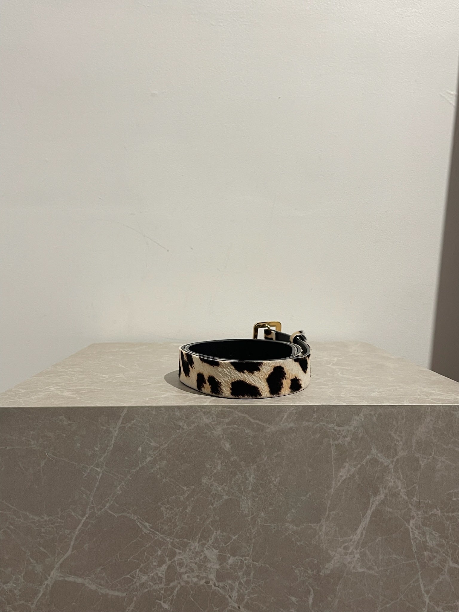 Ceinture en poulain imprimé léopard ornée d'un boucle carrée dorée. Taille ajustable.