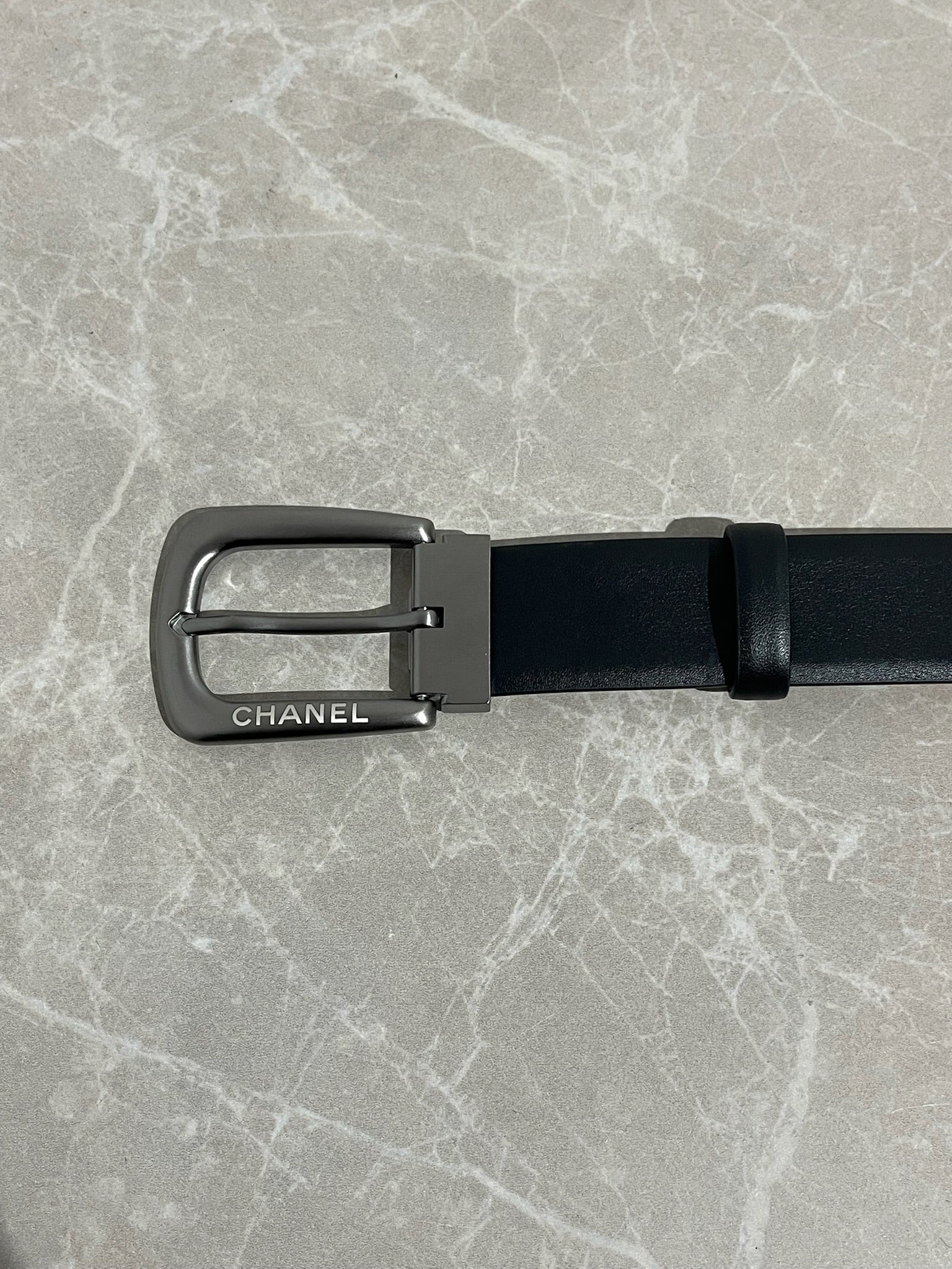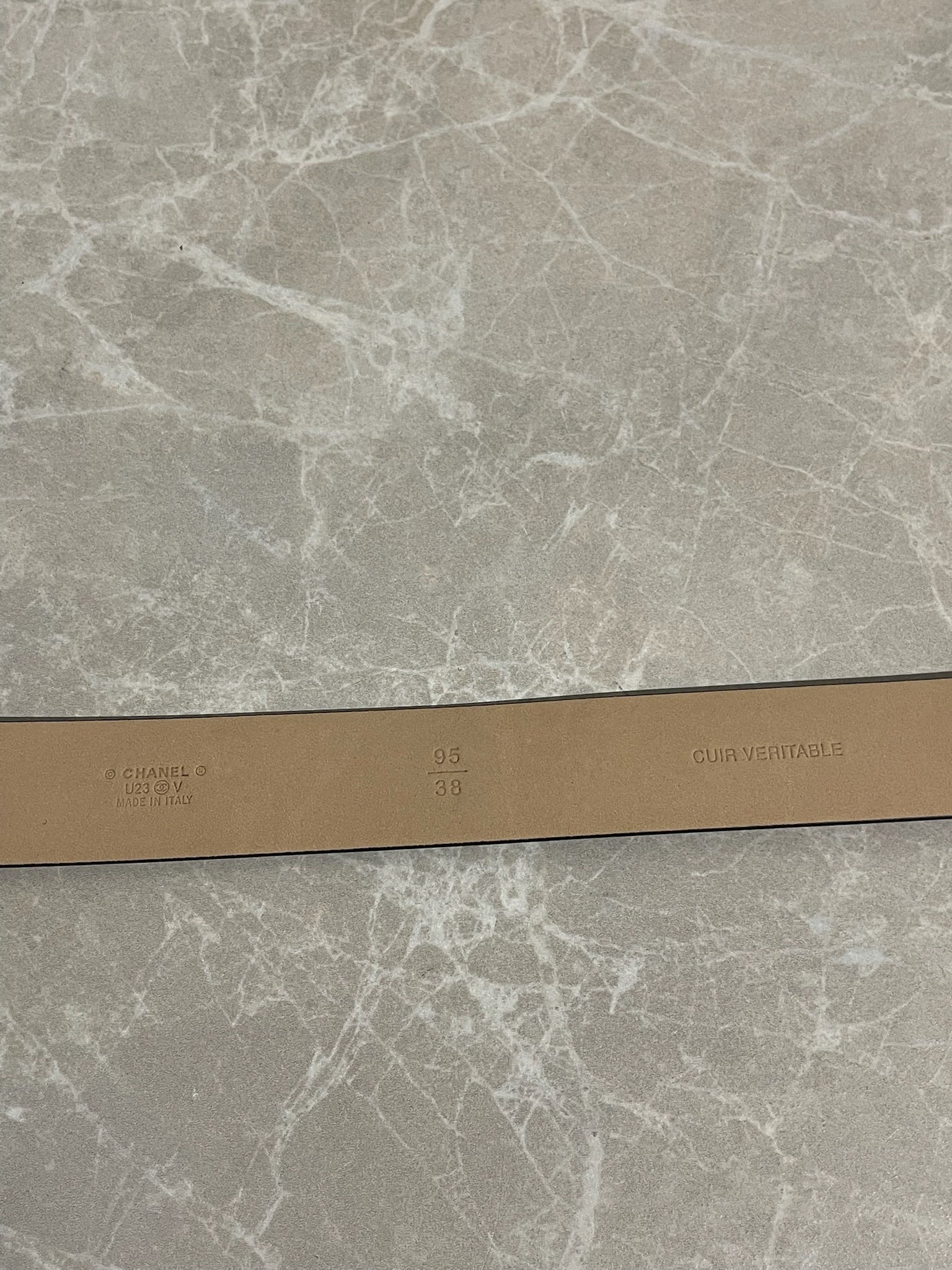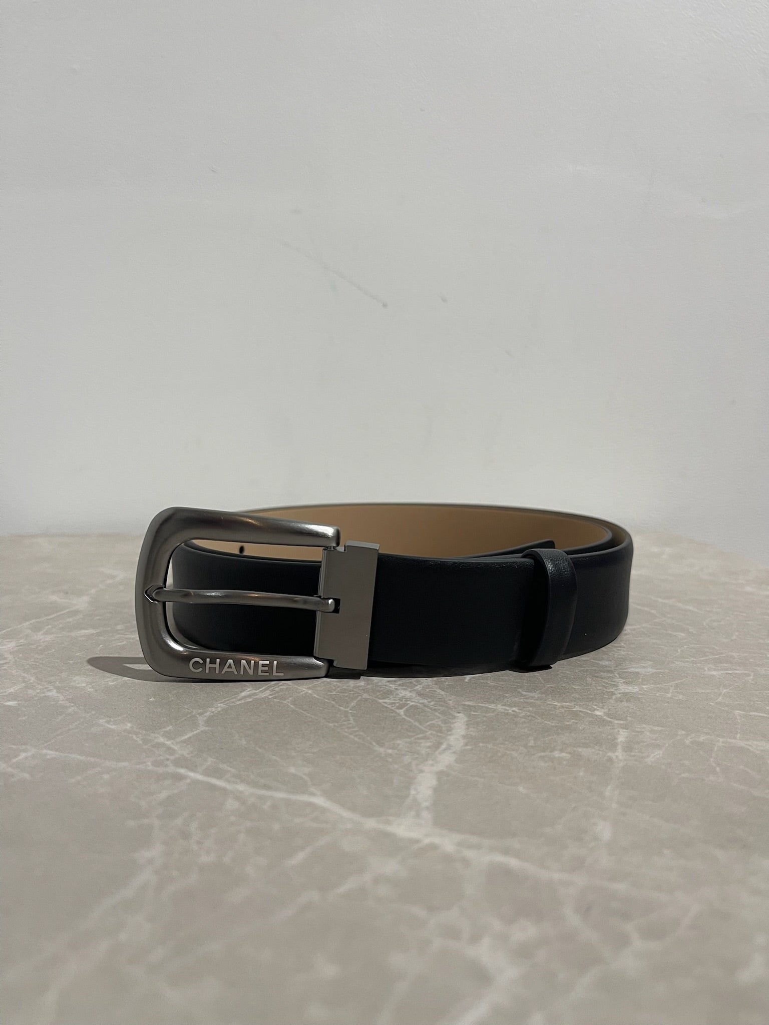 Ceinture en cuir noir avec boucle en métal argent signé Chanel. Taille ajustable.