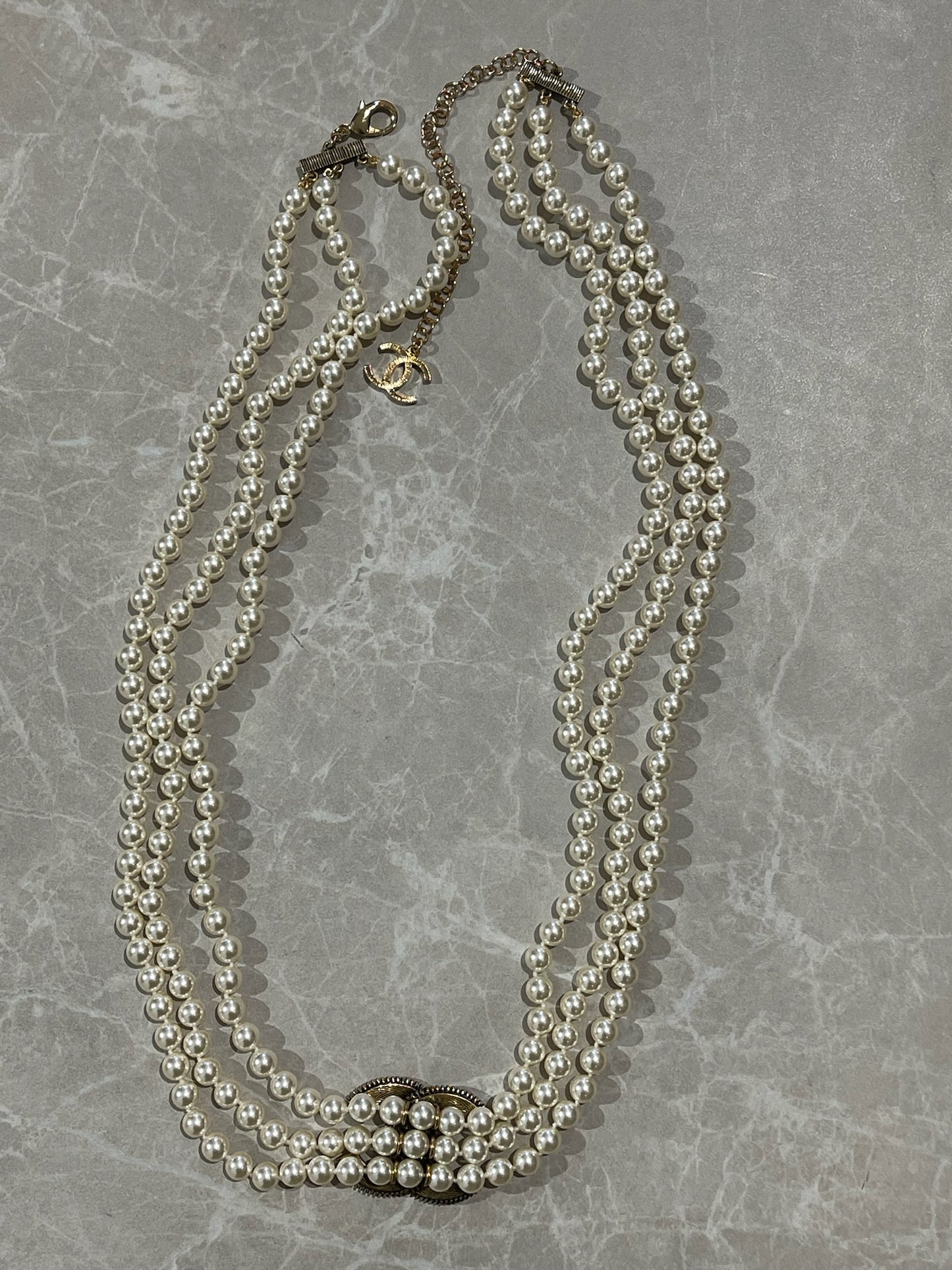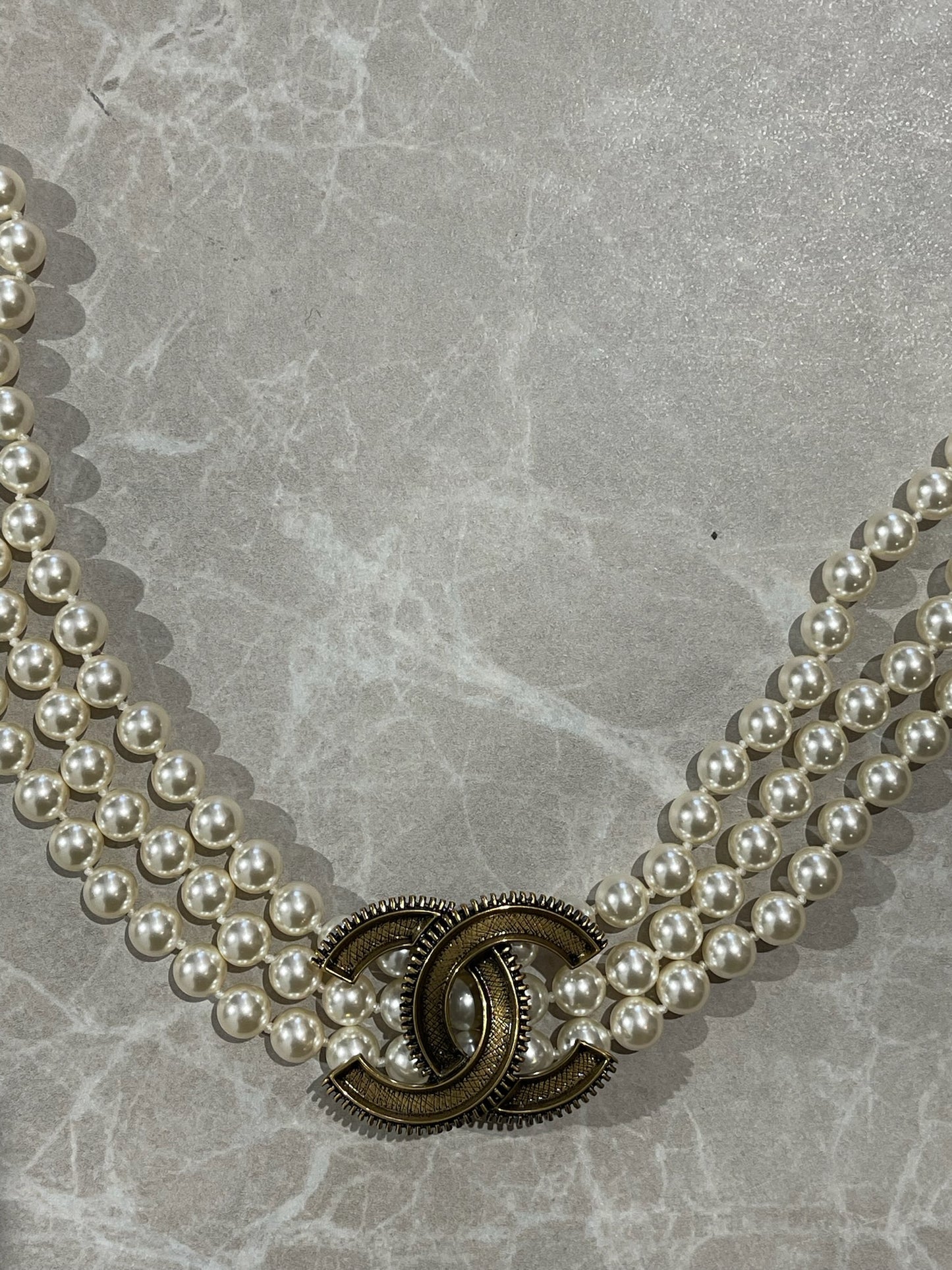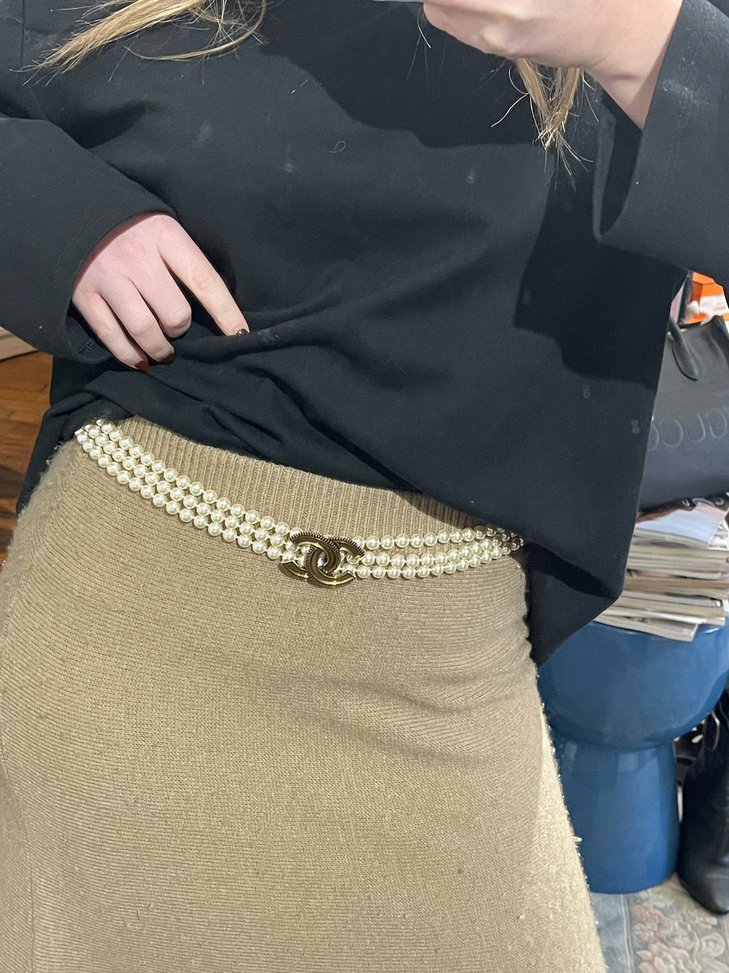 Magnifique ceinture en perle orné du logo CC en métal doré vieilli sur le devant de la ceinture et logo CC au niveau de la fermeture de la ceinture.