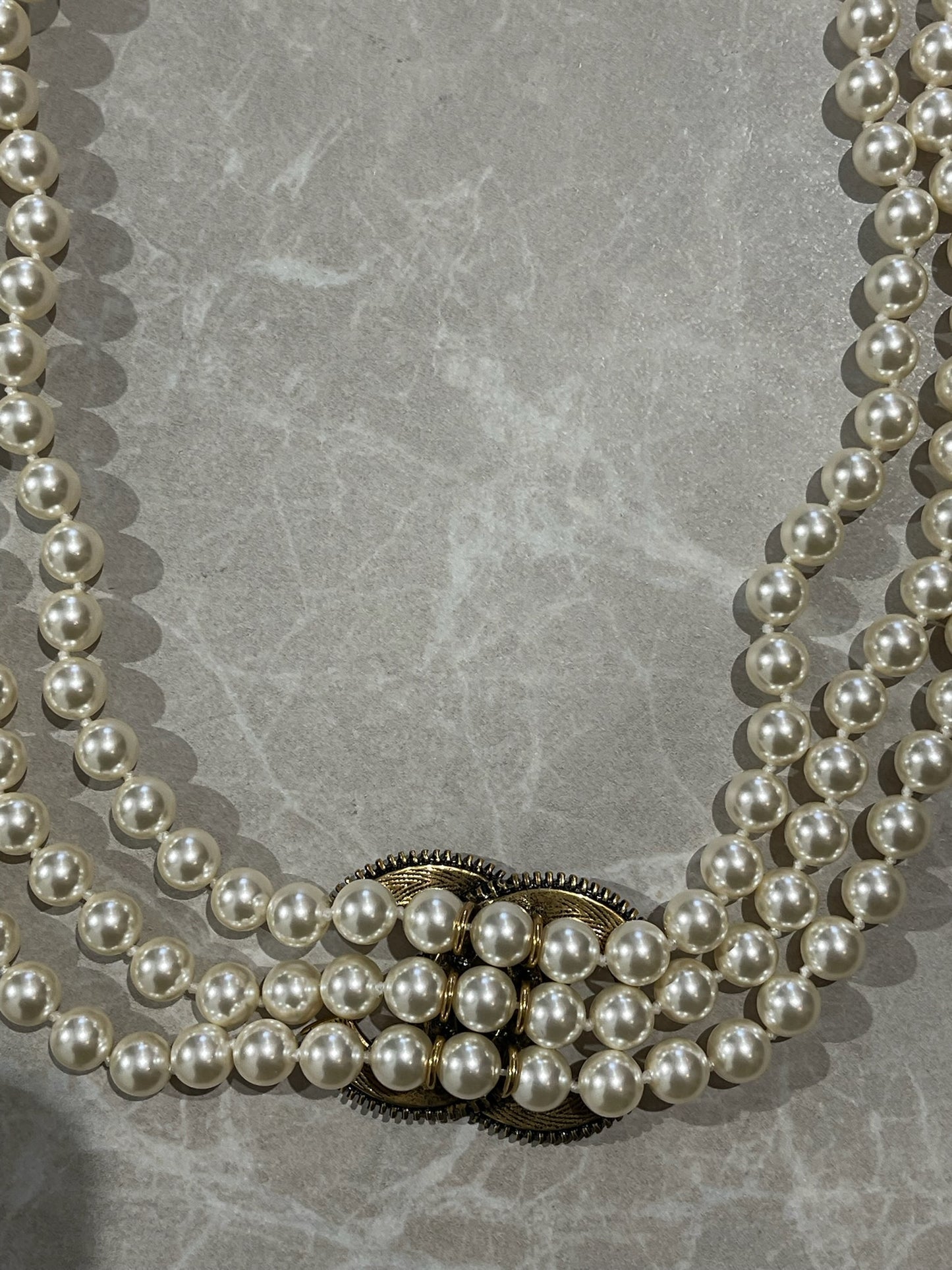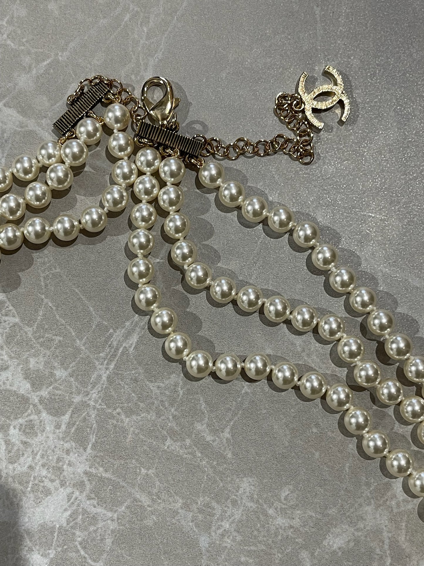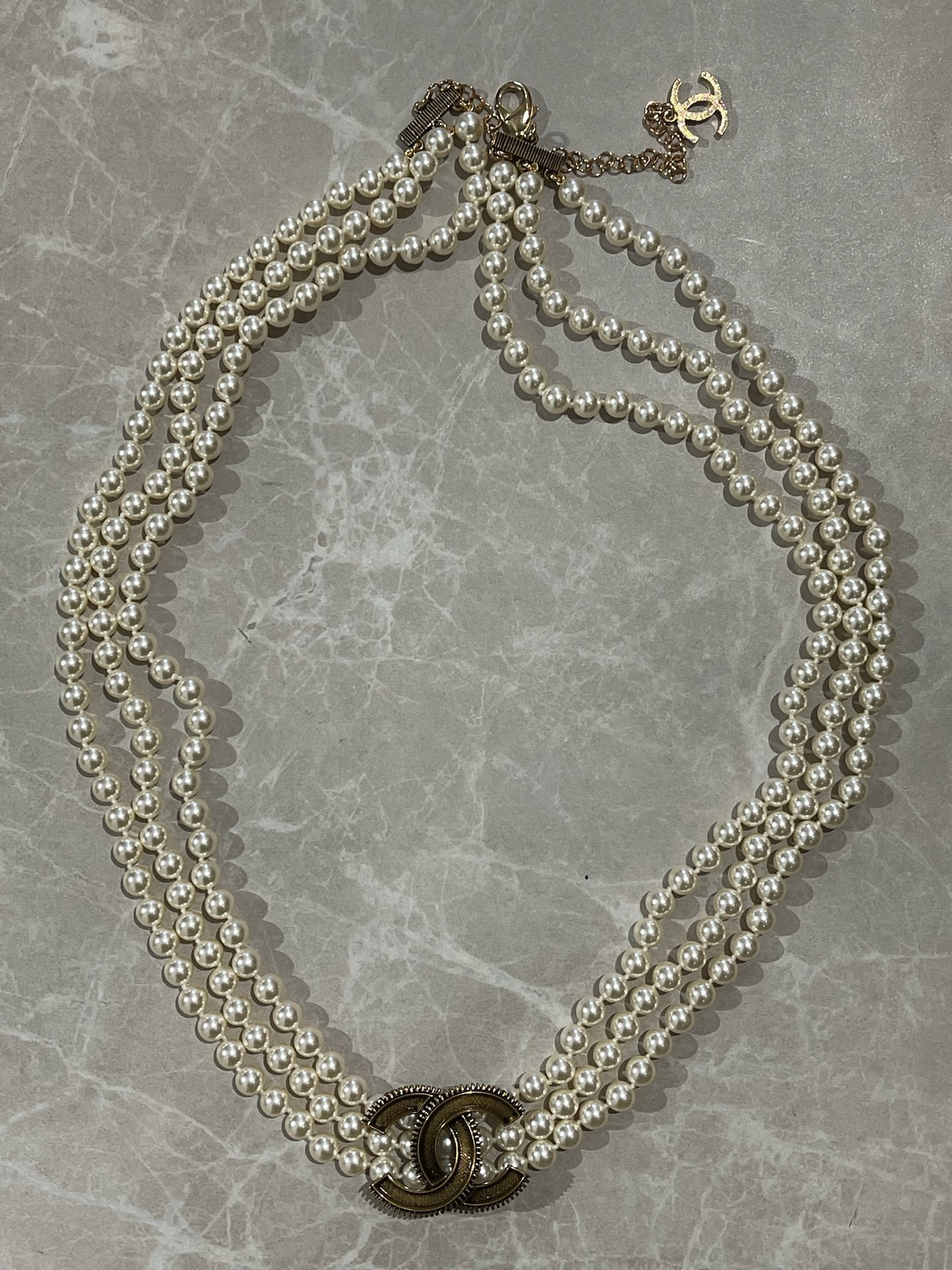 Magnifique ceinture en perle orné du logo CC en métal doré vieilli sur le devant de la ceinture et logo CC au niveau de la fermeture de la ceinture.