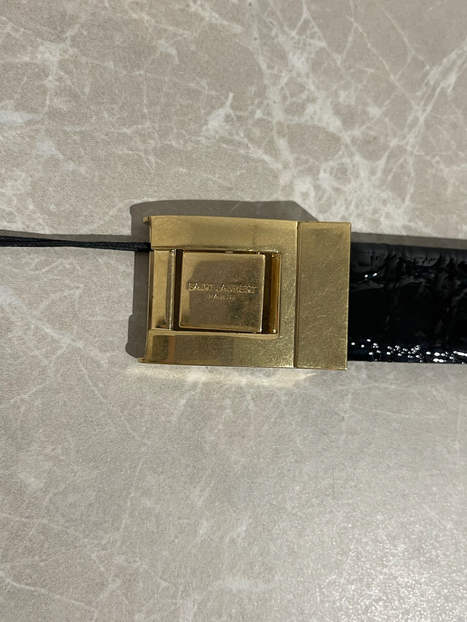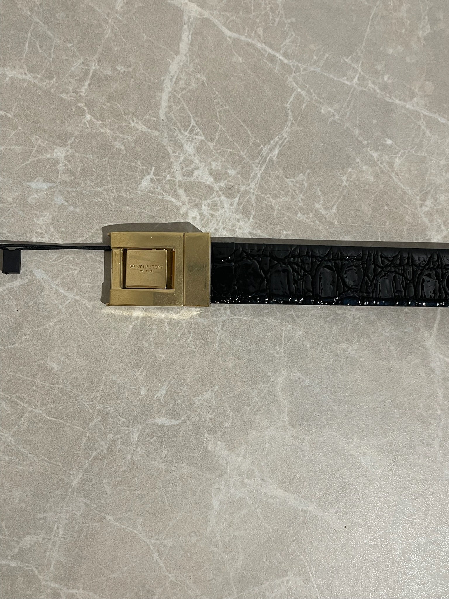 Ceinture en cuir verni noir embossé croco avec boucle en métal doré signée Saint Laurent. Taille ajustable.