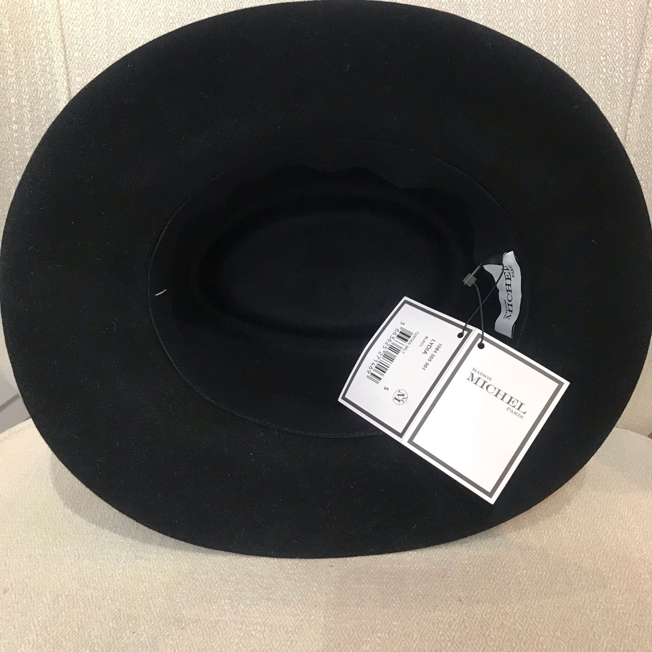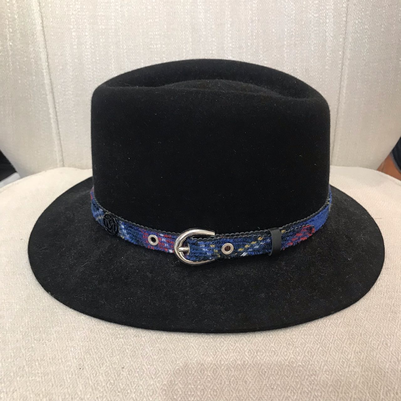 Modèle Lydia, chapeau en feutre noir et tour en tartan bleu. Plaque Logo Maison Michel sur le tour.