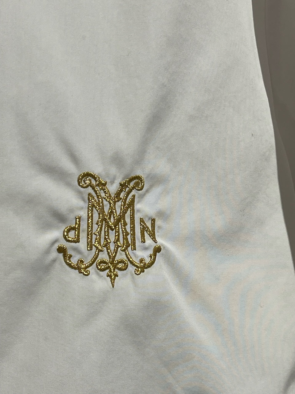 Chemise en coton blanc avec logo brodé en doré sur le bas. Fermeture boutonnée. Coupe courte.