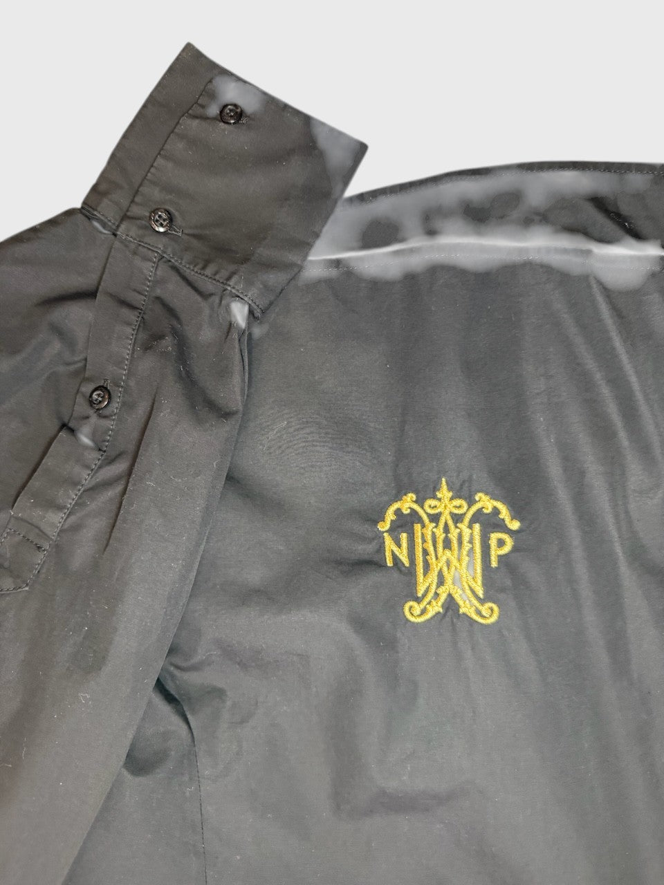 Chemise en coton noir avec logo brodé en doré sur le bas. Fermeture boutonnée. Coupe courte et large.