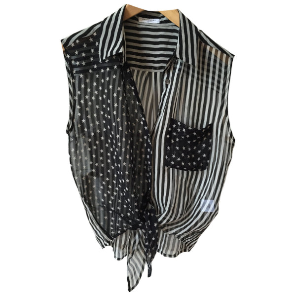 Chemise sans manche qui se noue à la taille, 100% soie imprimé drapeau des Etats-Unis en noir et blanc.