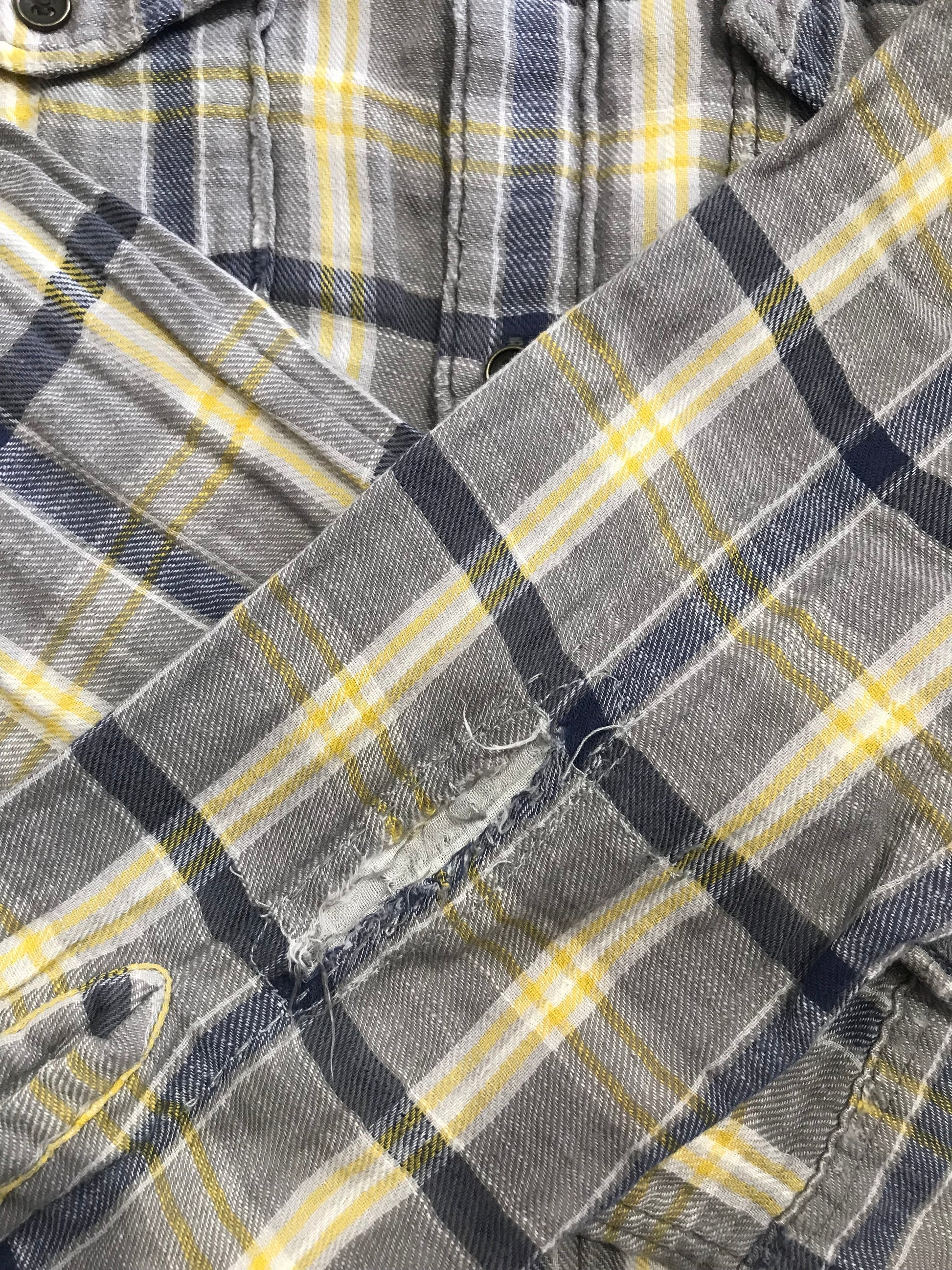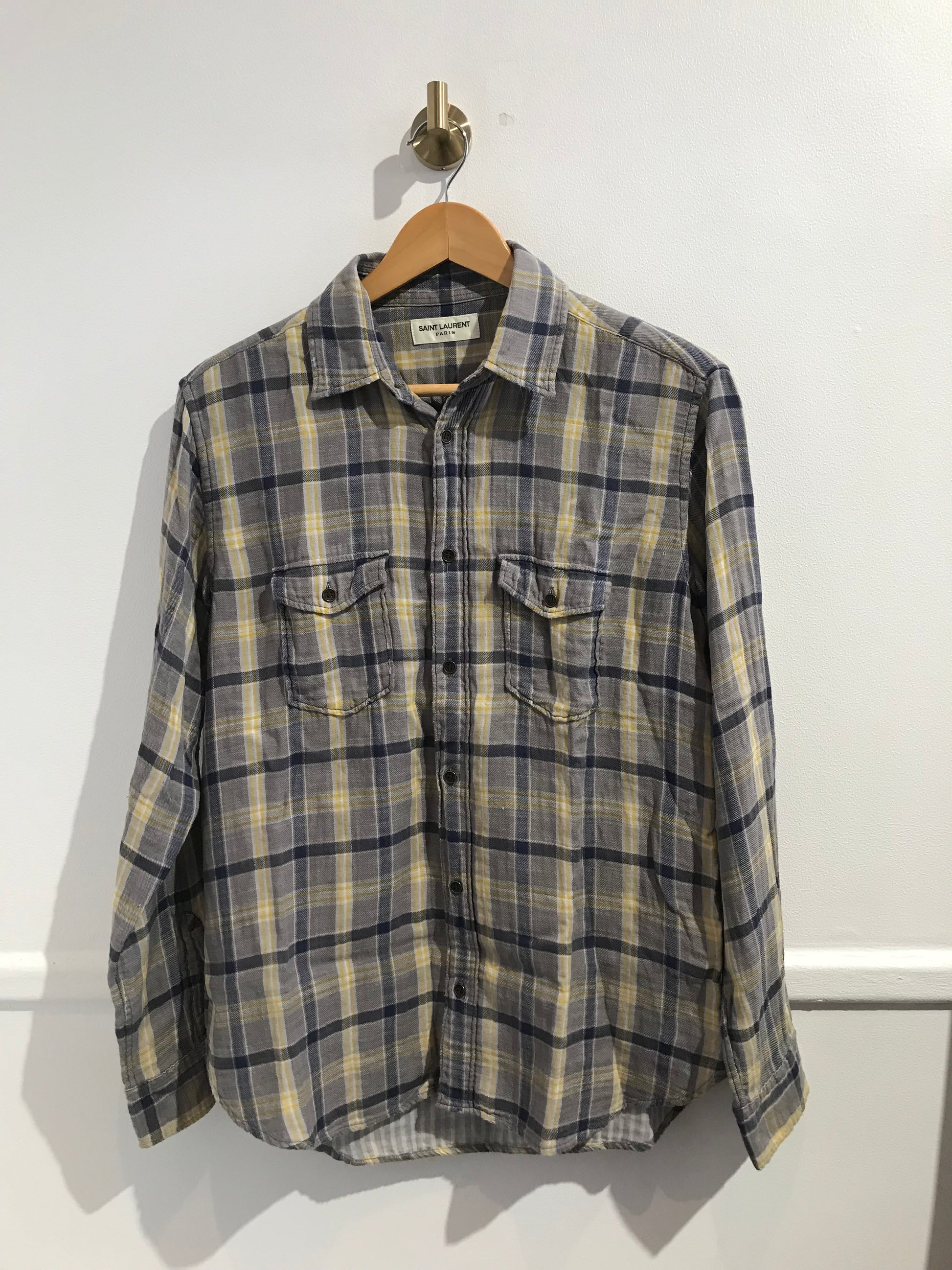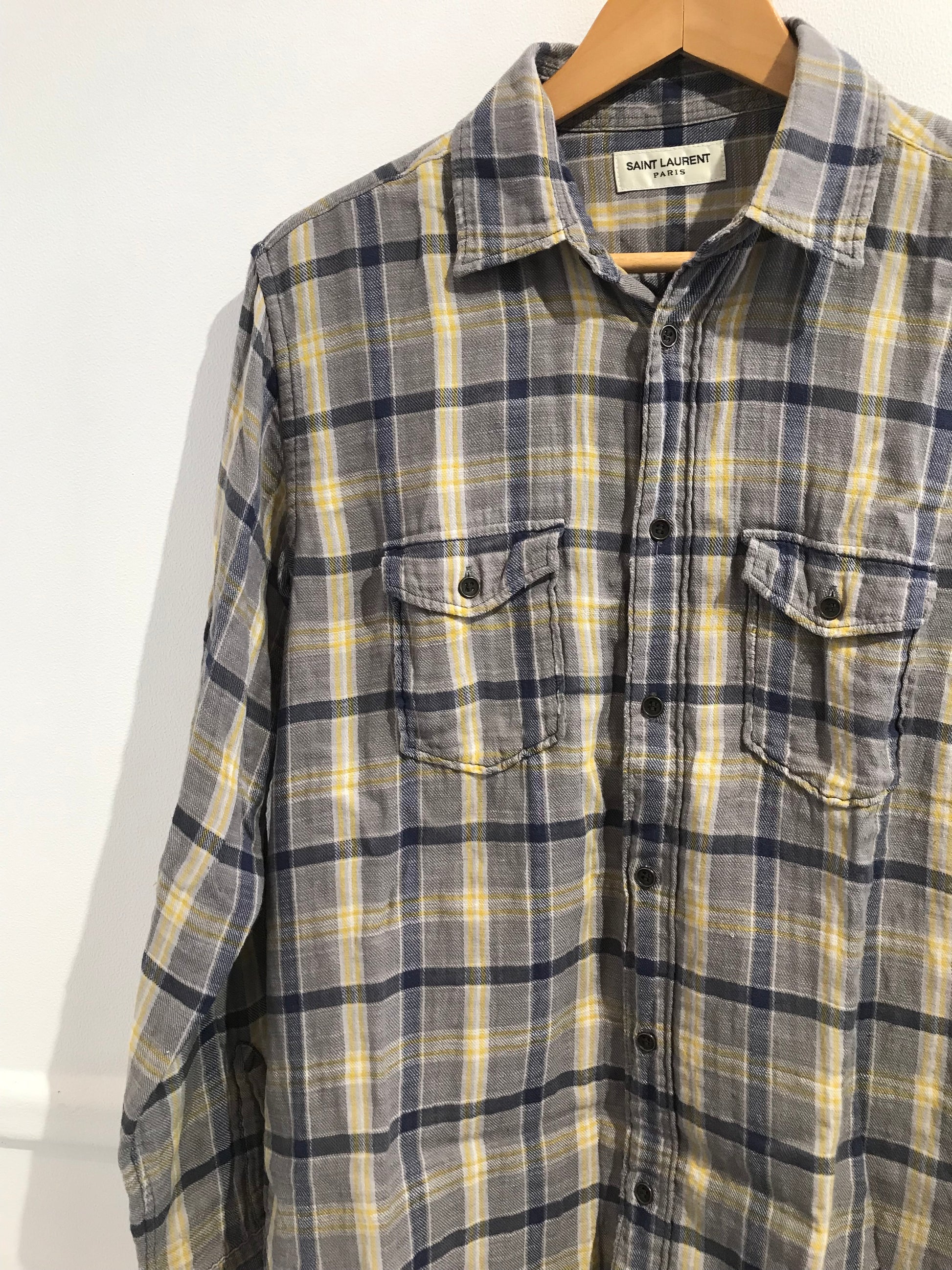 Chemise en coton imprimé carreaux gris, bleu et jaune. Fermeture boutonnée. Effet usé sur la chemise (voir photos)