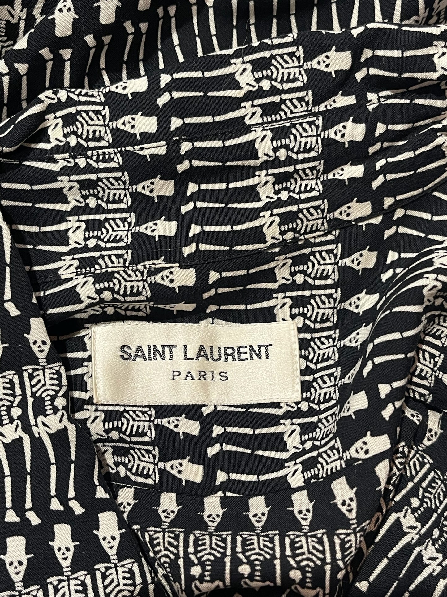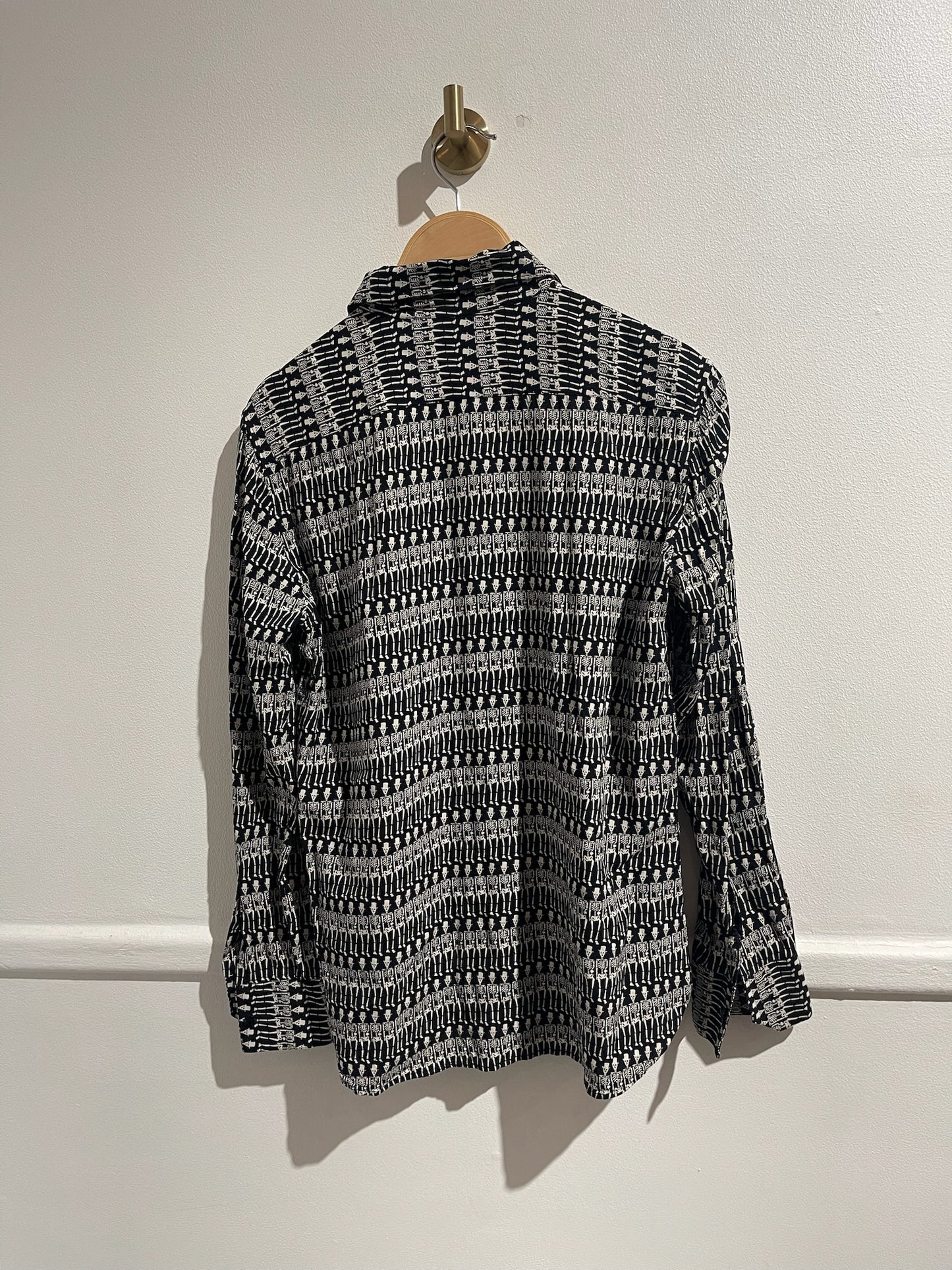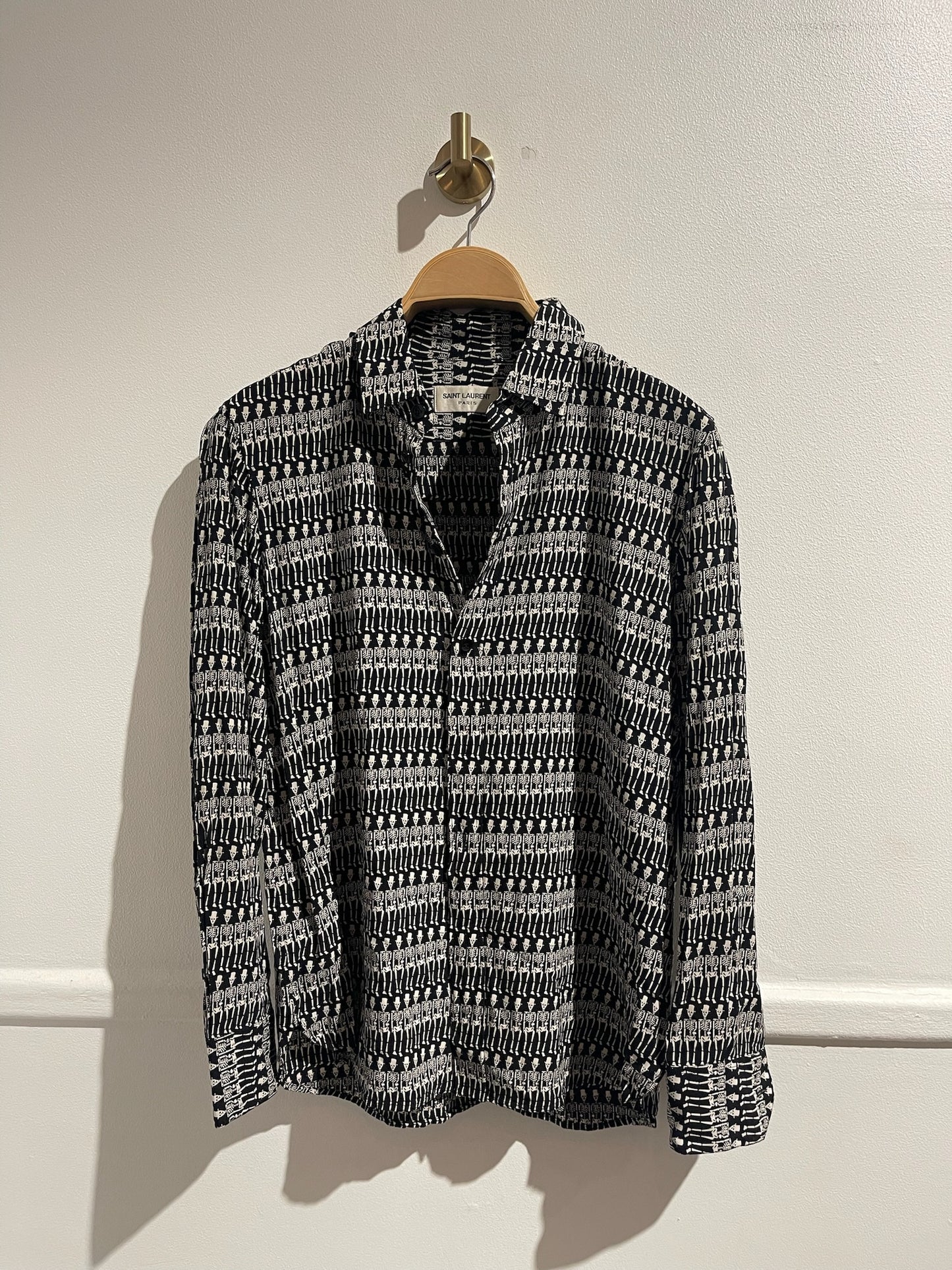 Chemise en tissu noir à motif squelettes blanc sur l'ensemble de la chemise. Fermeture à boutons.