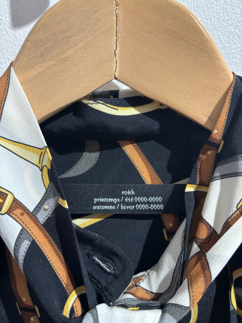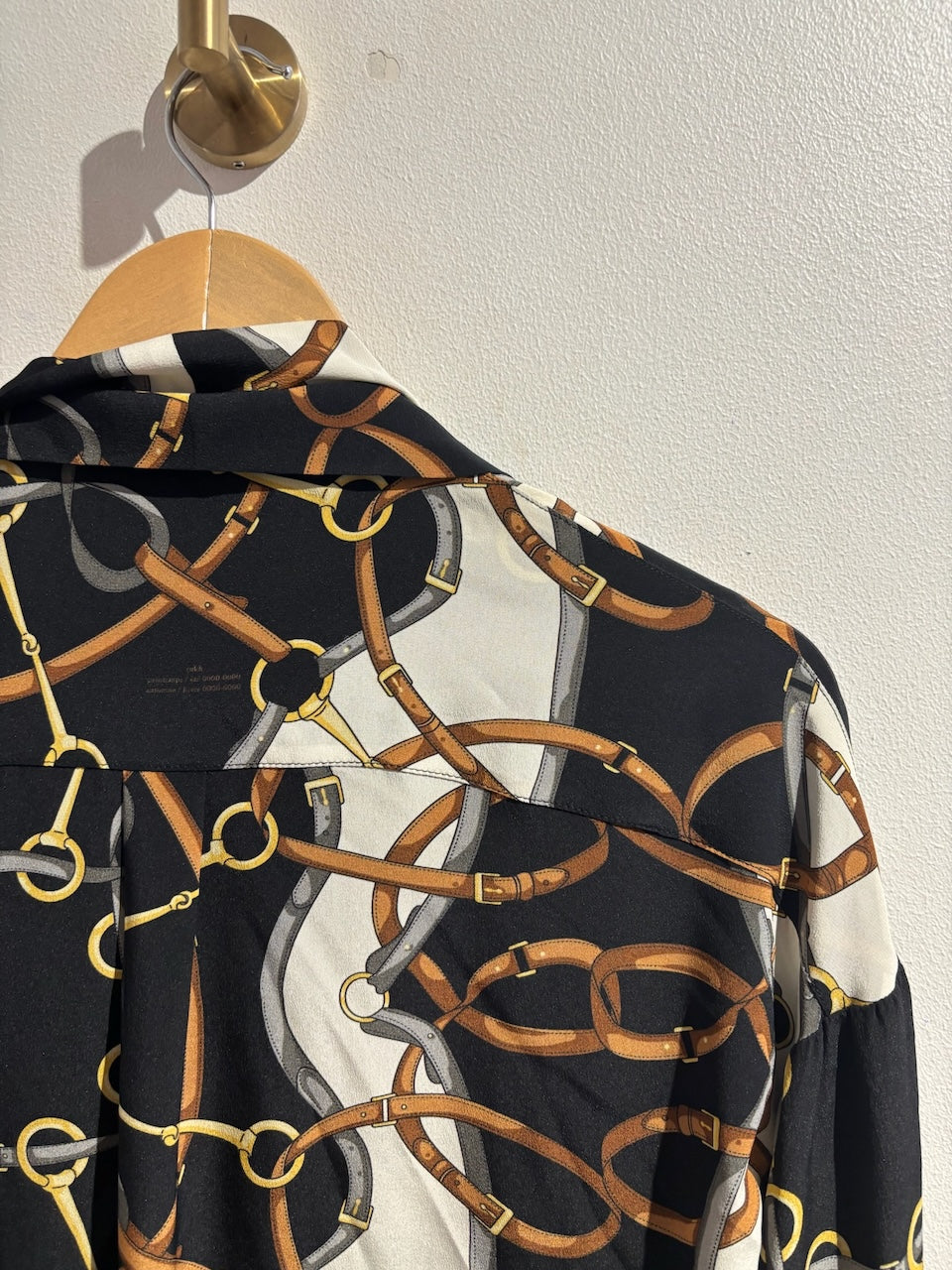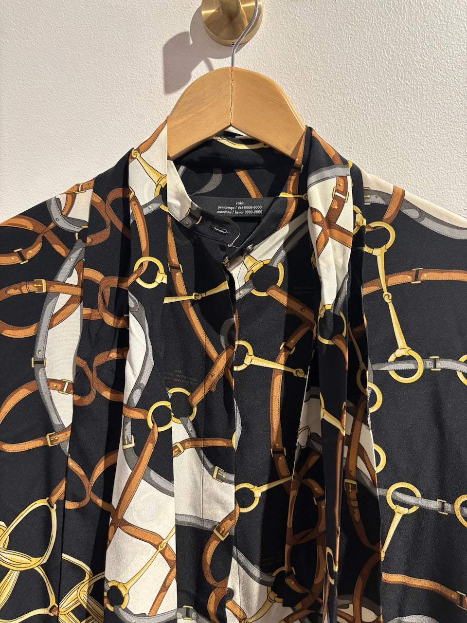 Chemisier en soie noire et écrue à motifs boucles de ceinture et mors gris, marron et jaune avec col lavallière, fermeture boutonnée et poignets boutonnés. Coupe oversize.
