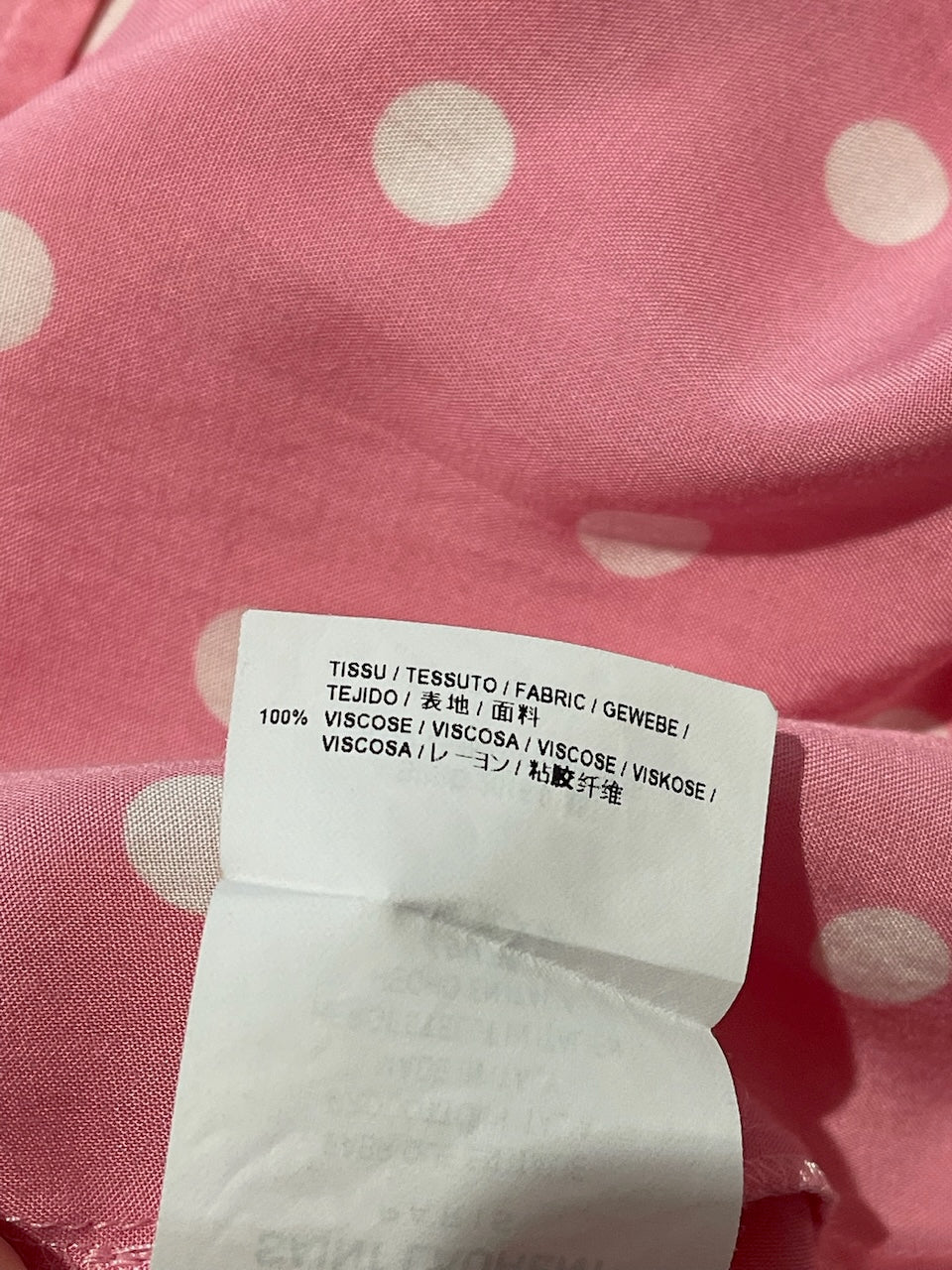 Blouse en viscose rose à pois avec encolure boutonnée, col lavallière et poignets boutonné.