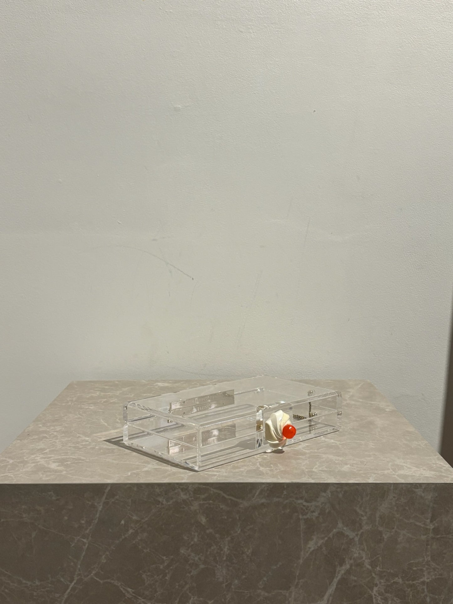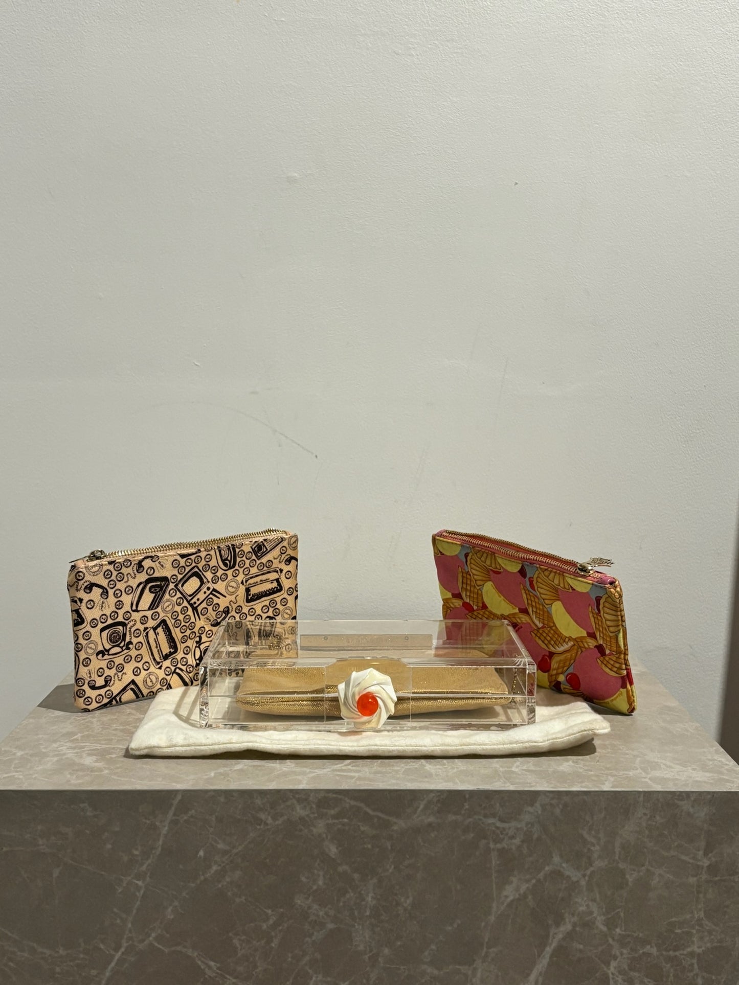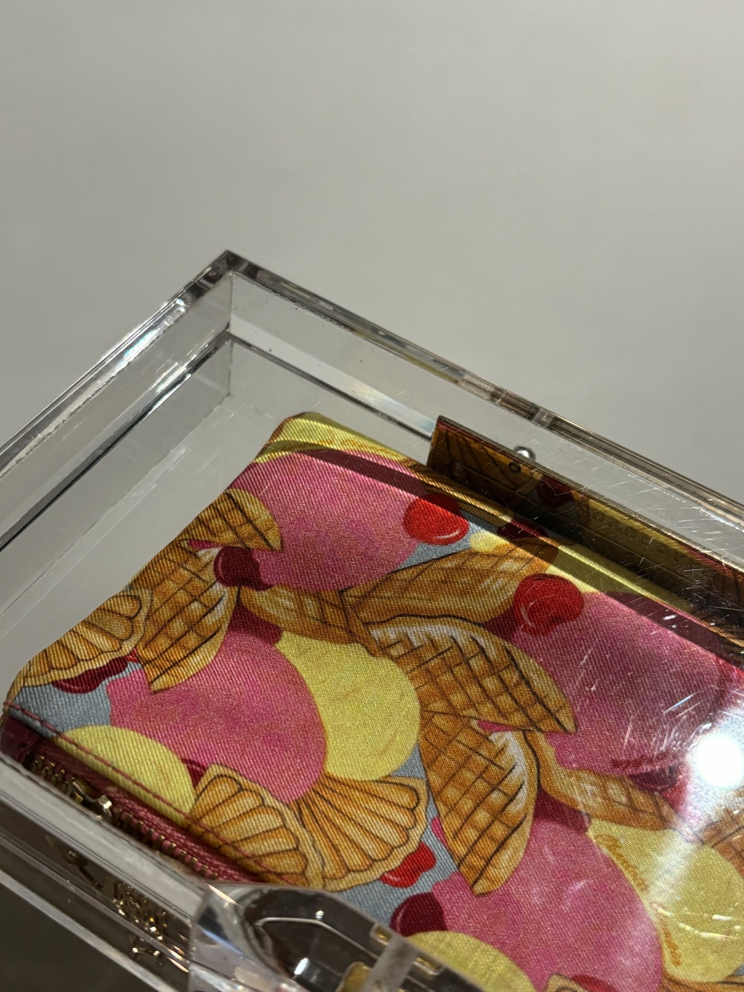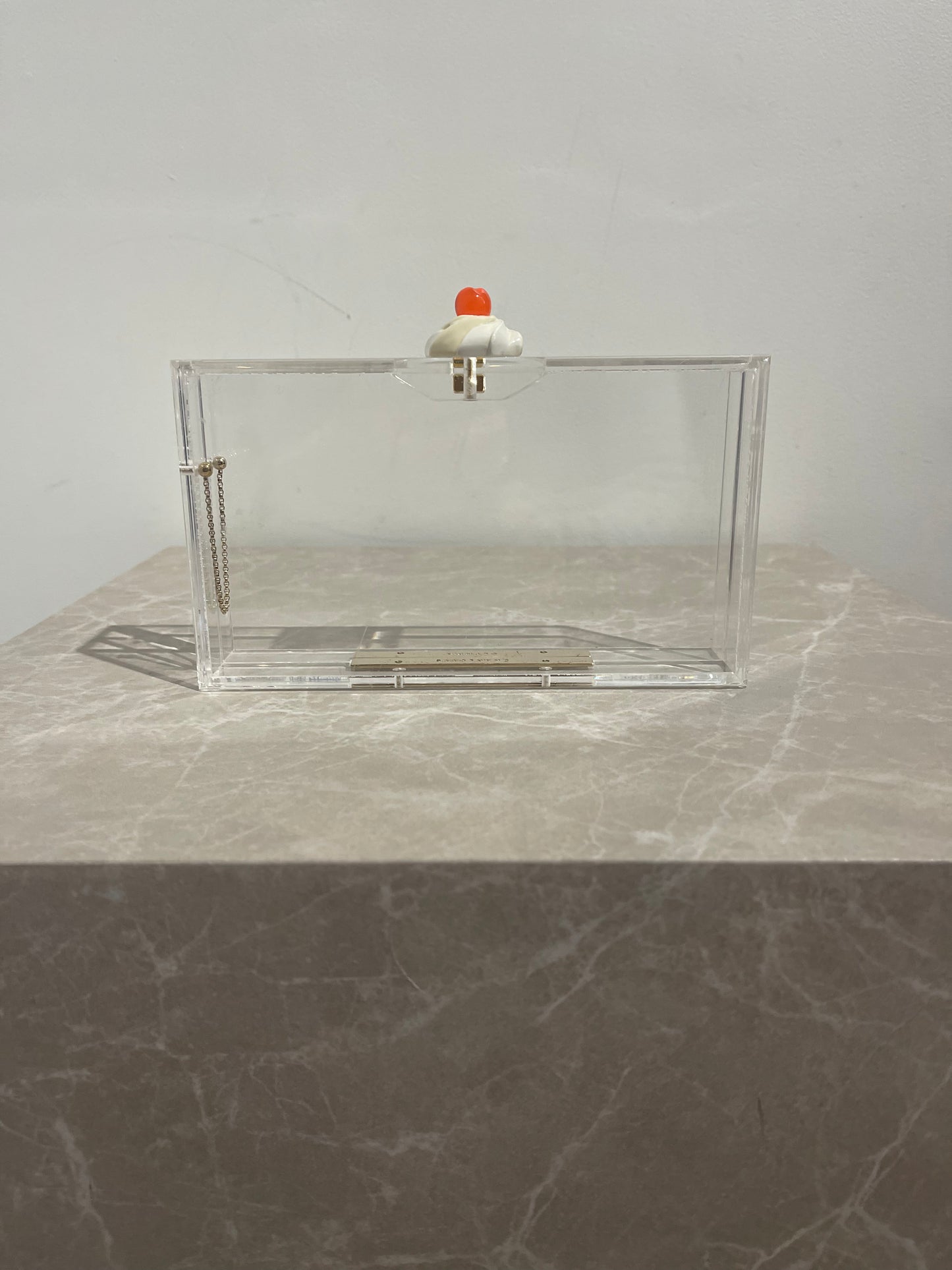 Célèbre clutch Charlotte Olympia en plexiglas et fermoir "cupcake". Trois pochettes interchangeables.
