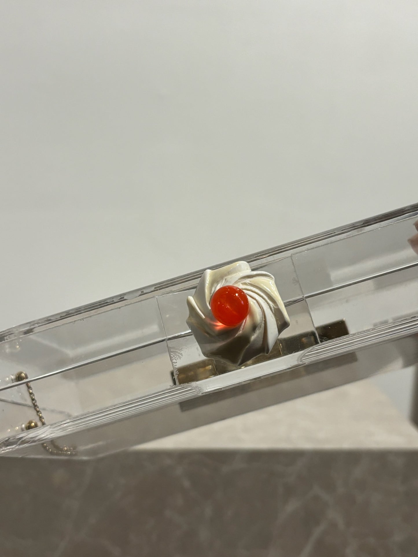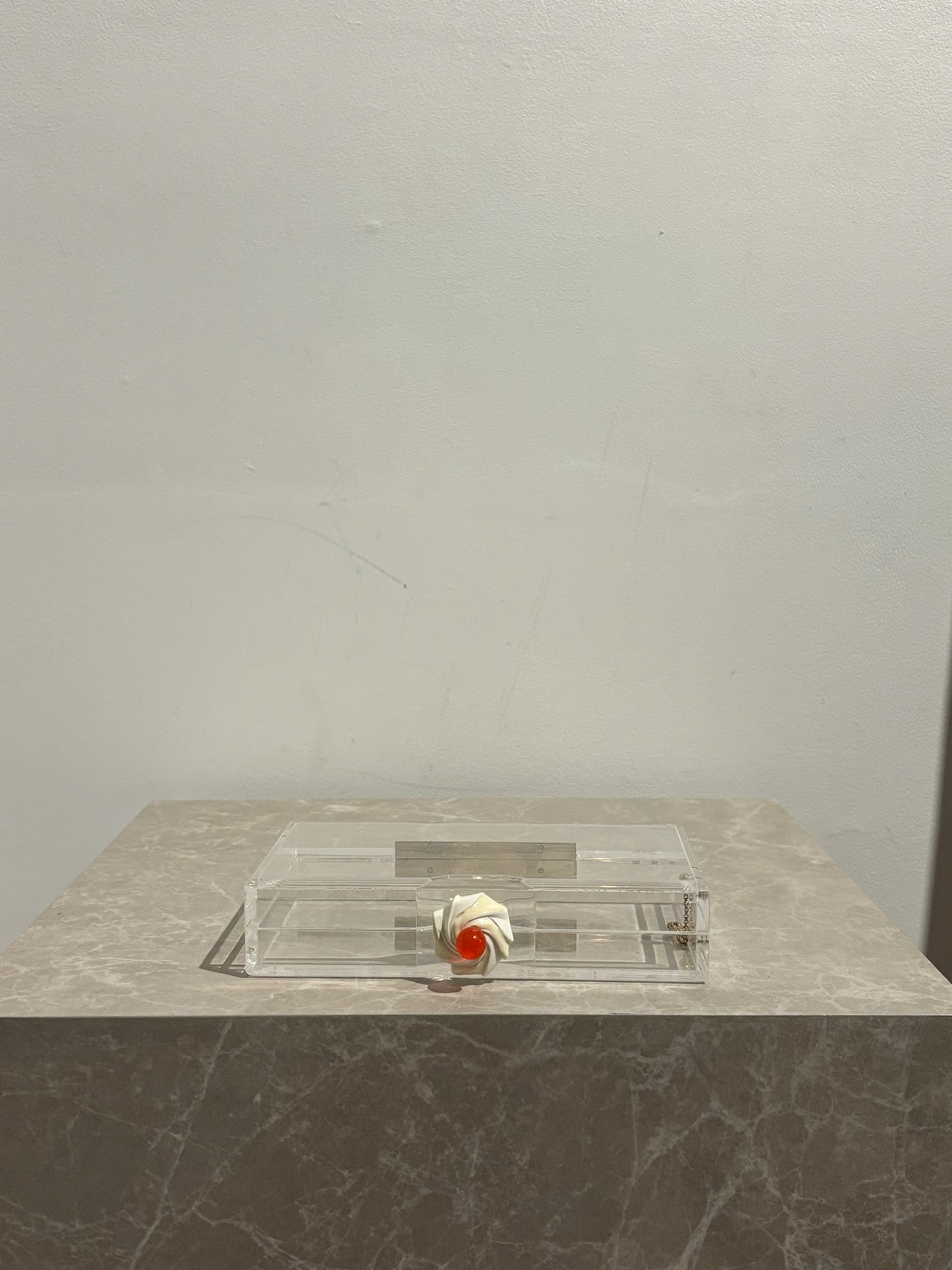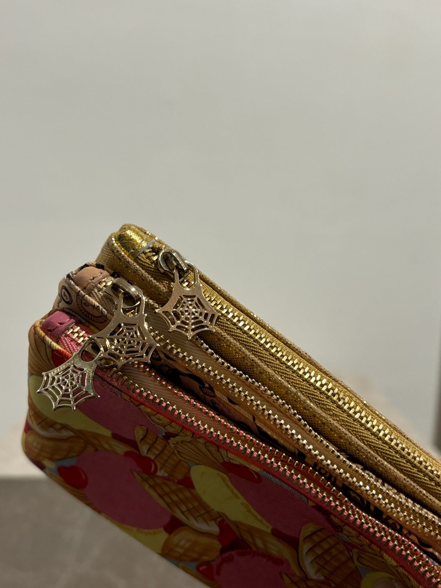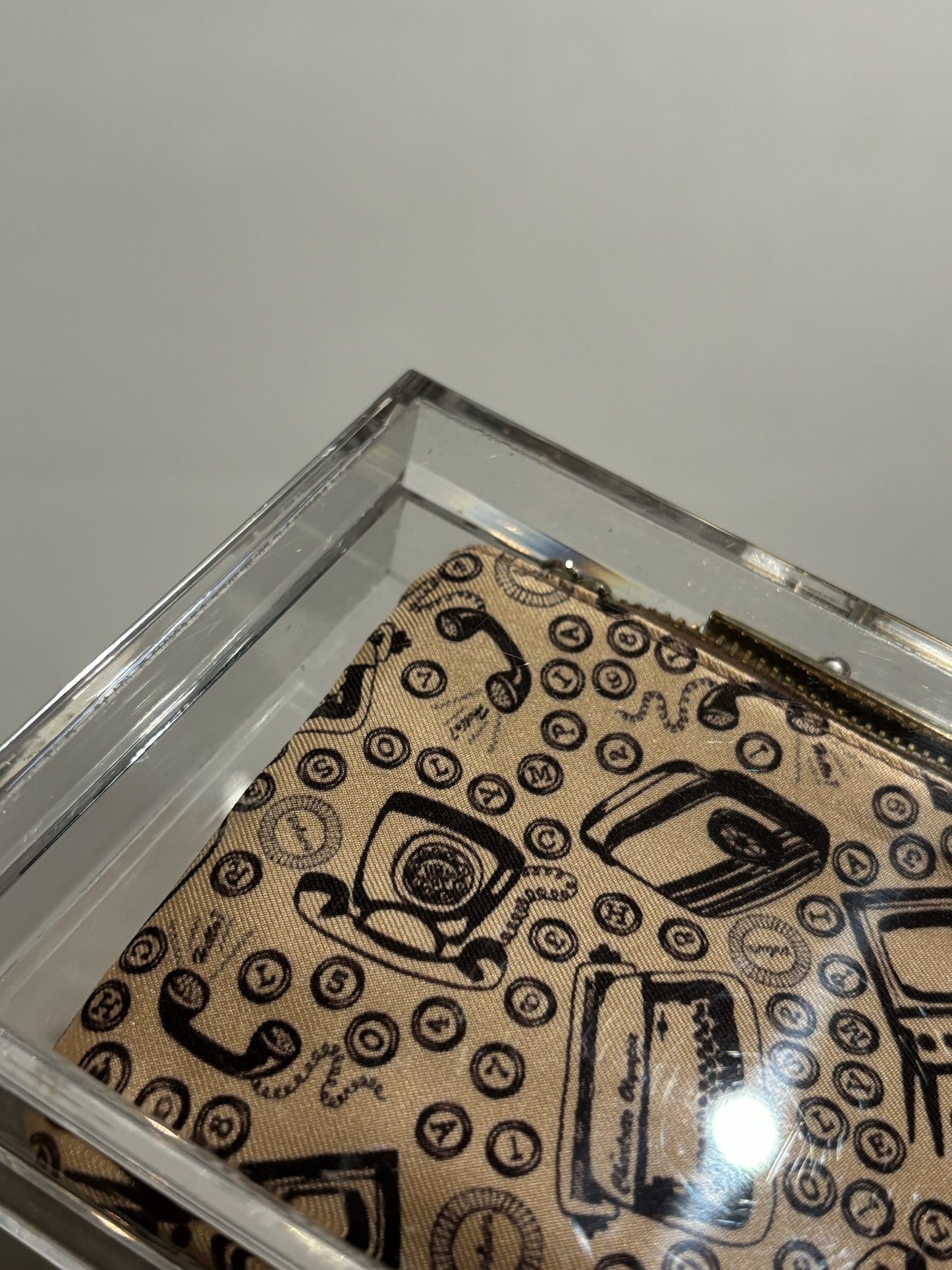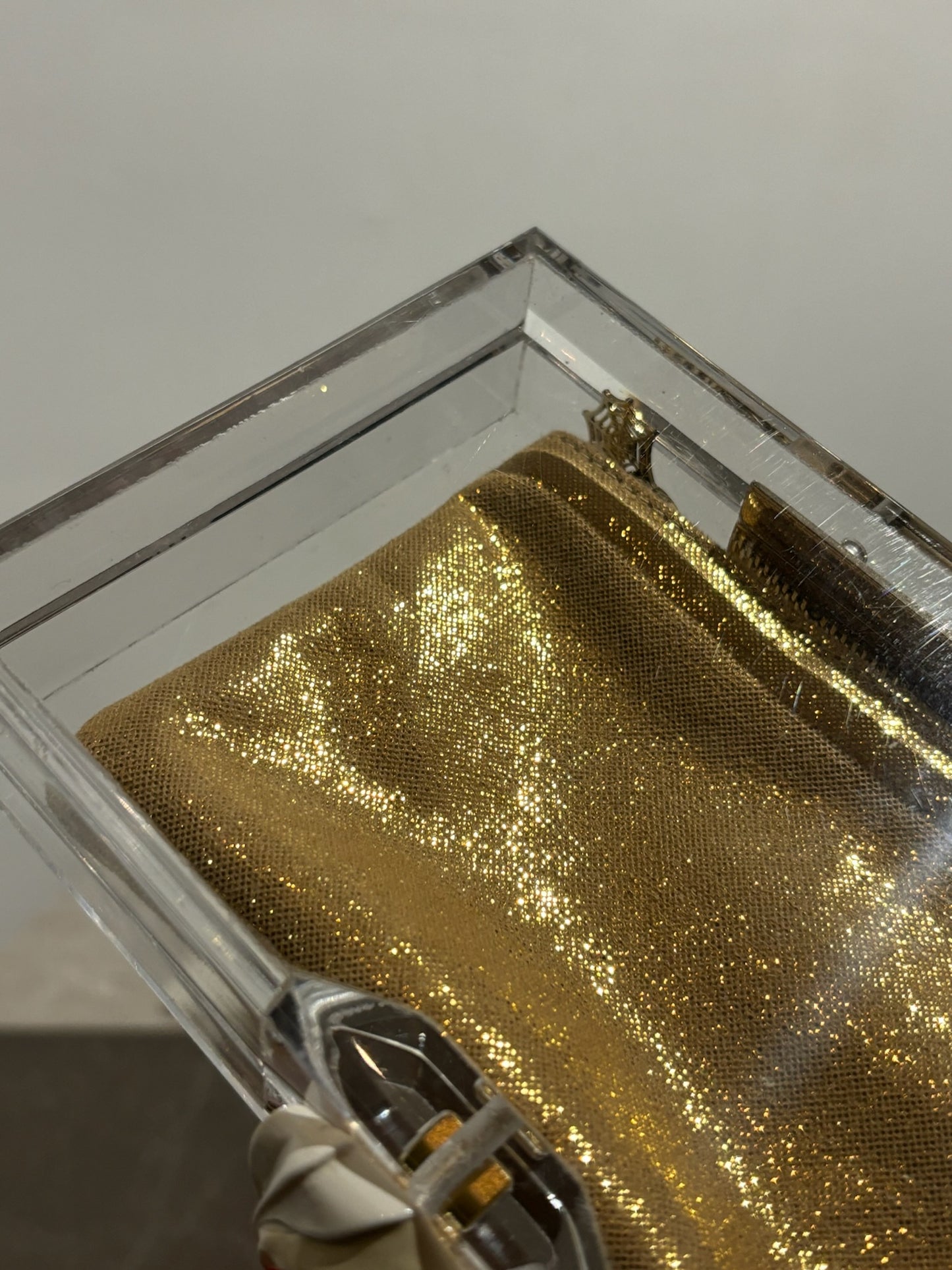 Célèbre clutch Charlotte Olympia en plexiglas et fermoir "cupcake". Trois pochettes interchangeables.