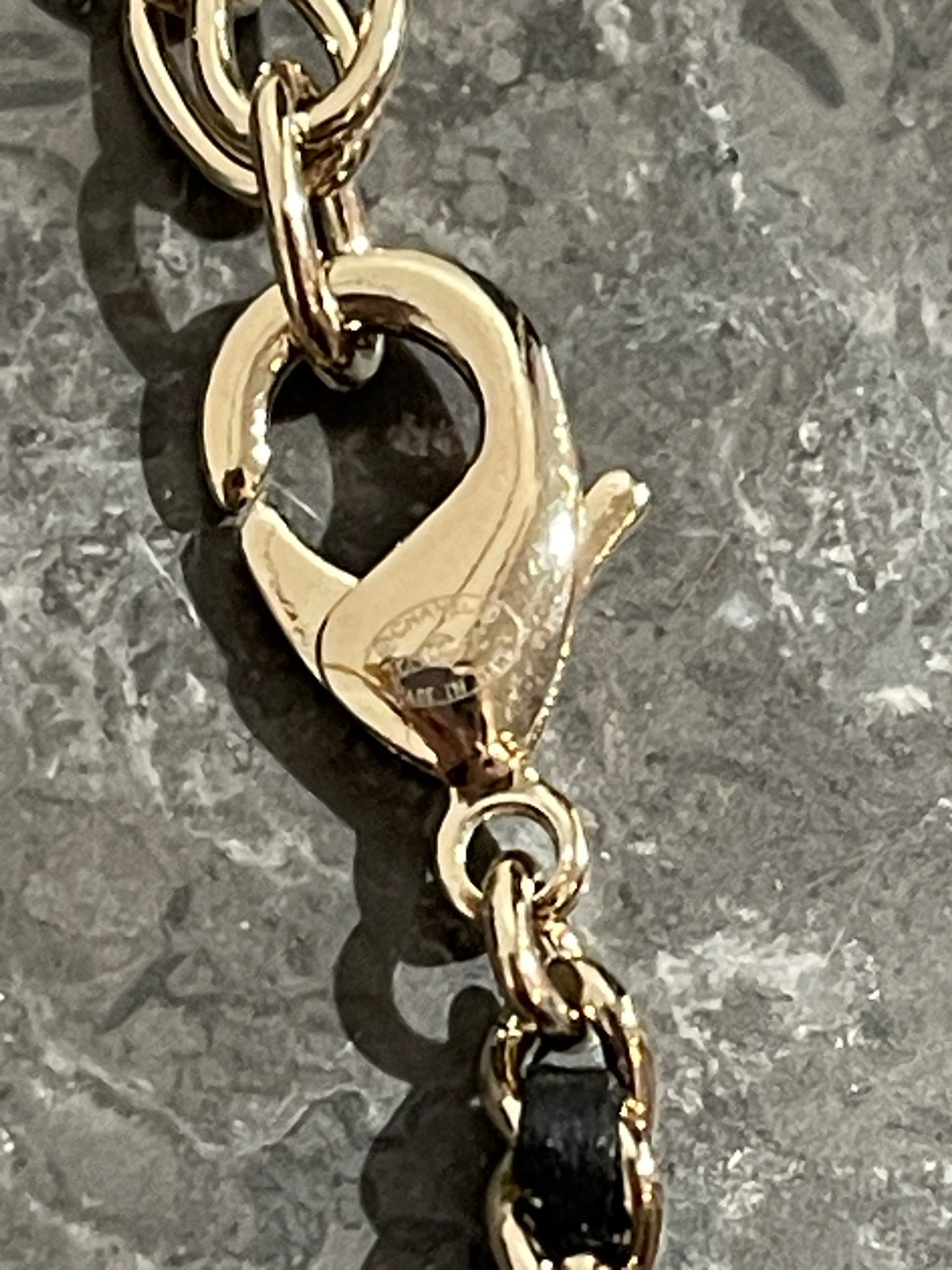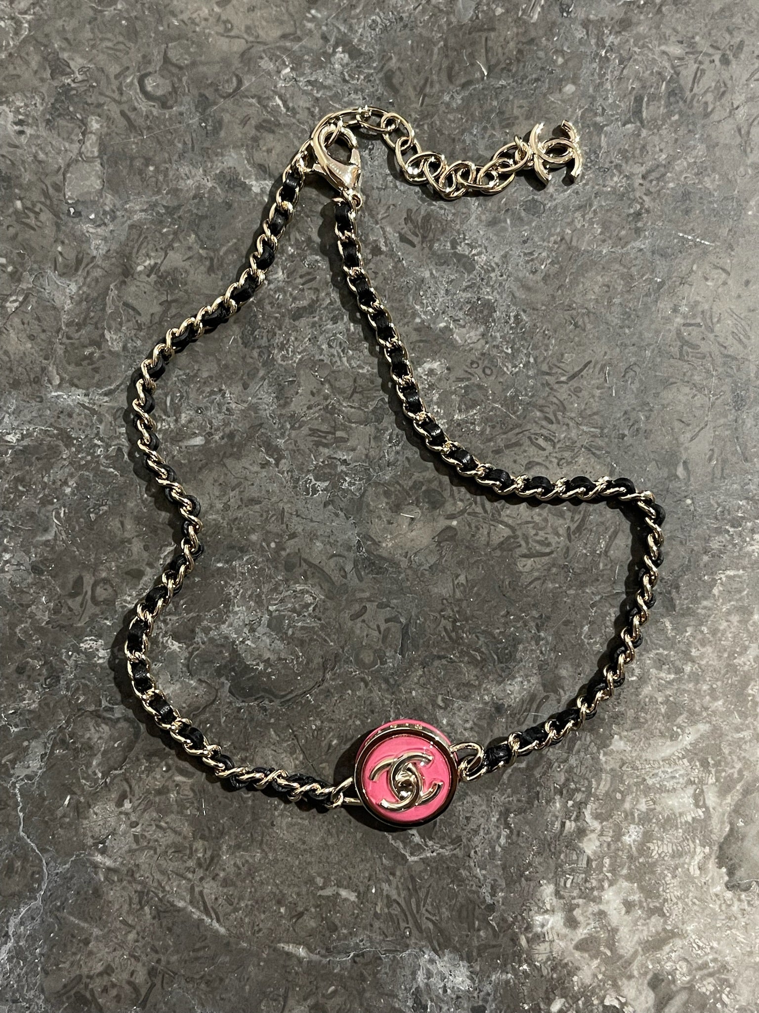 Collier ras de cou en chaine métal doré entrelacé de cuir noir orné d'un pendentif CC en résine rose. Fermoir mousqueton ajustable. Avec poinçon Chanel.
