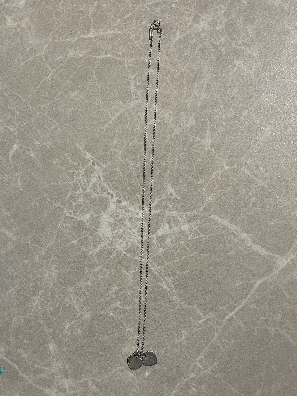 Collier en argent 925 avec pendentif double coeur. Un coeur signé Tiffany et un coeur recouvert d'une résine beige. Fermoir mousqueton.