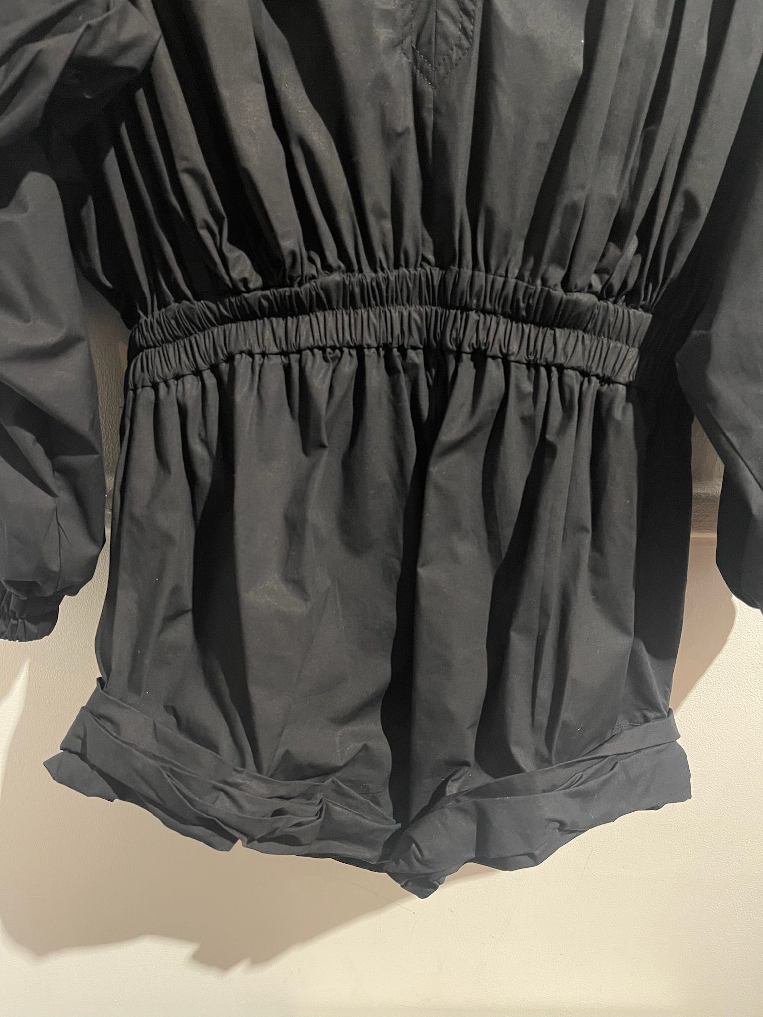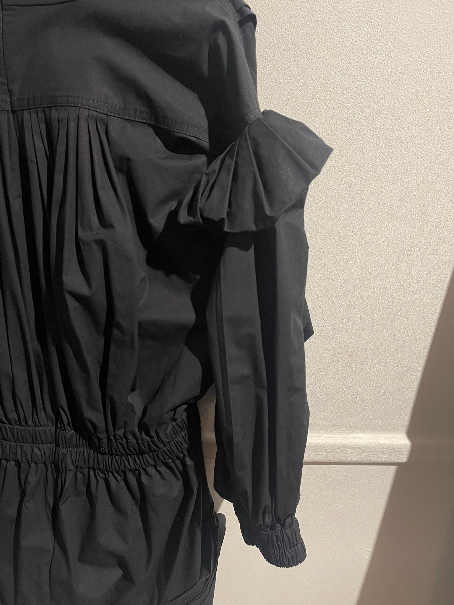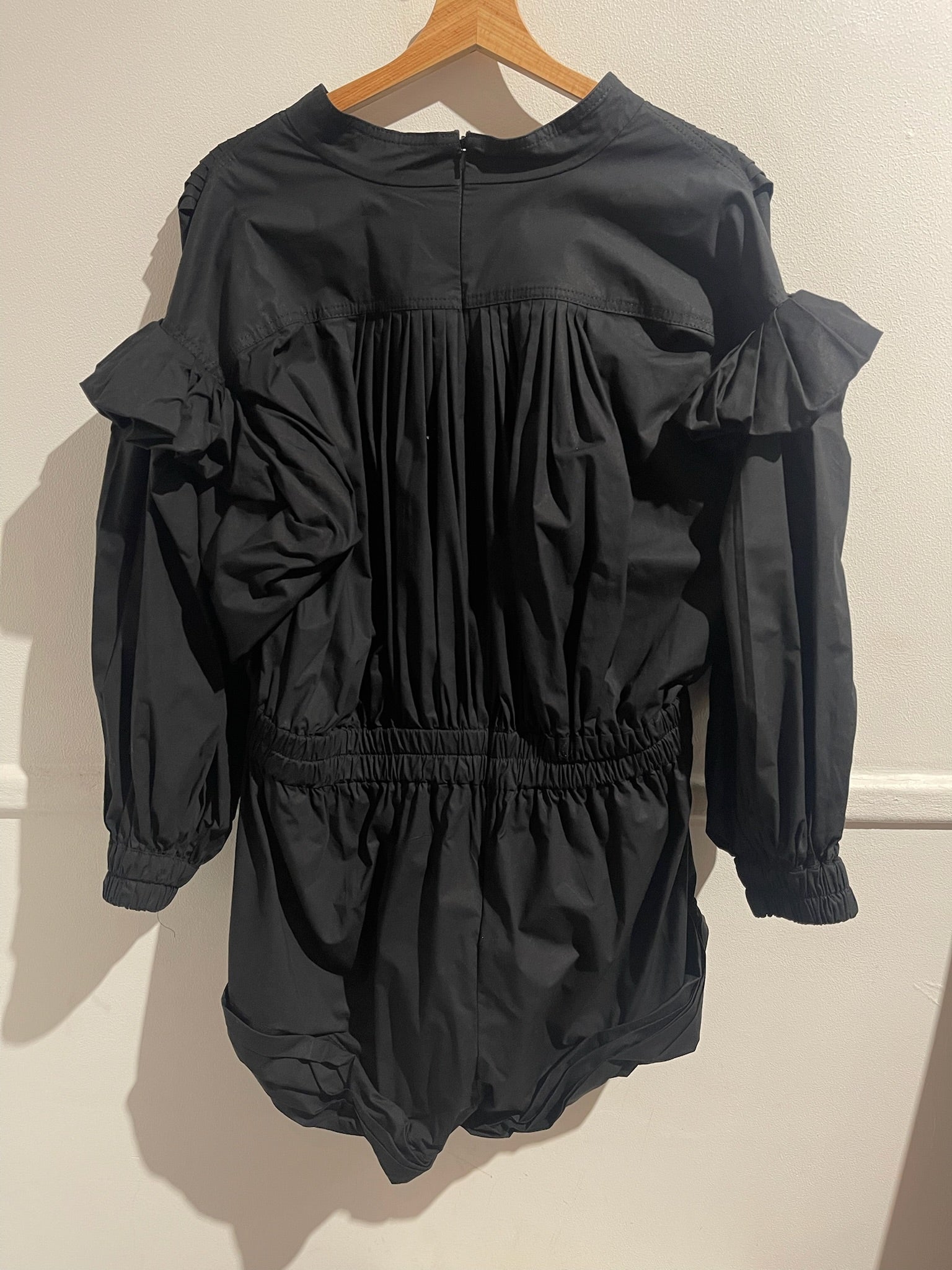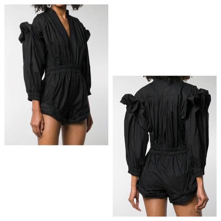 Combinaison short en coton noir plissée, détail volant bouffant sur les épaules. Col V, et fermeture zippée à l'arrière.