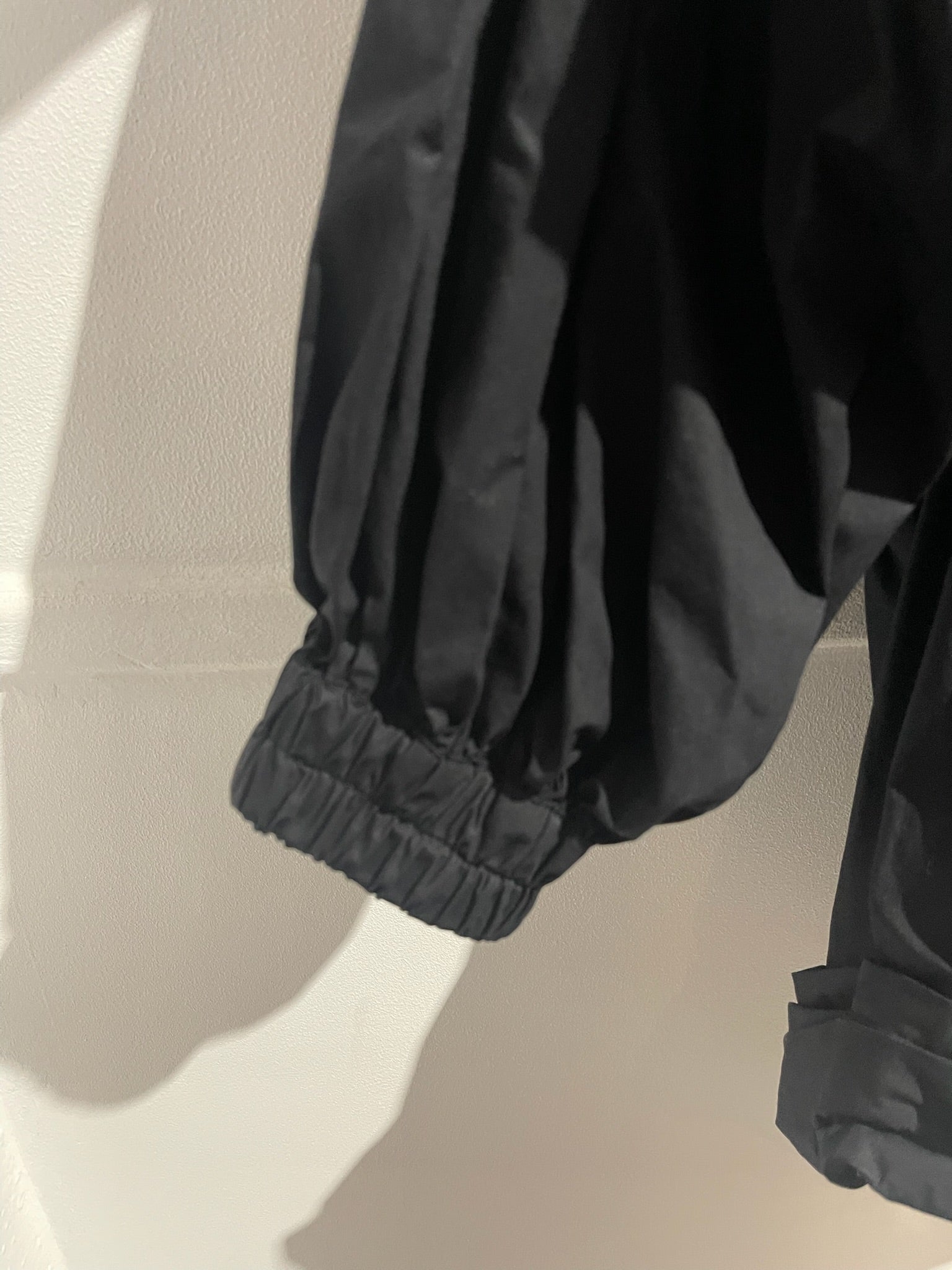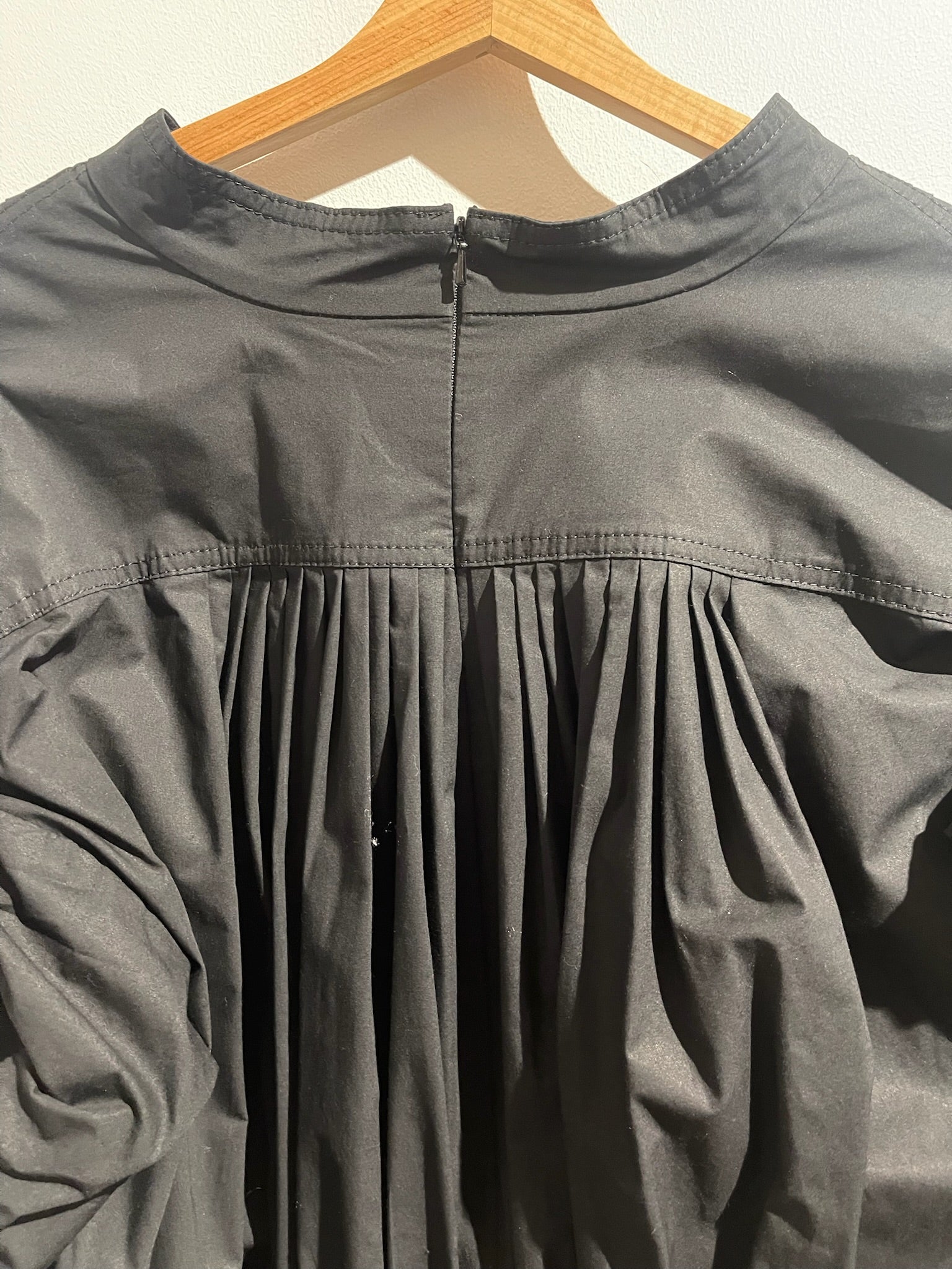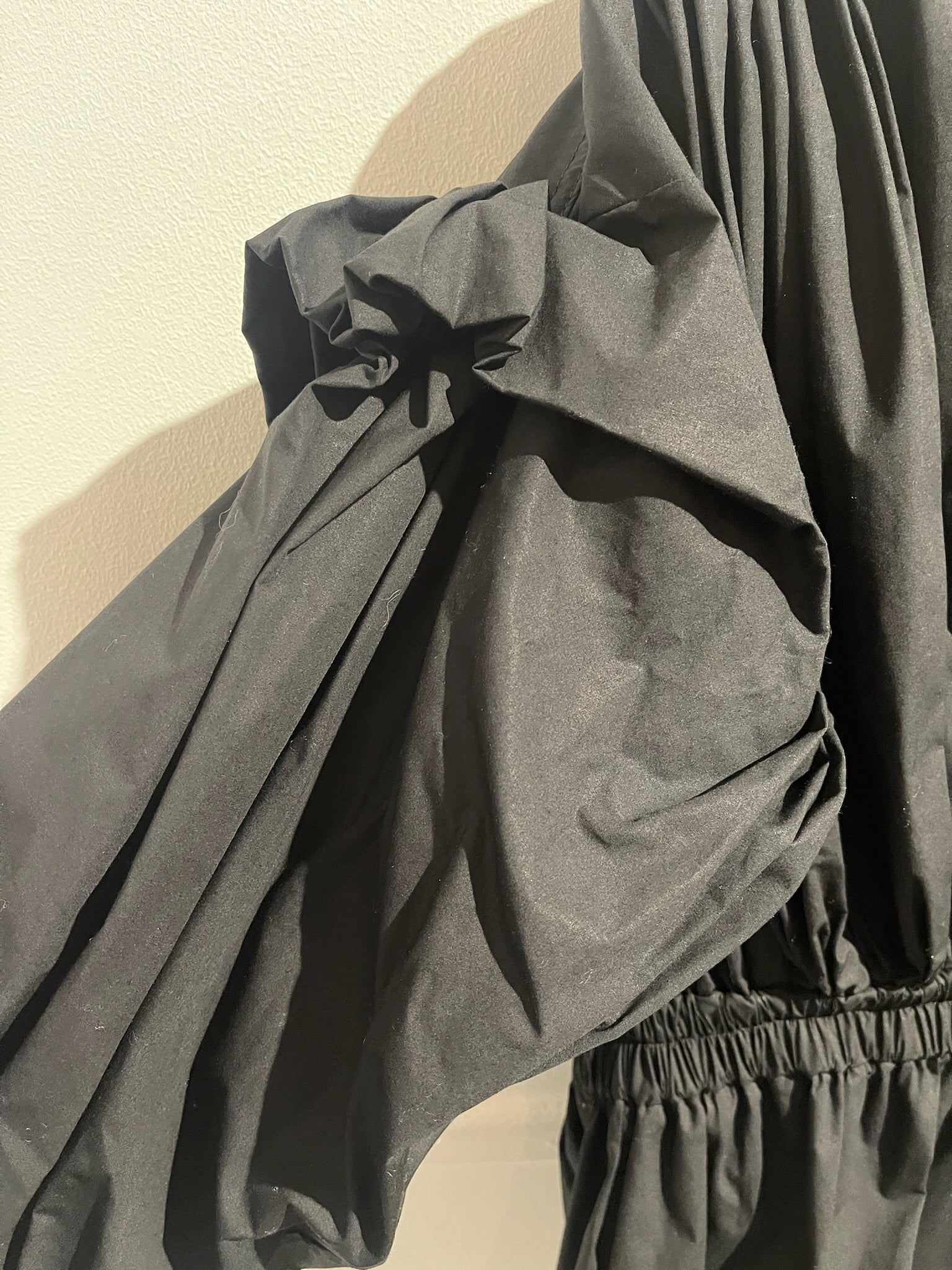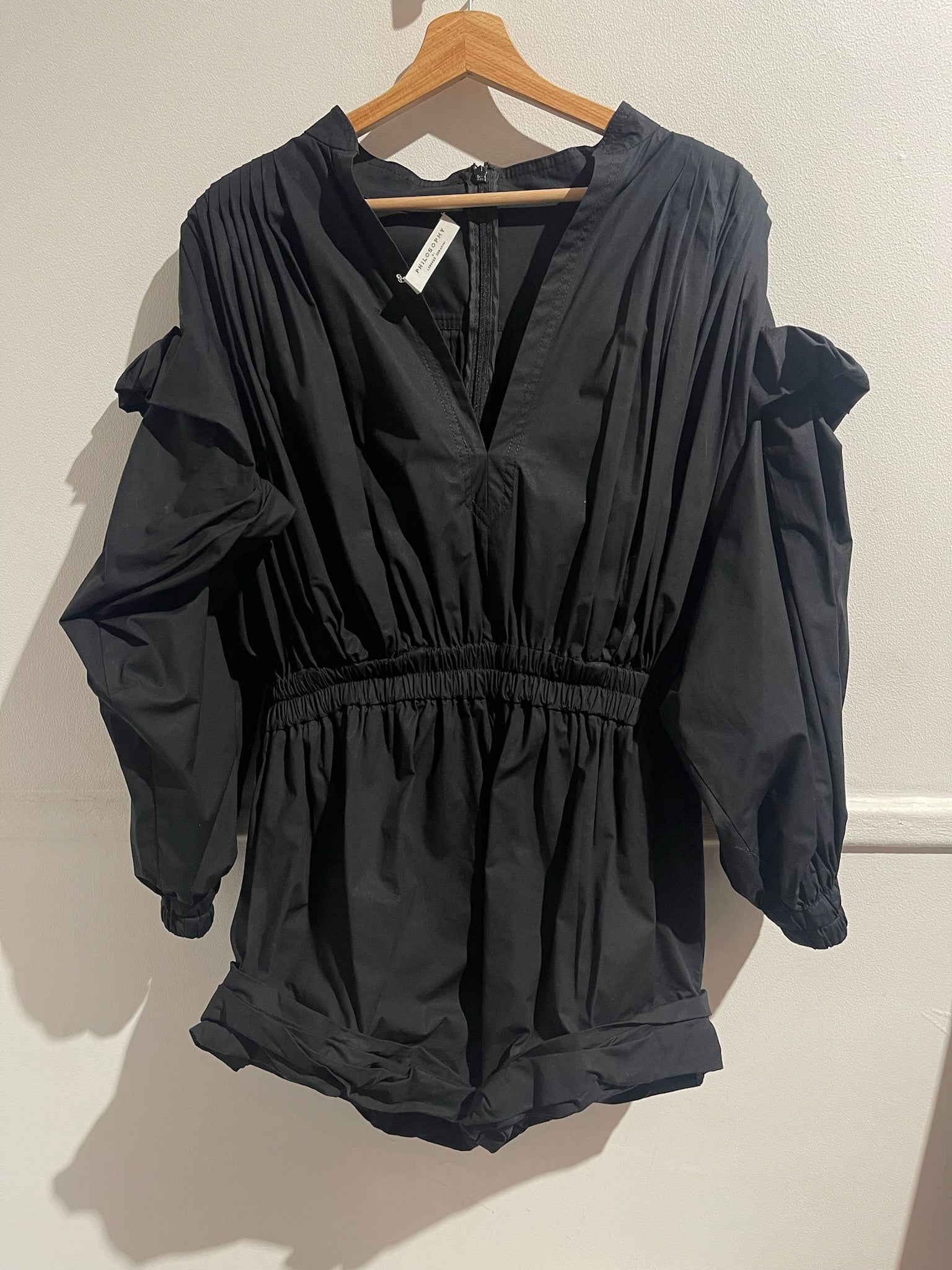 Combinaison short en coton noir plissée, détail volant bouffant sur les épaules. Col V, et fermeture zippée à l'arrière.