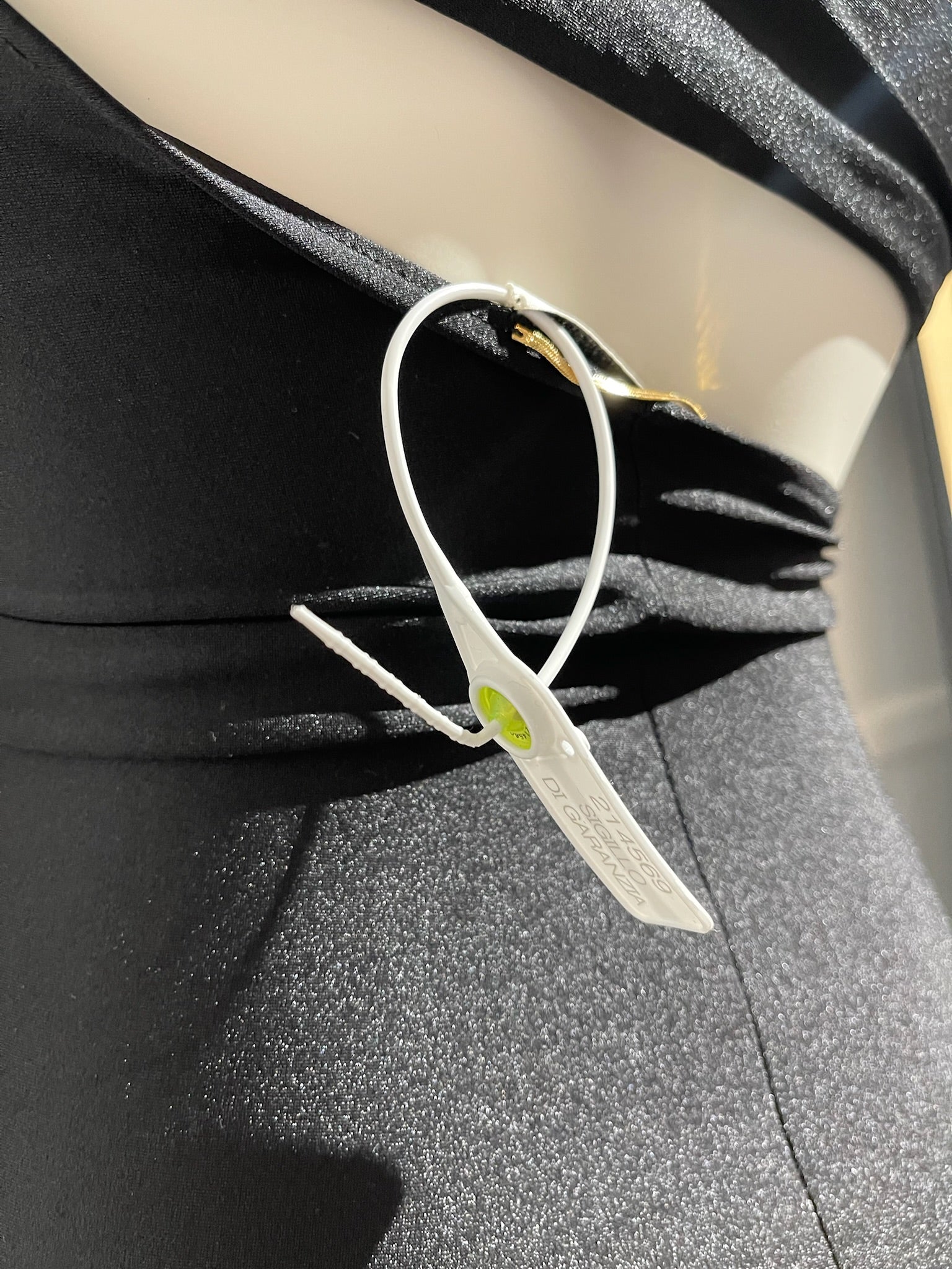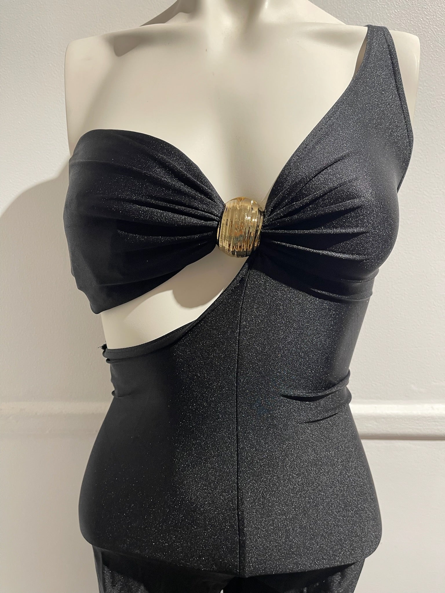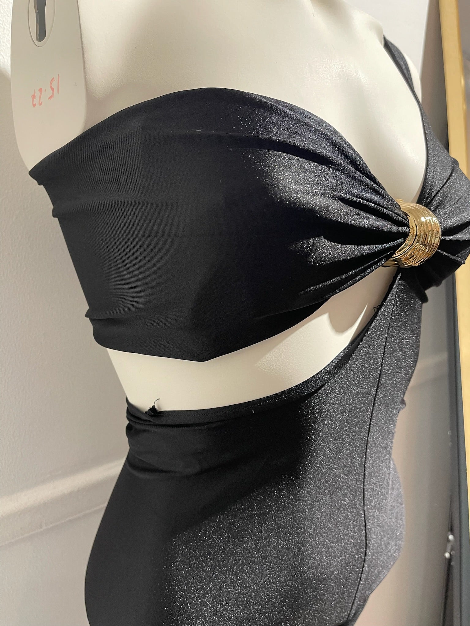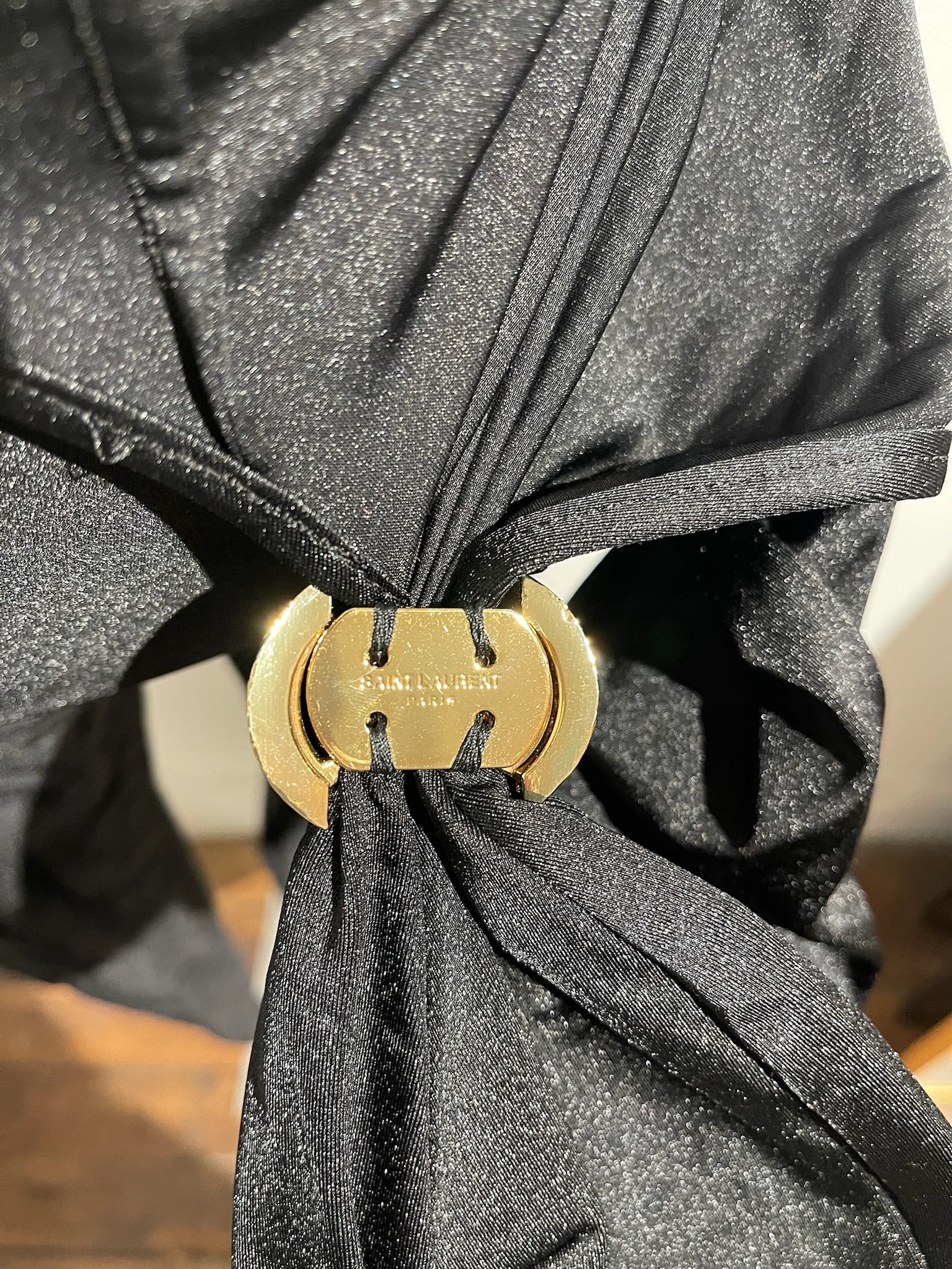Combinaison en tissu stretch noir avec décolleté asymétrique et anneau doré à la poitrine signé Saint Laurent. Dos ouvert. Coupe près du corps.