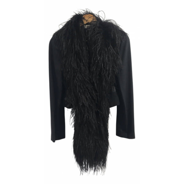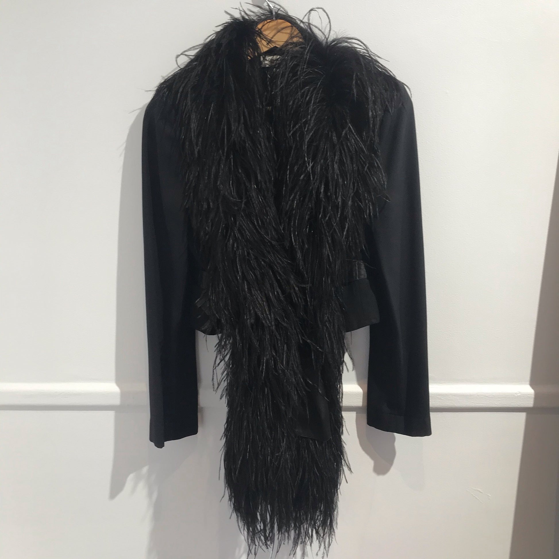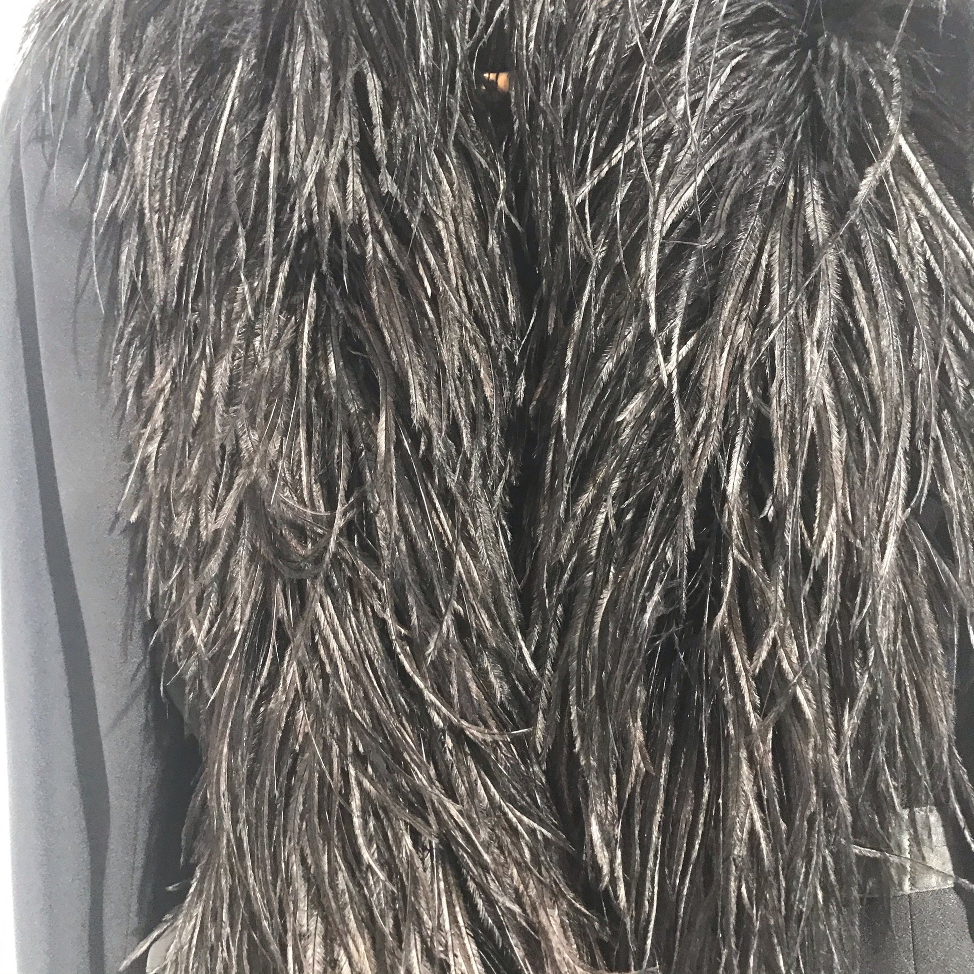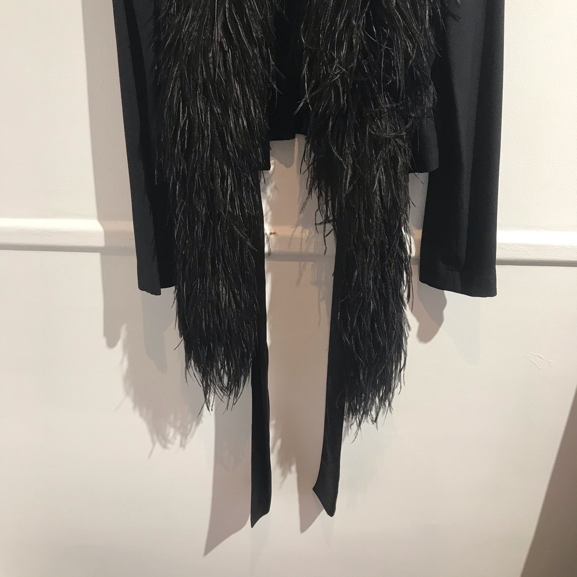 Très jolie veste en tissu noir et col en plume d'Autruche. Fermeture à liens à nouer.