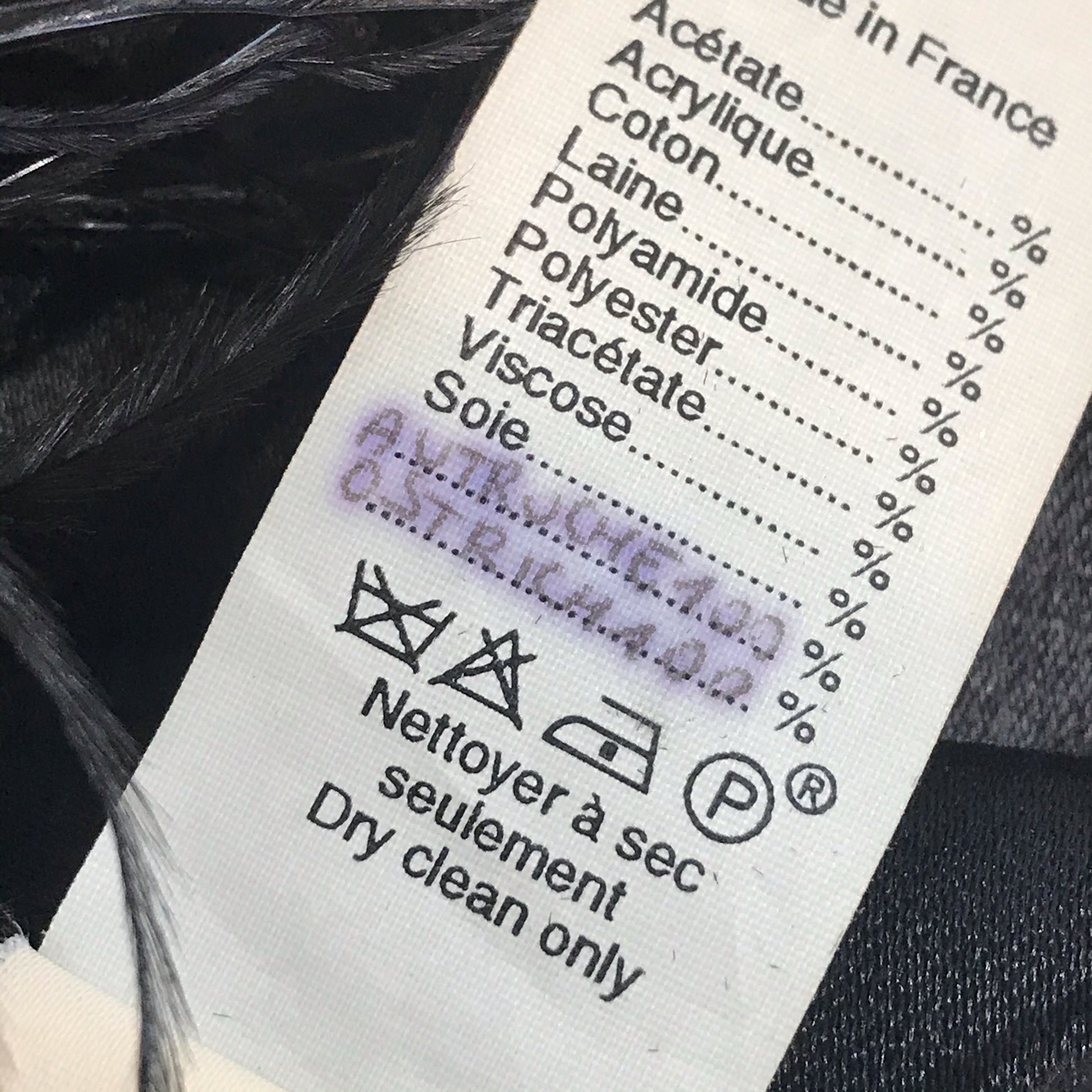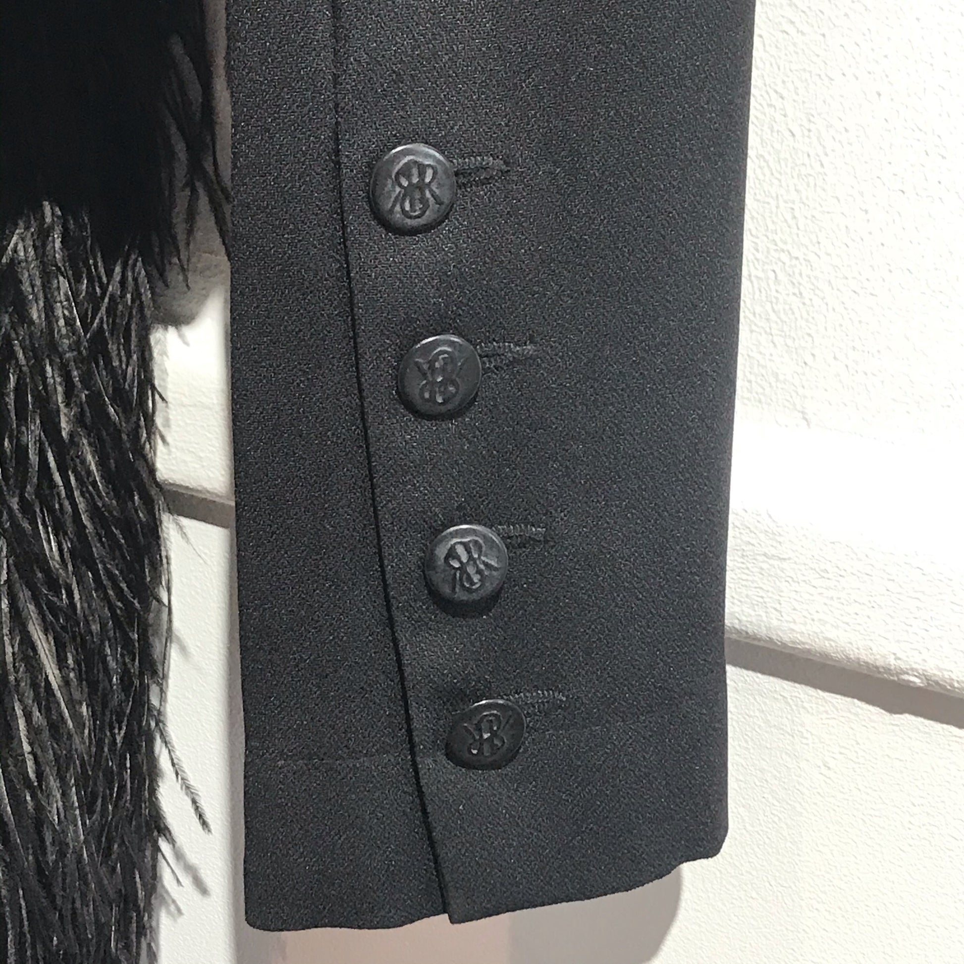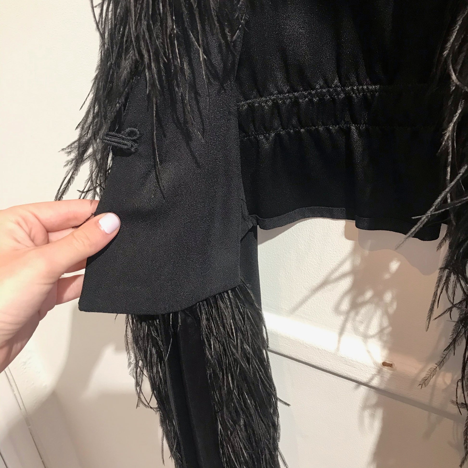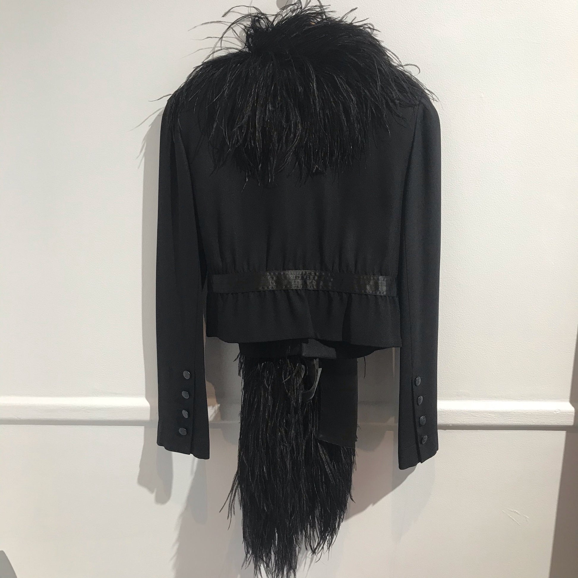 Très jolie veste en tissu noir et col en plume d'Autruche. Fermeture à liens à nouer.