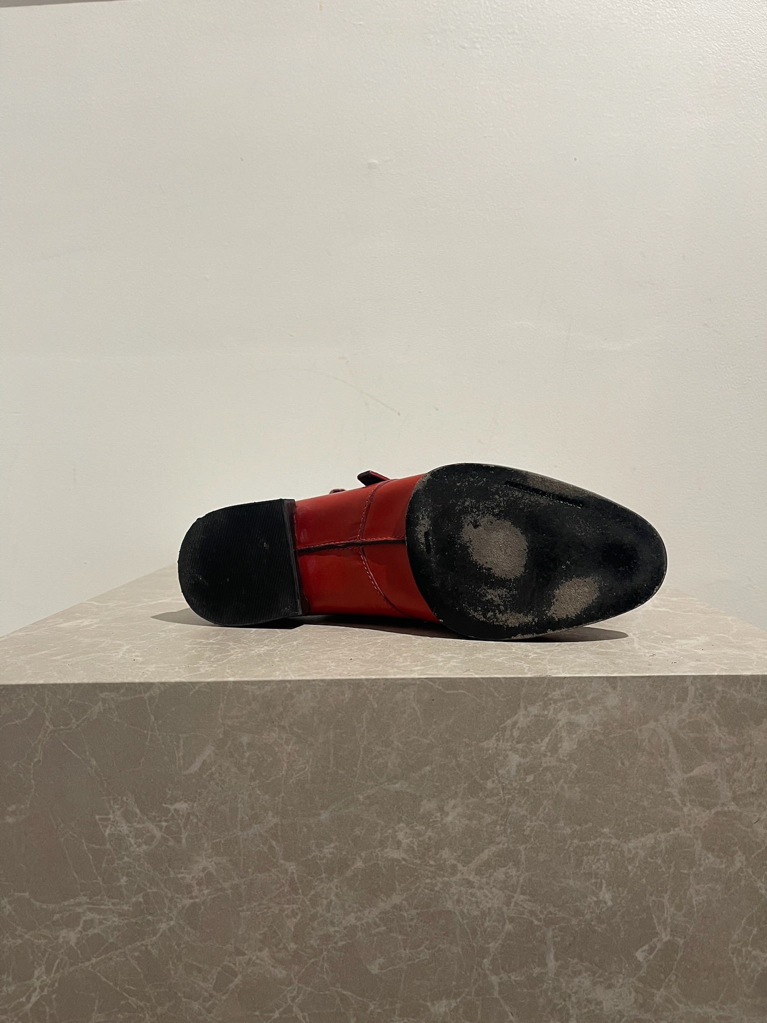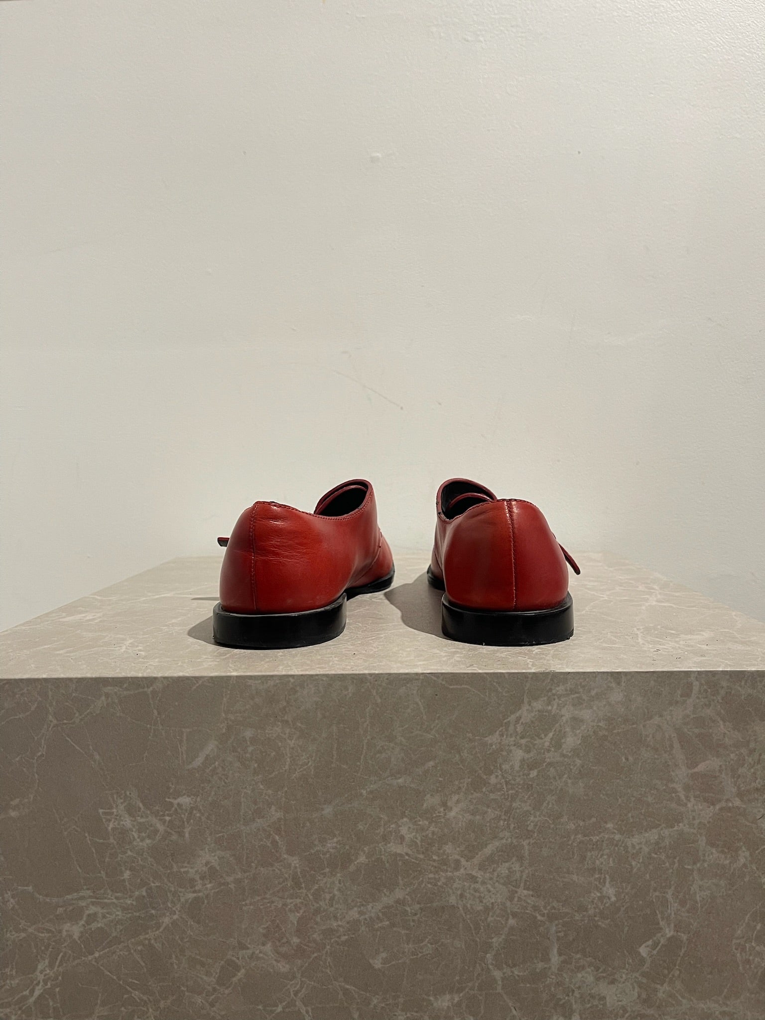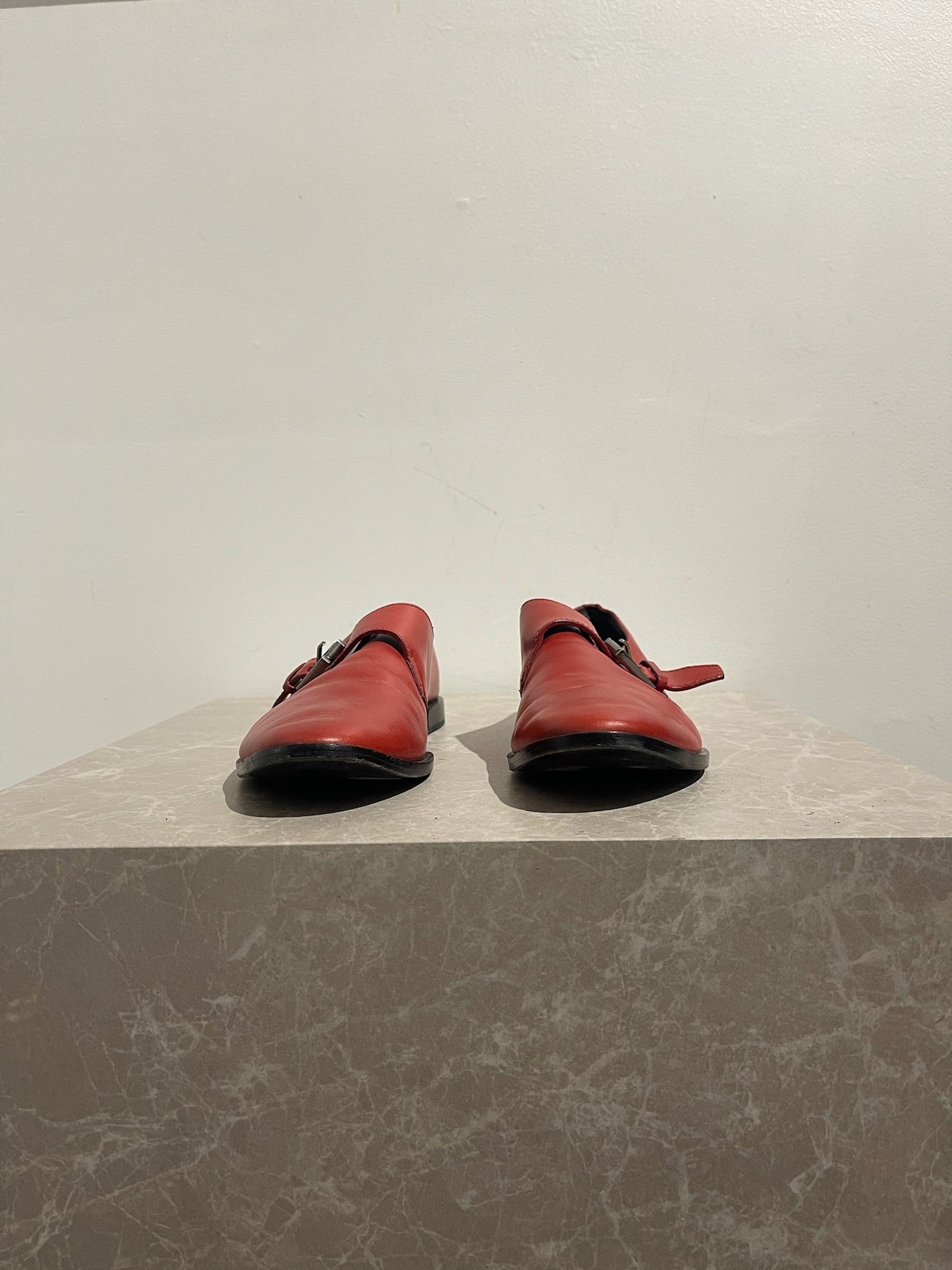 Derbies en cuir rouge avec boucle ajustable sur le côté.