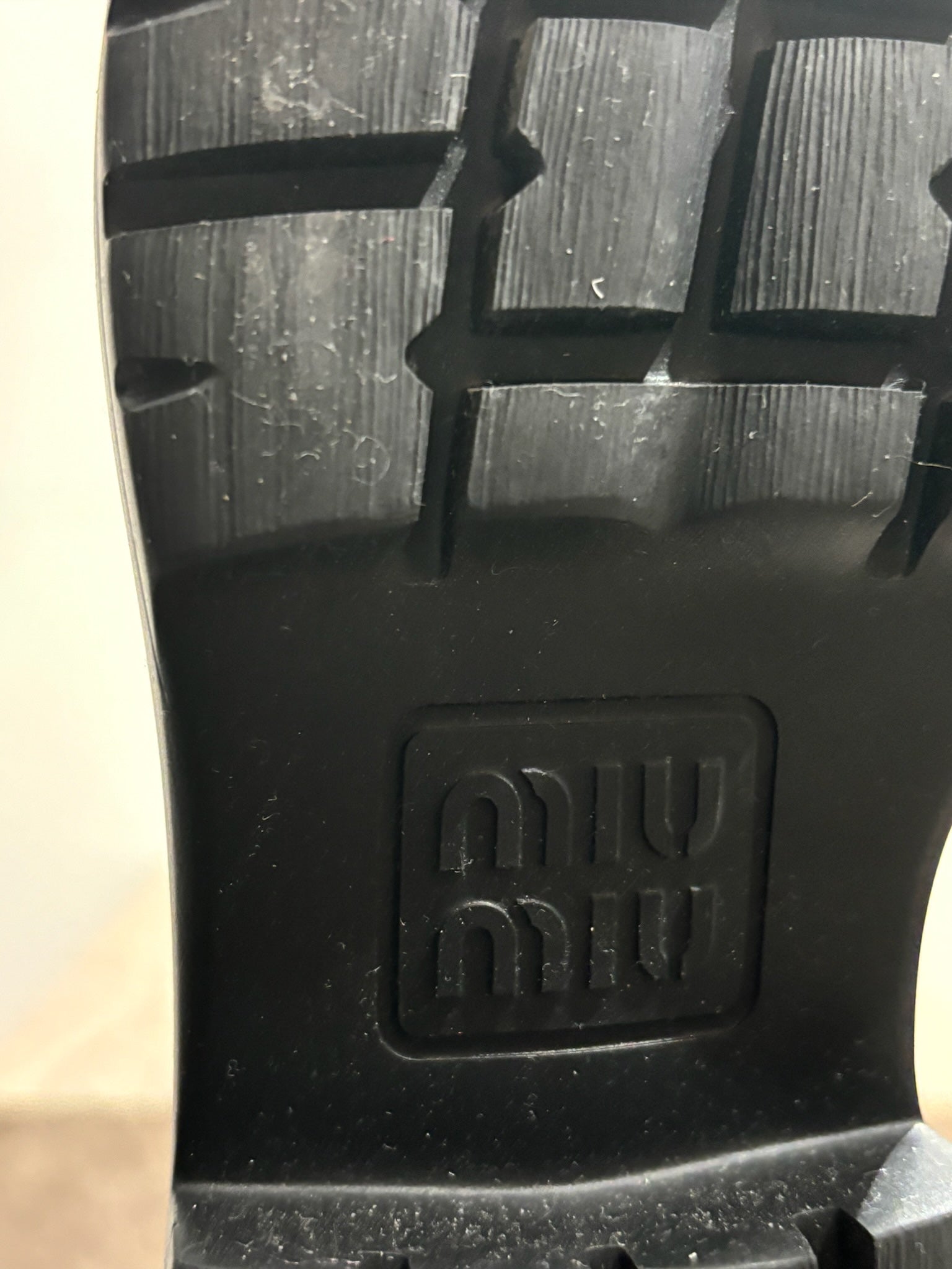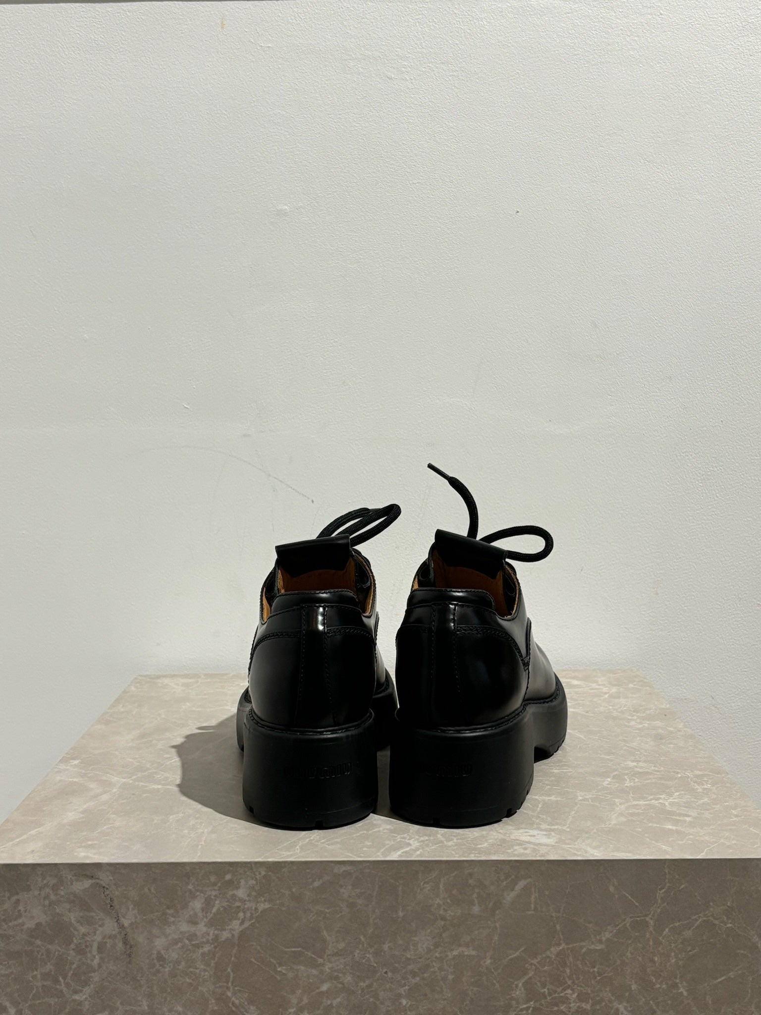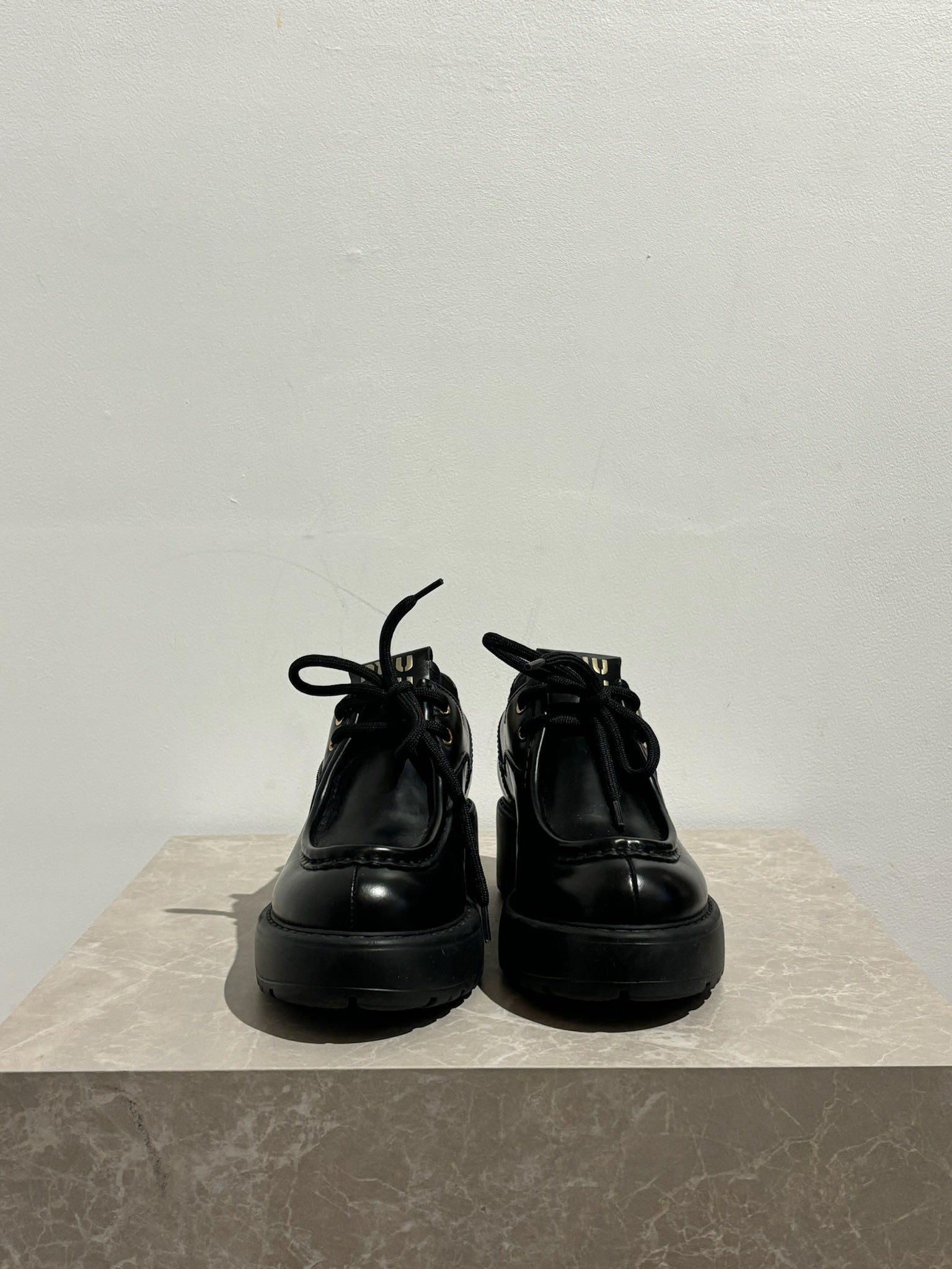 Chaussures à lacets en cuir noir signé Miu Miu sur la languette avant. Semelles en gomme noir signé Miu Miu au dos.