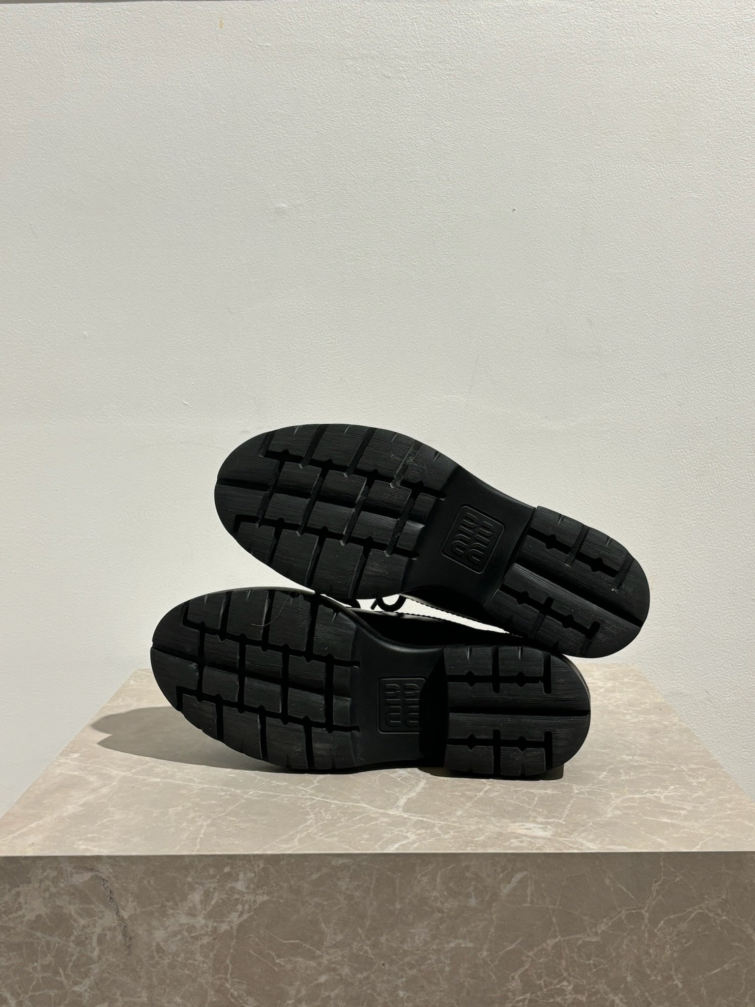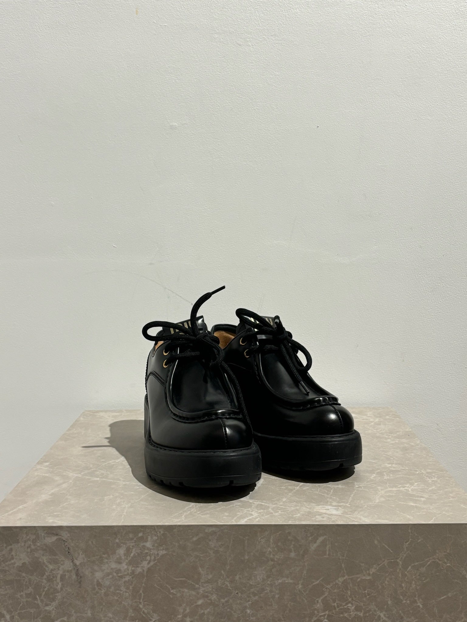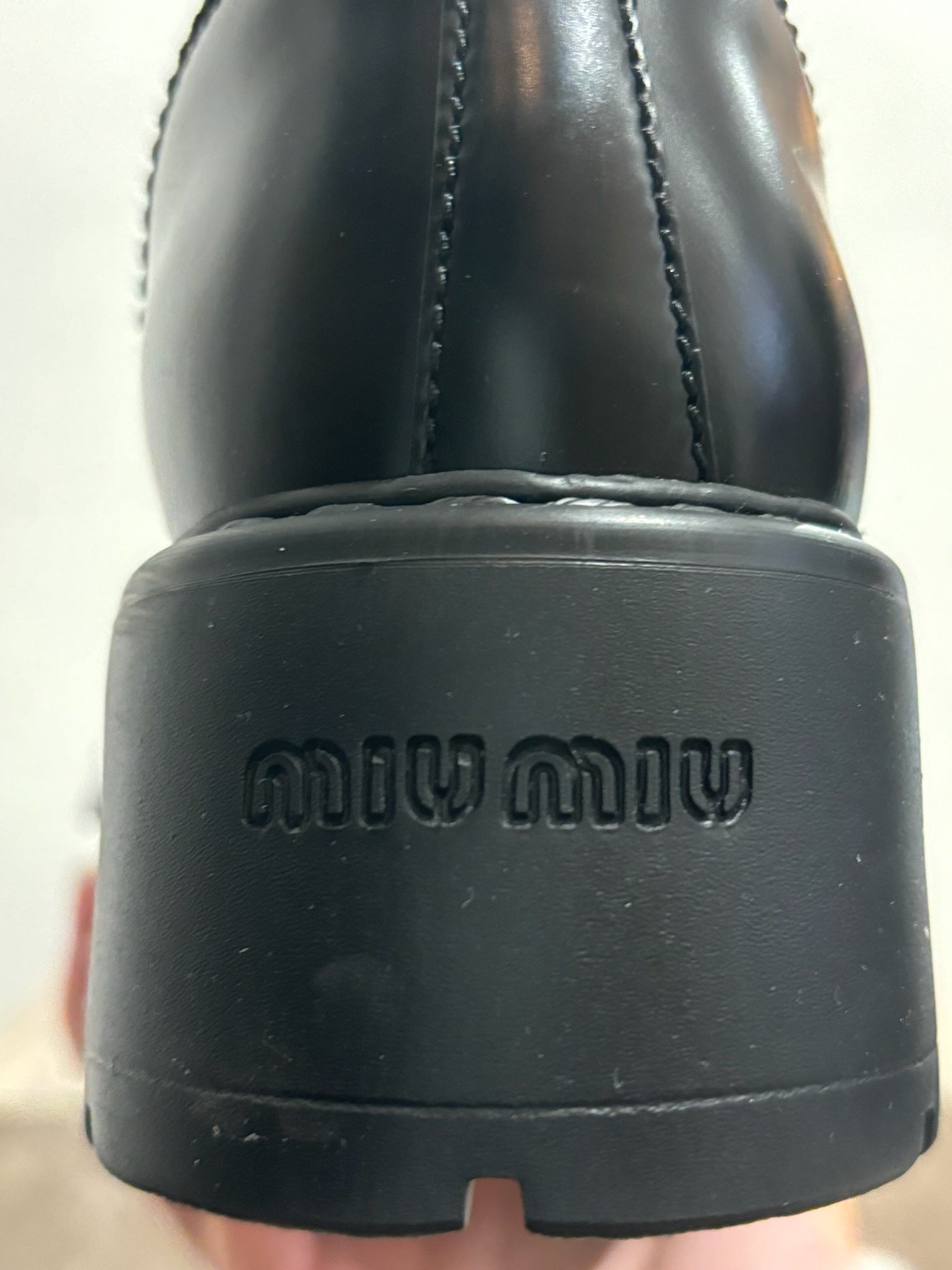 Chaussures à lacets en cuir noir signé Miu Miu sur la languette avant. Semelles en gomme noir signé Miu Miu au dos.