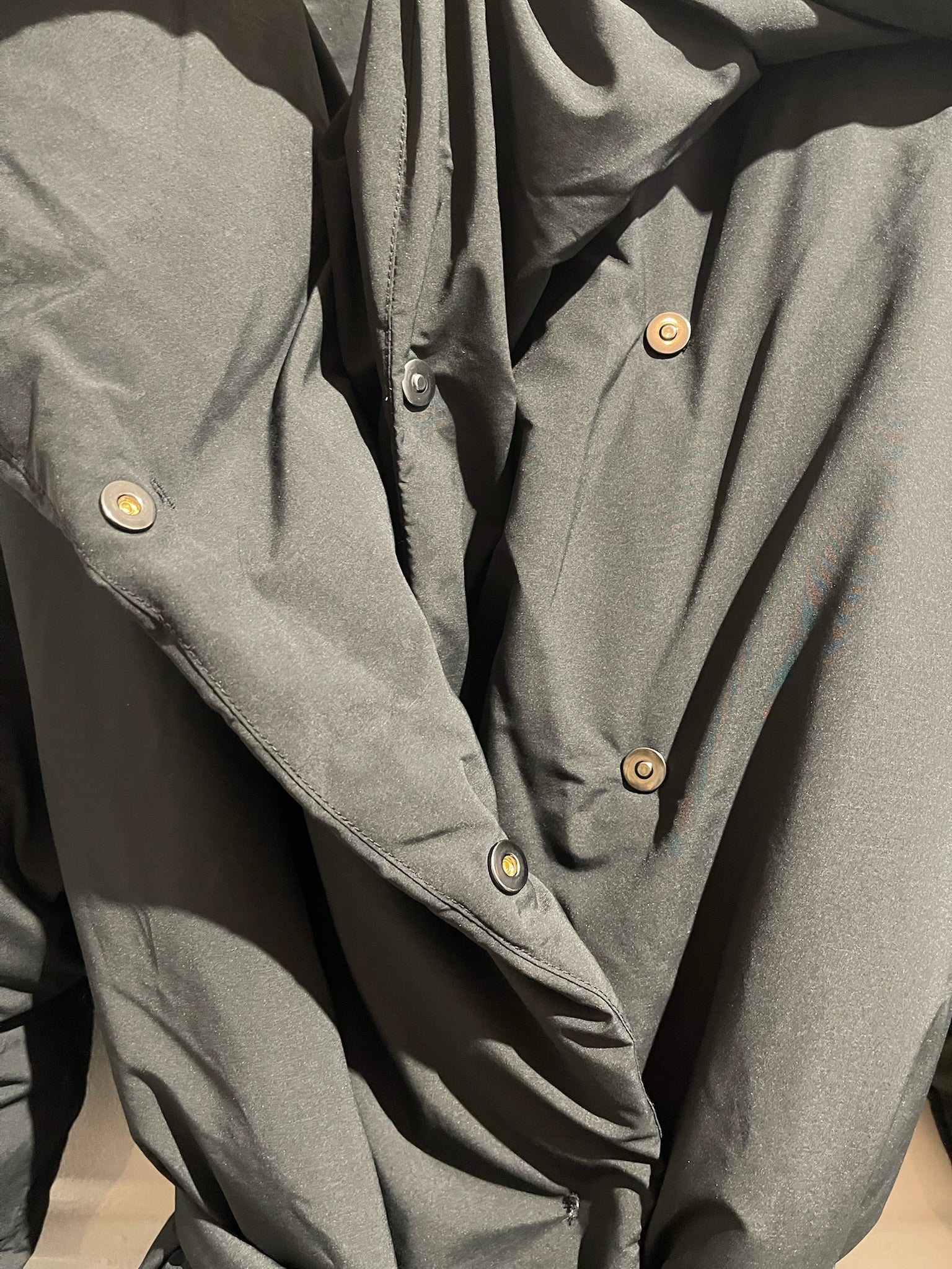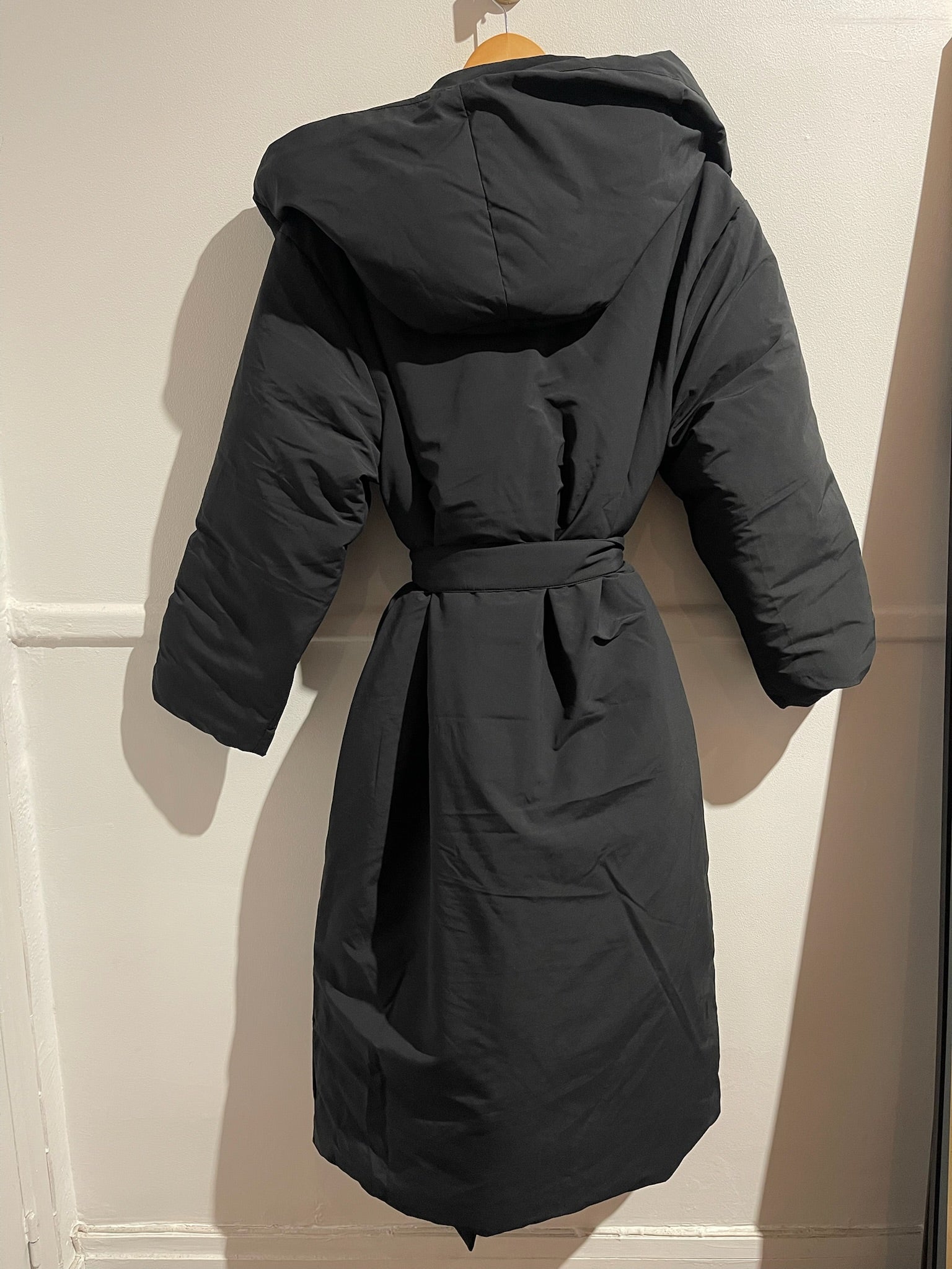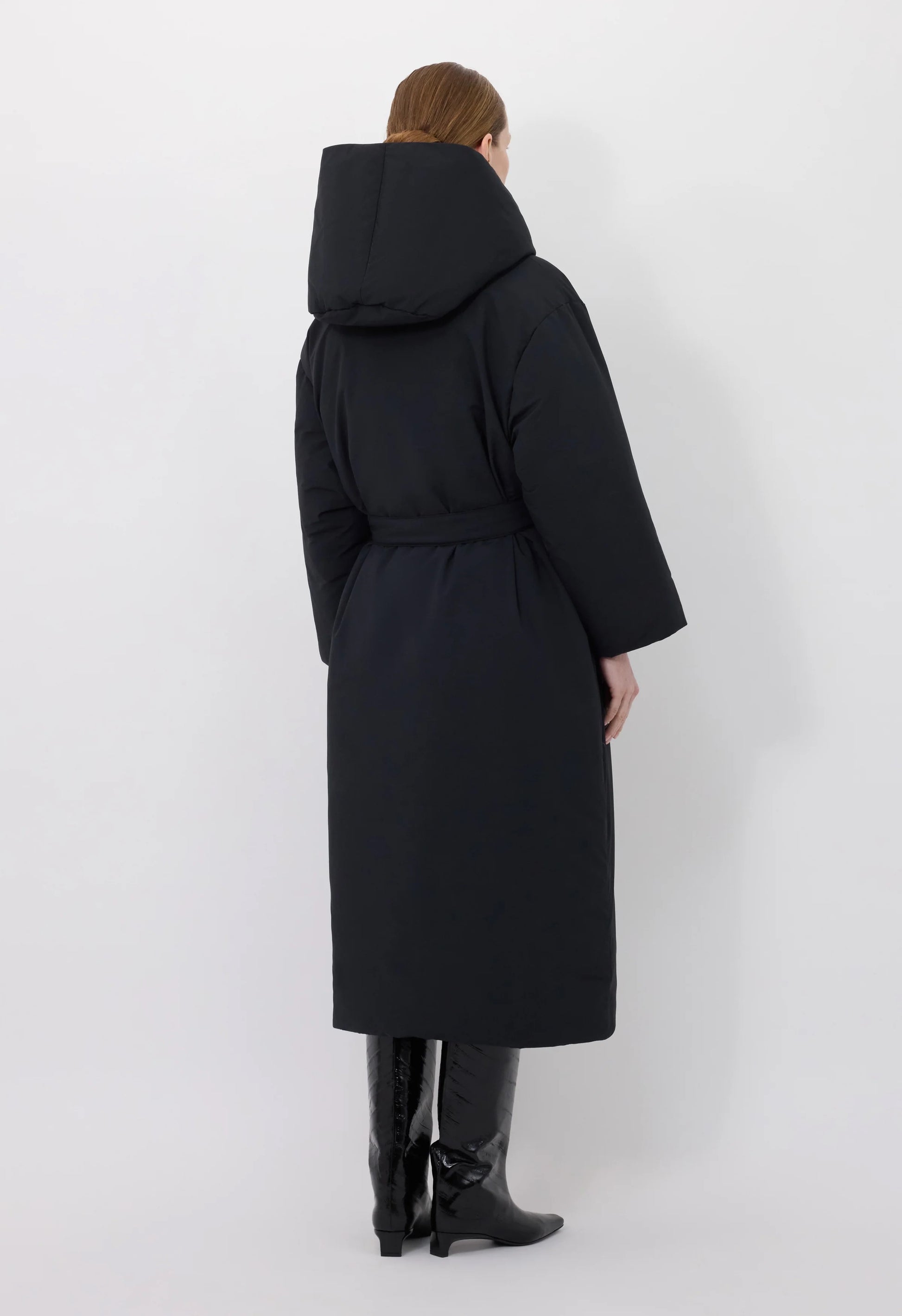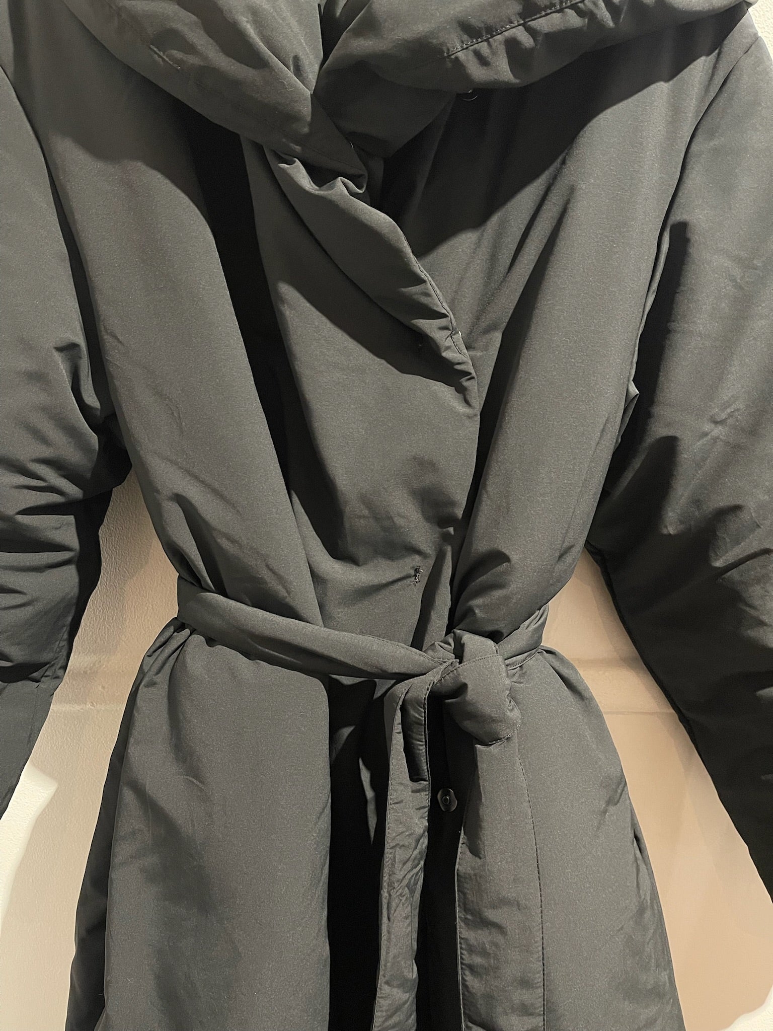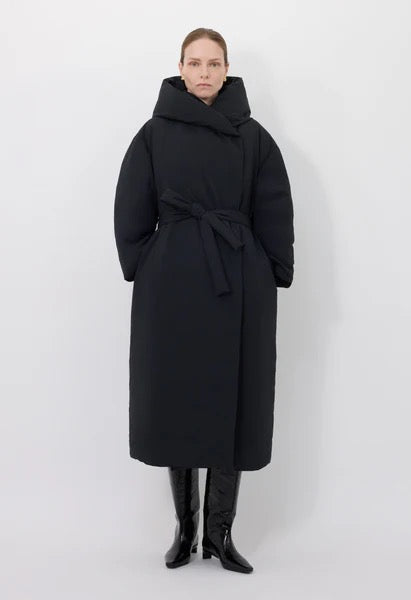 Doudoune en polyamide noir avec intérieur en plume et duvet de canard. Capuche et ceinture à nouer à la taille. Couple oversize.