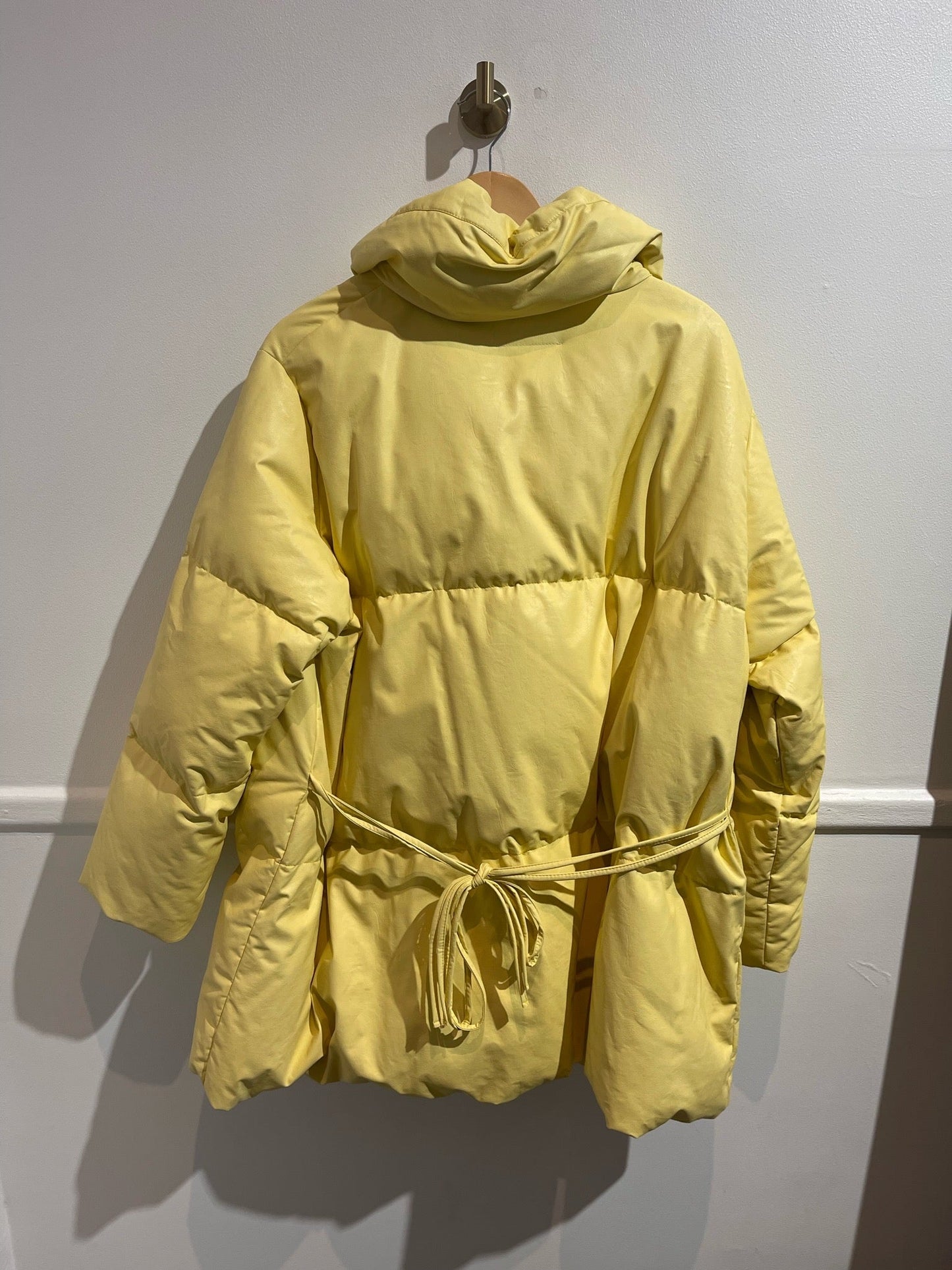 Doudoune en simili cuir jaune. Fermeture zippée et boutons pression sur le devant. Grosses poches plaquées sur le devant. Ceinture fine en cuir amovible à nouer au dos. Coupe oversize.