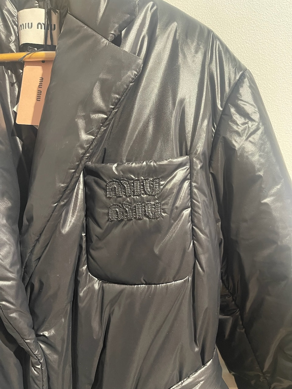 Doudoune en nylon noir avec logo Miu Miu brodé à la poitrine, fermeture boutonnée et taille ceinturée. Poches latérales.