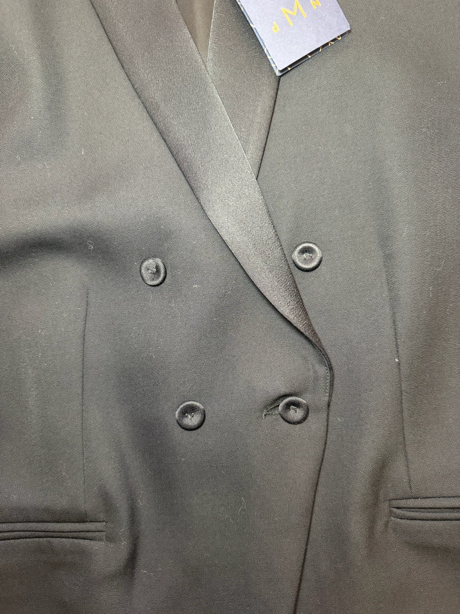 Ensemble de costume en laine noire. Veste de blazer avec fermeture boutonnée et croisée. Coupe ajustée. Pantalon assortie avec poches latérales et poches arrière. Coupe droite.