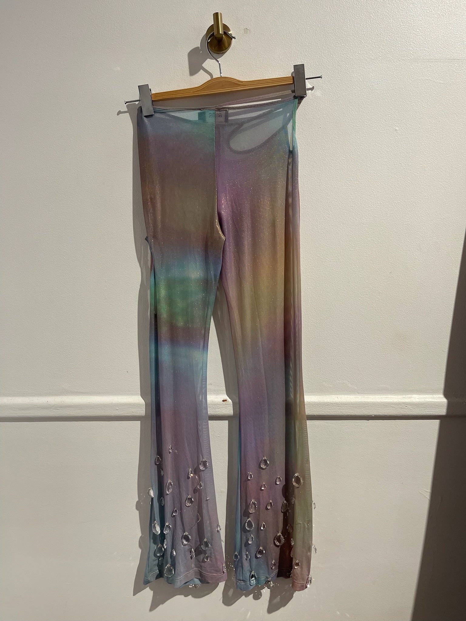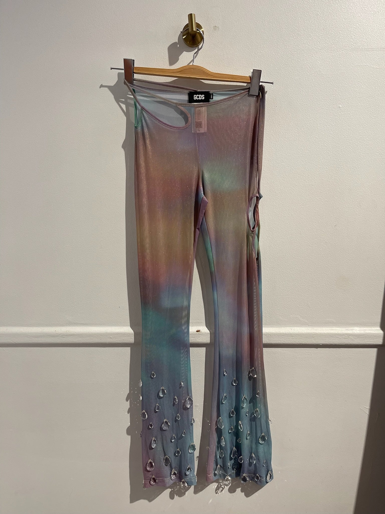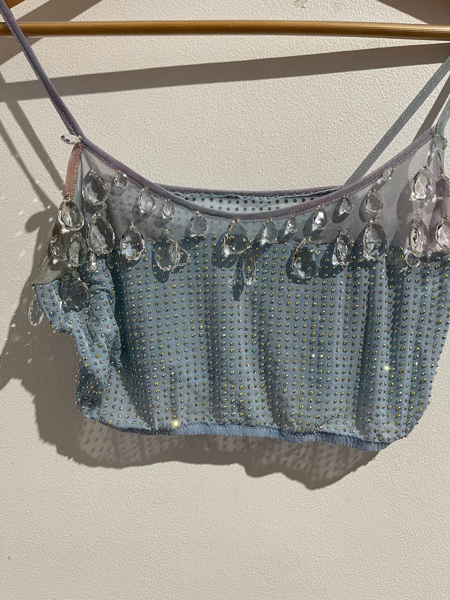 Top à bretelle à strass et cristaux autour du col. Pantalon ajouré et cristaux sur les bas des jambes.