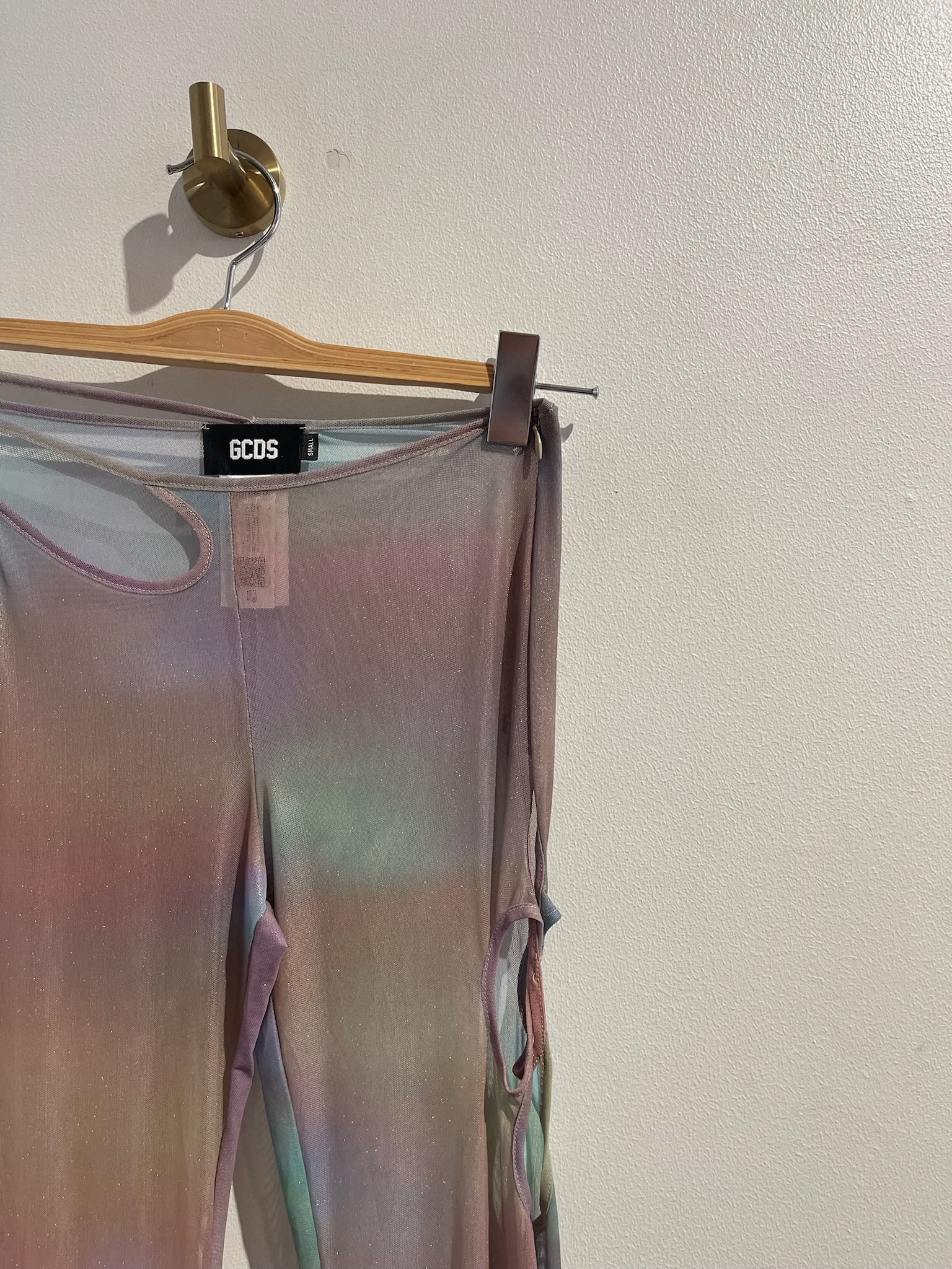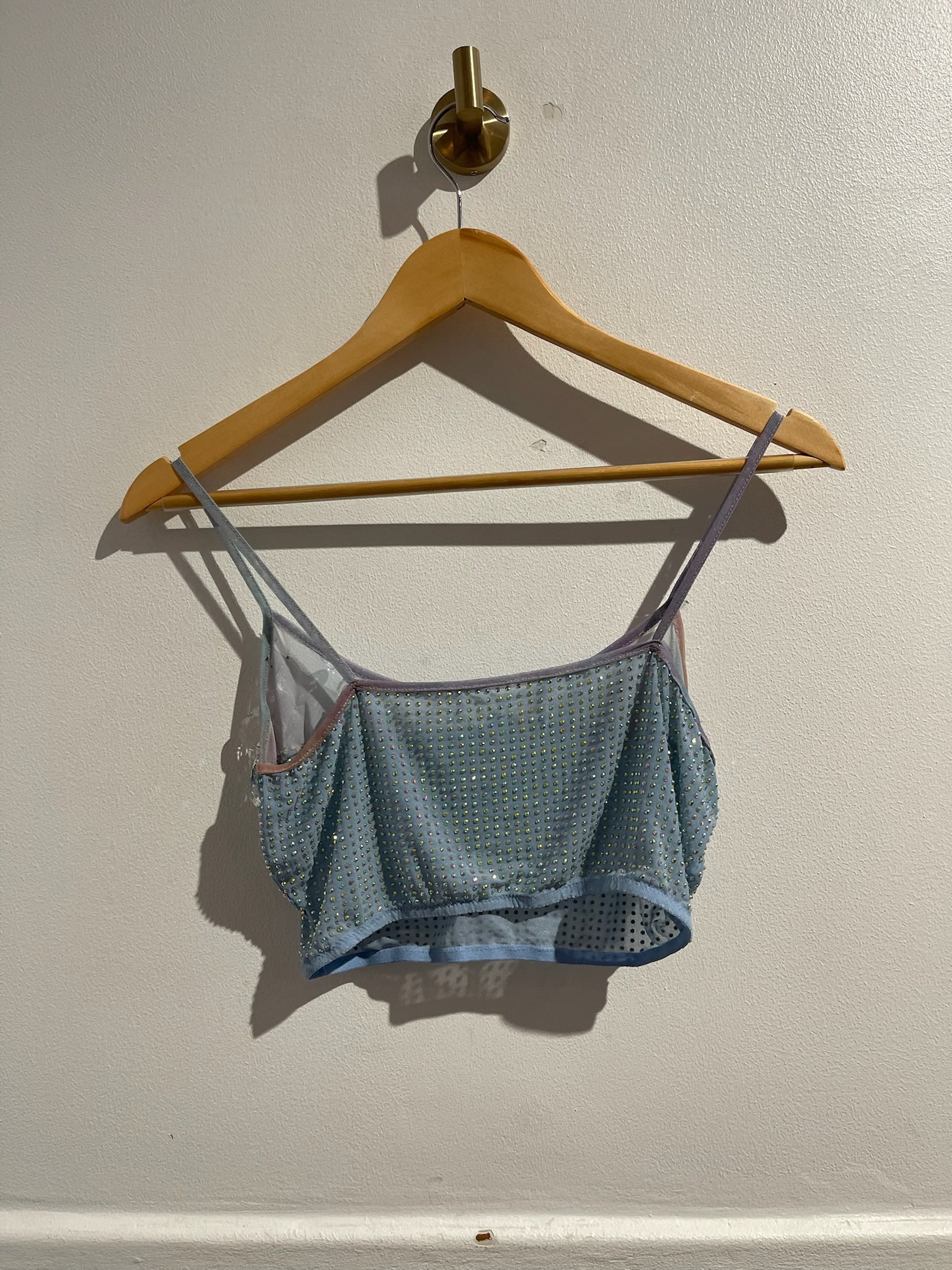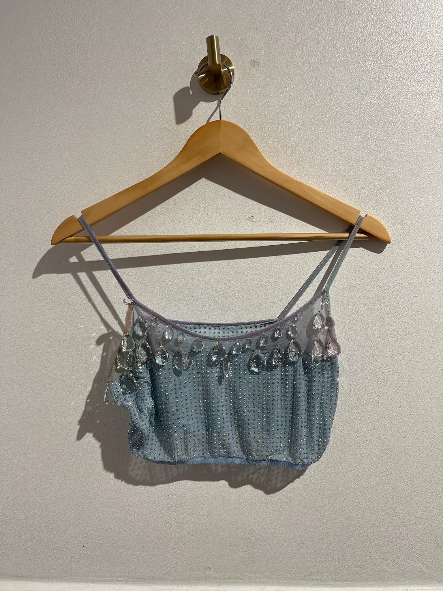 Top à bretelle à strass et cristaux autour du col. Pantalon ajouré et cristaux sur les bas des jambes.