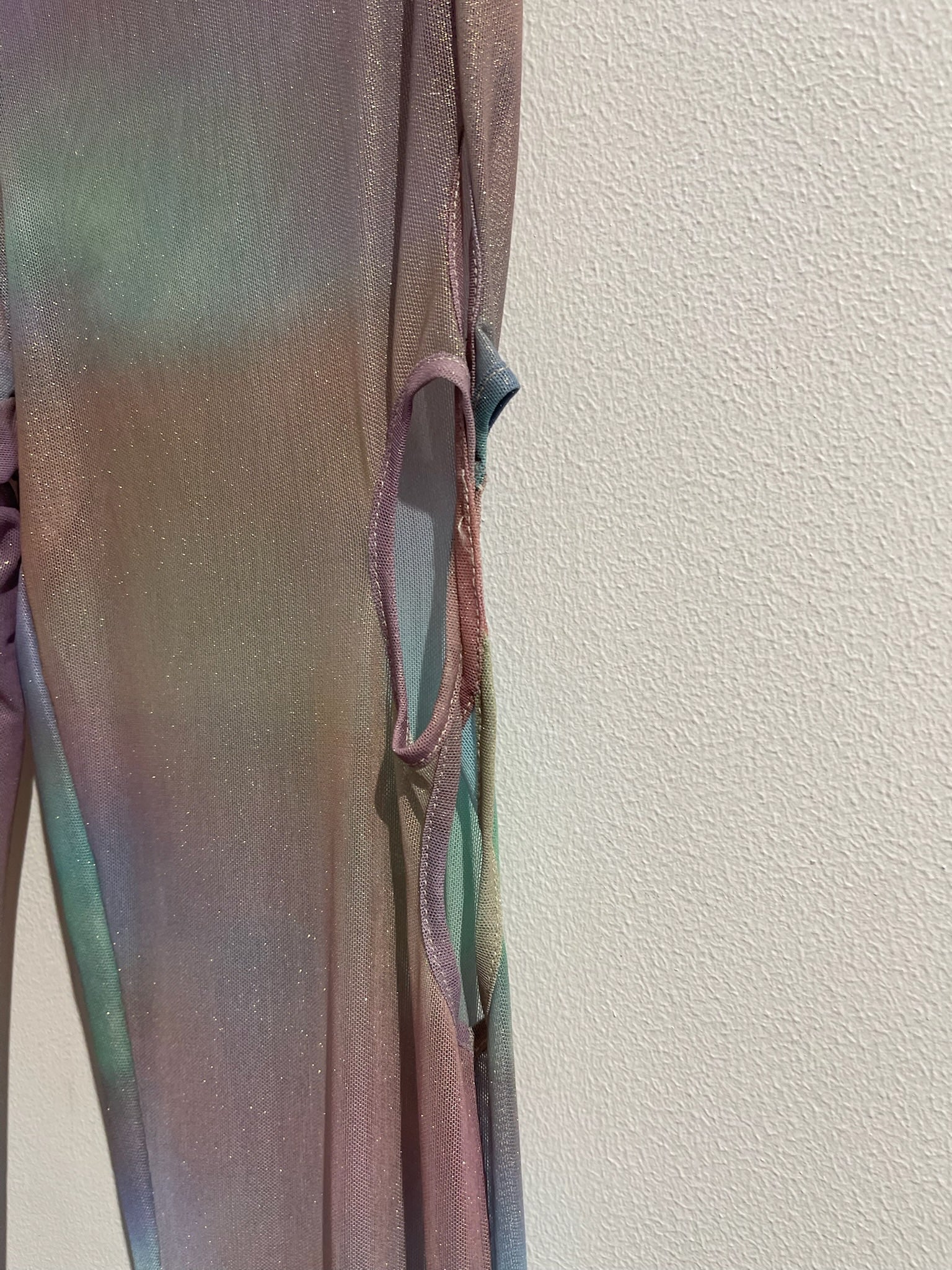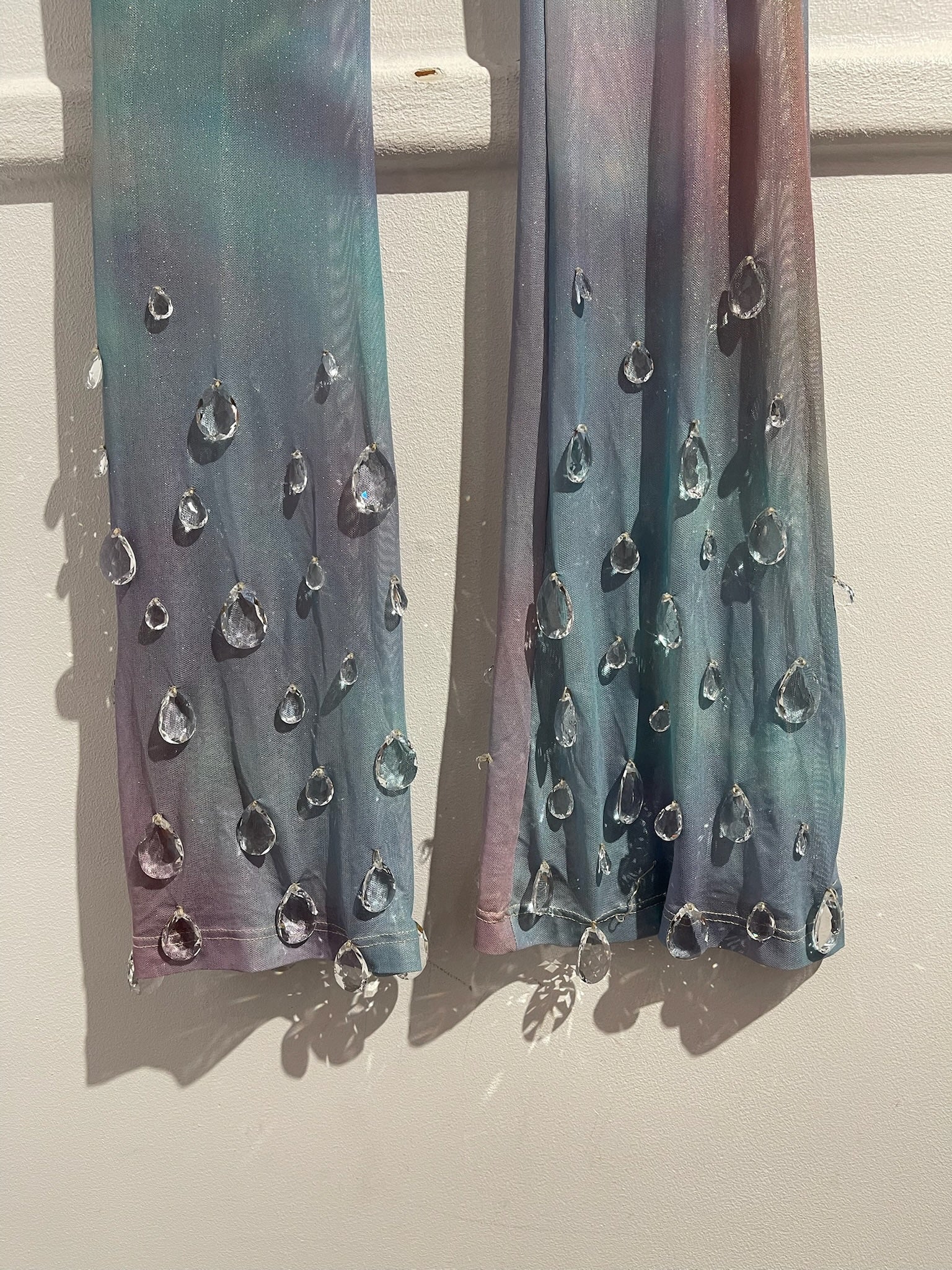 Ensemble en polyester imprimé tie & dye multicolore dans les tons bleu et rose. Tissu transparent.