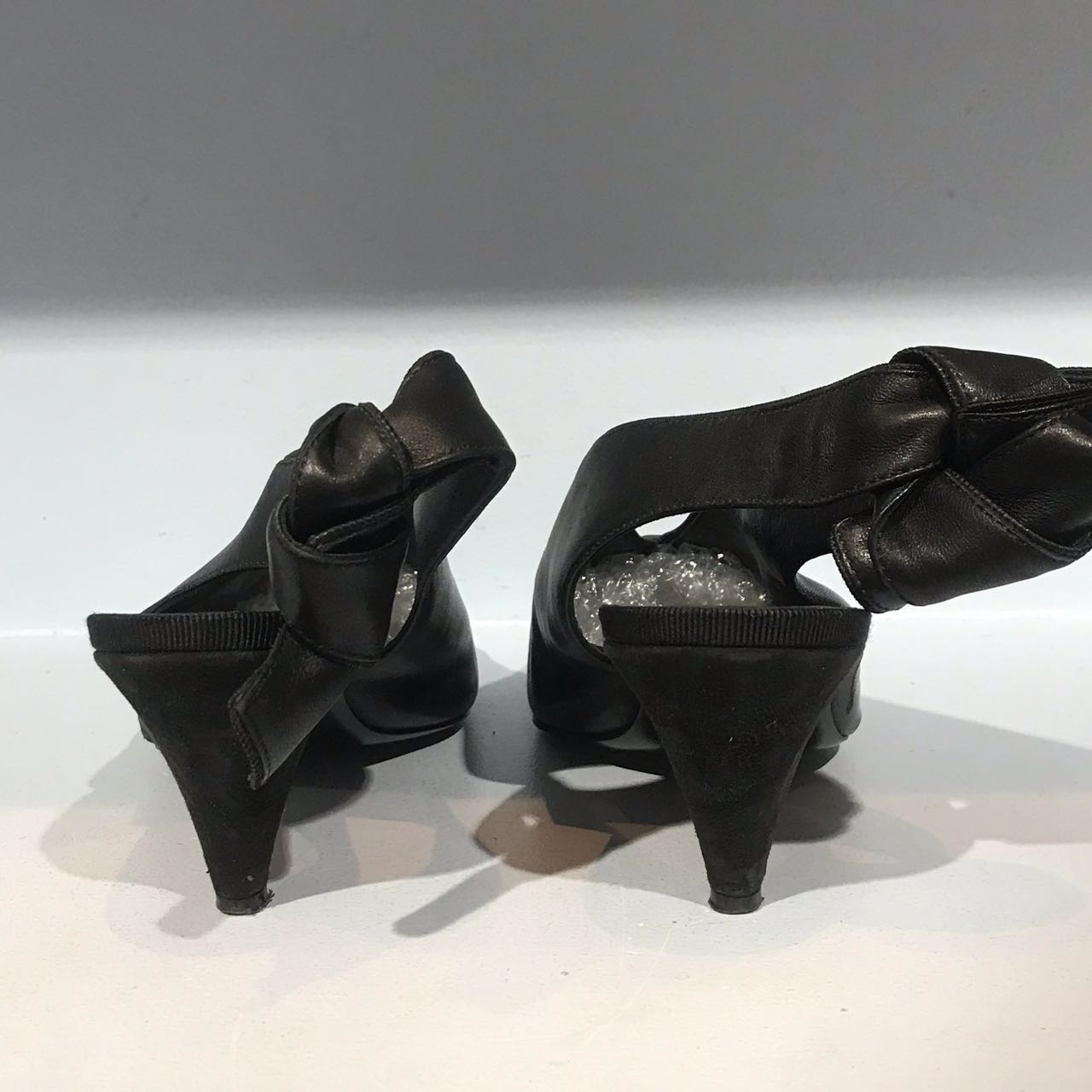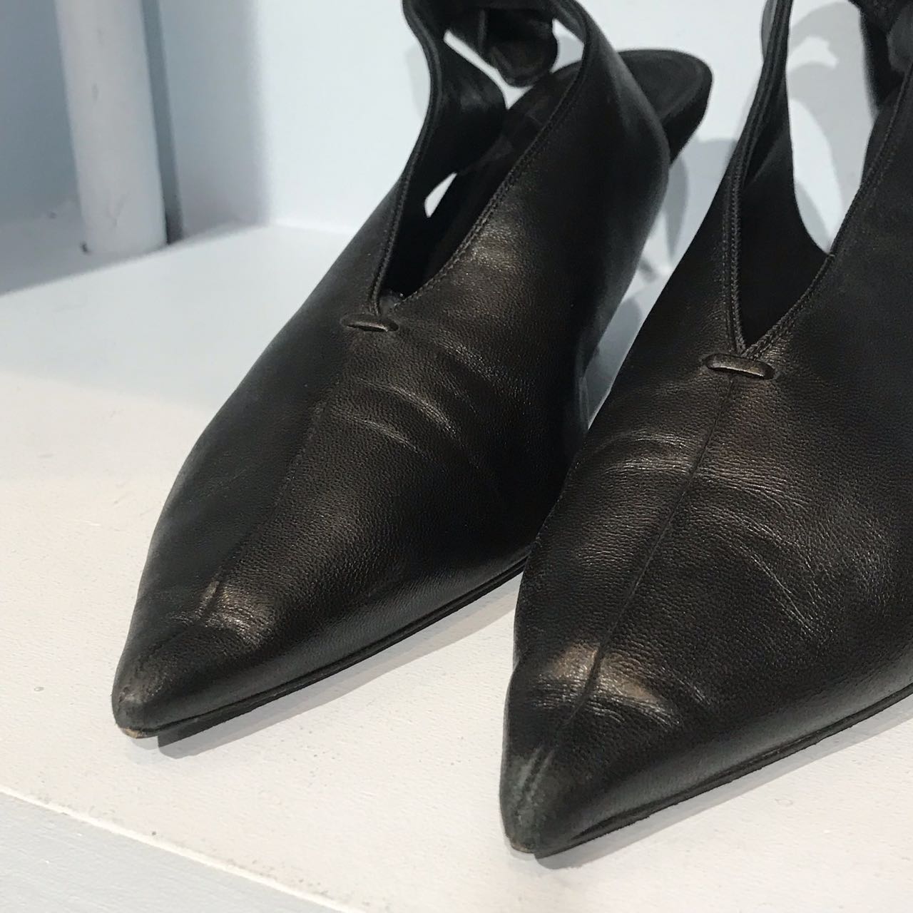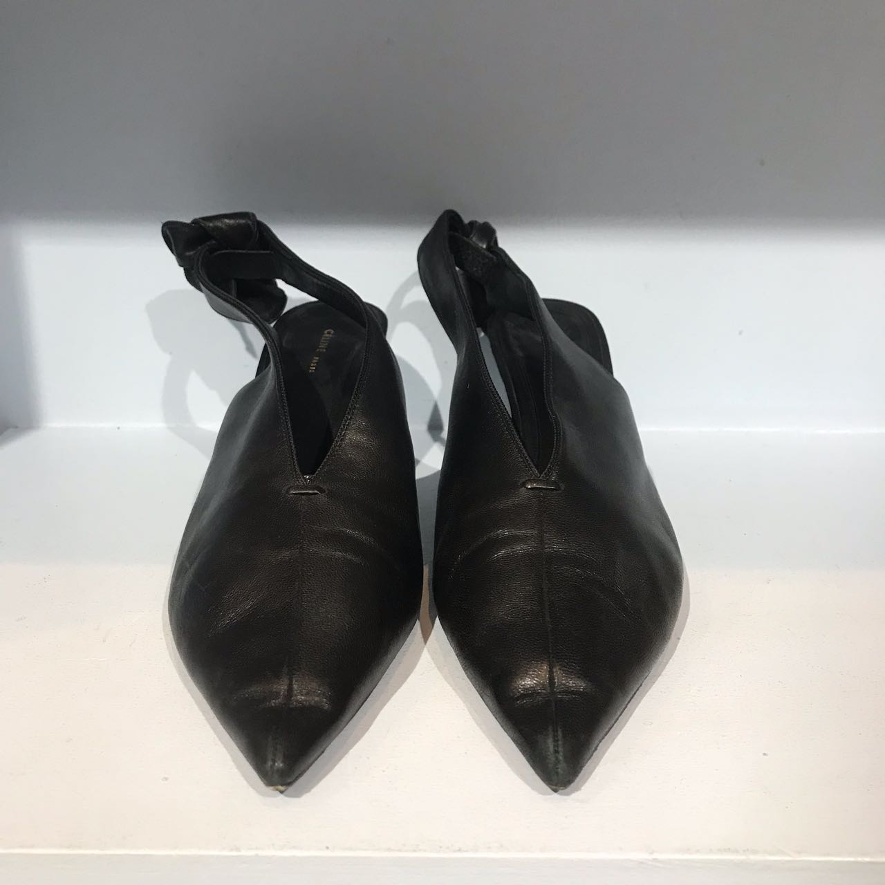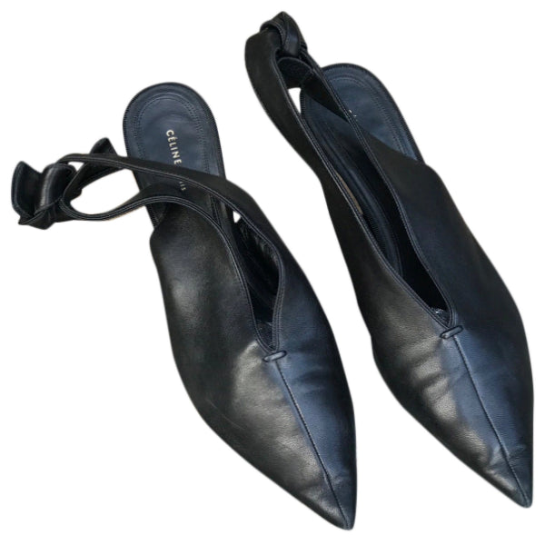 Escarpins à talon en cuir noir et bouts pointus. Ouverture aux talons.