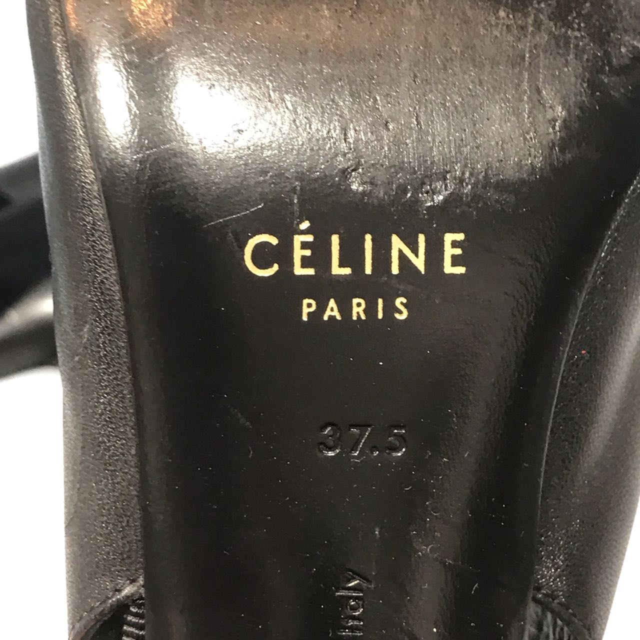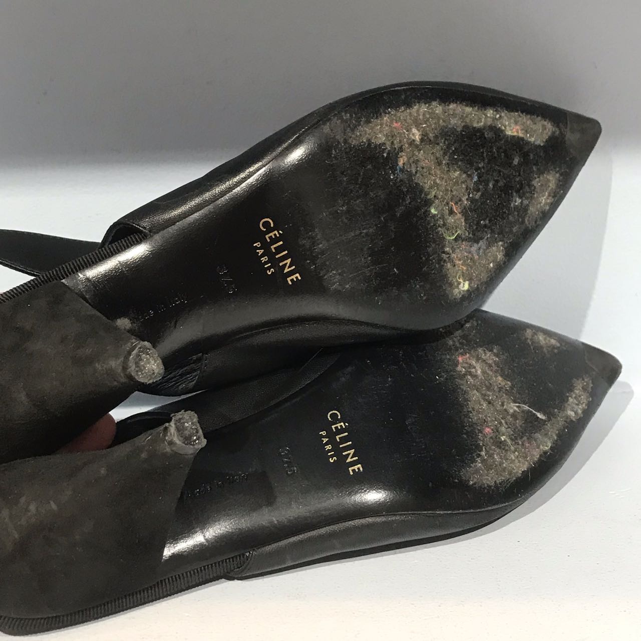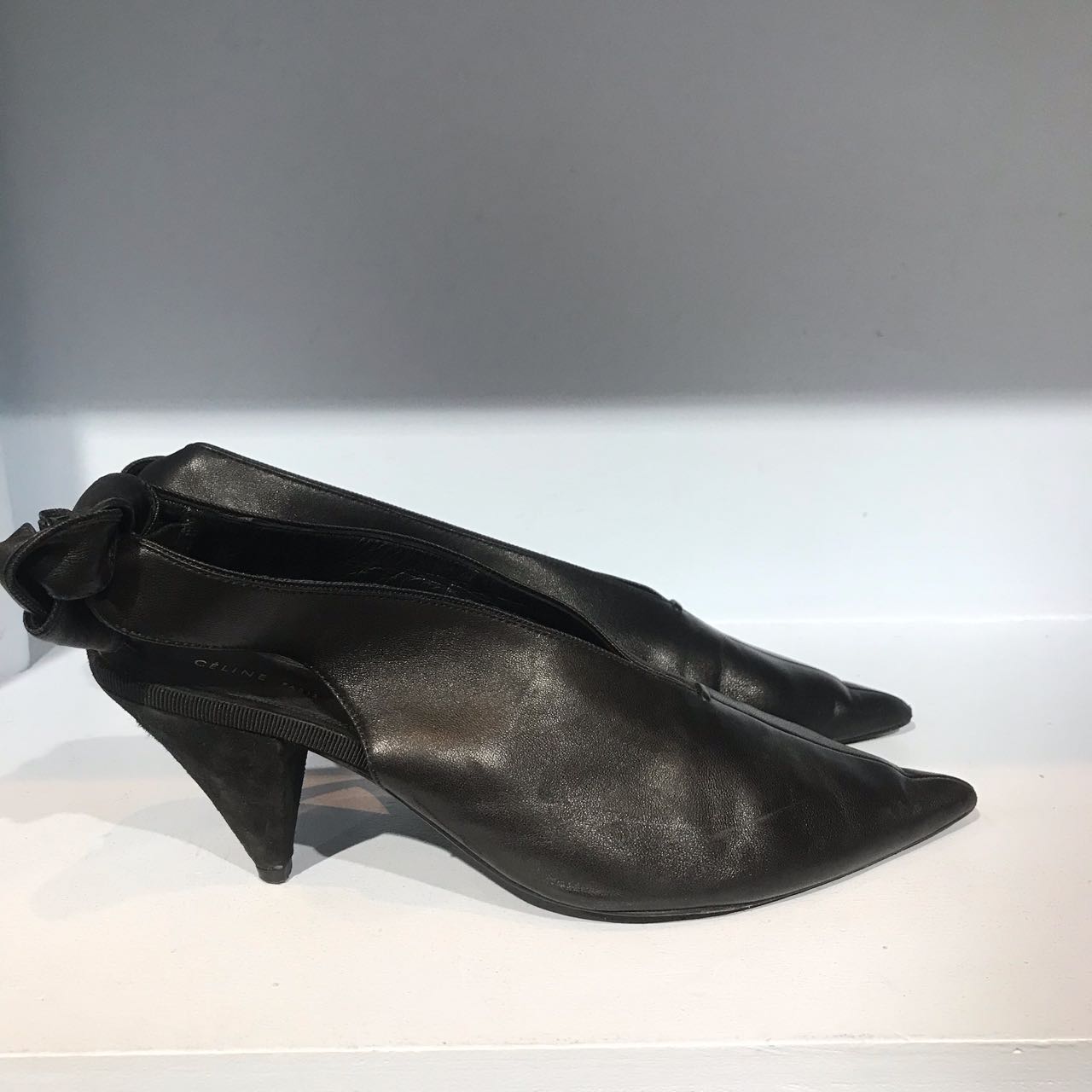 Escarpins à talon en cuir noir et bouts pointus. Ouverture aux talons.