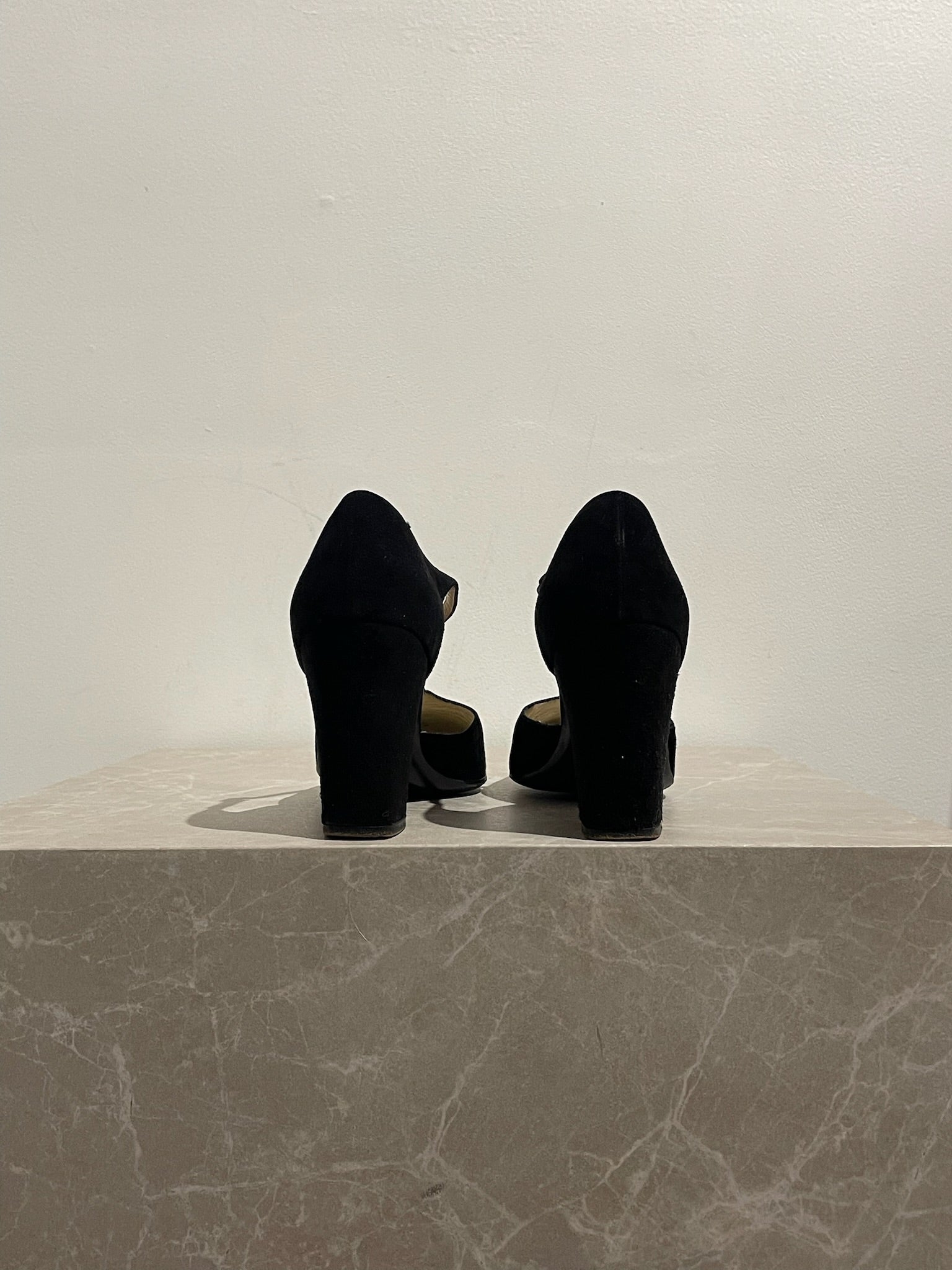 Escarpins à talon en daim noir et bouts en cuir vernis. Fermeture salomé avec bride ajustable à la cheville.