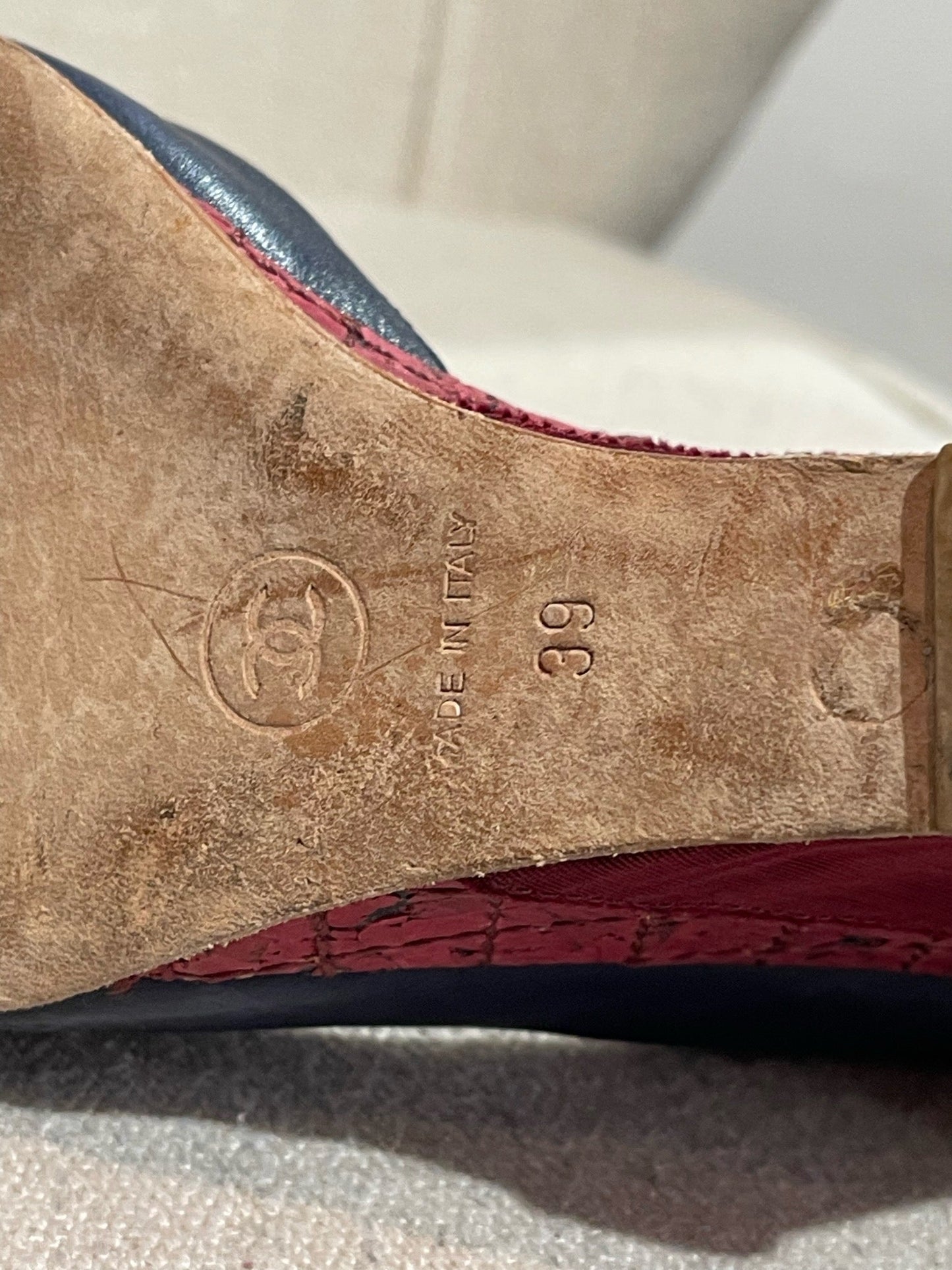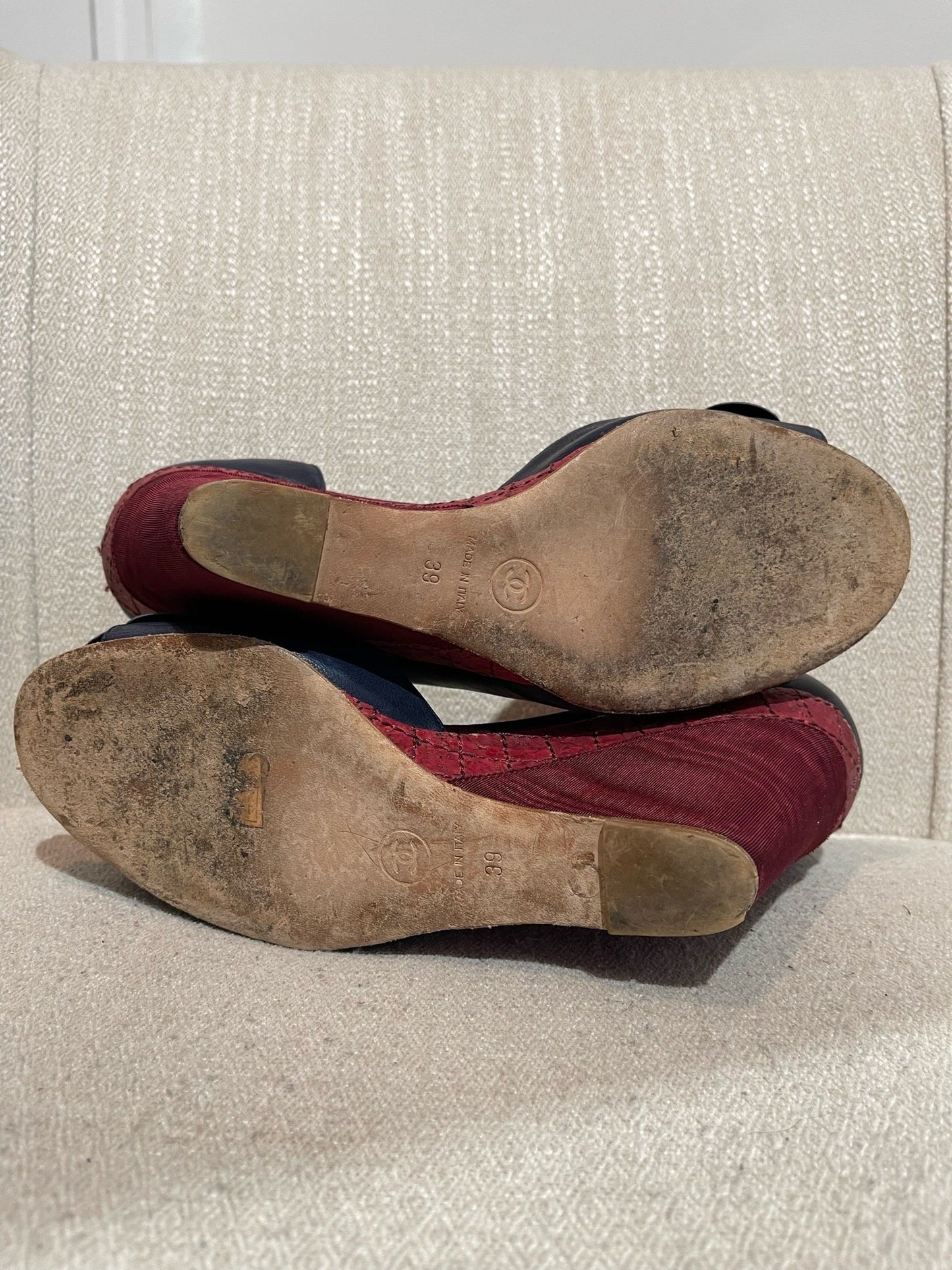 Escarpins à talons compensés en cuir bleu marine ornés d'un jolie camélia à l'avant. Logo CC en métal argent sur le camélia. Talon compensé en liège et tissu rouge.