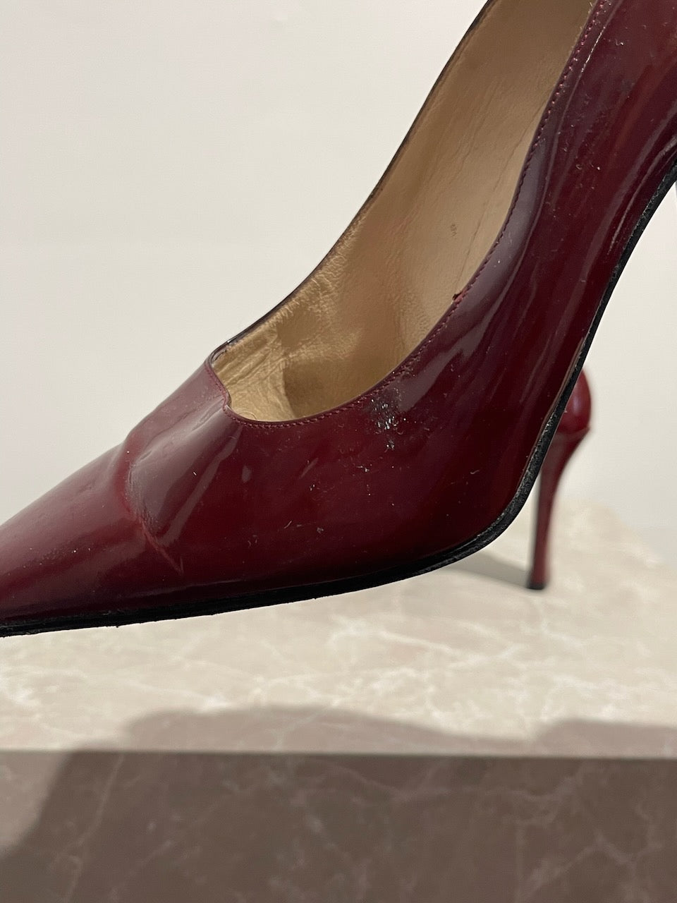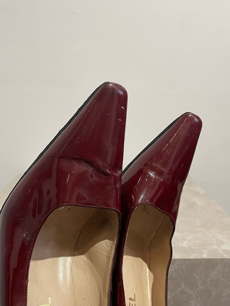 Escarpins en cuir verni bordeaux avec bouts pointus et inscription Chanel embossée sur le côté.