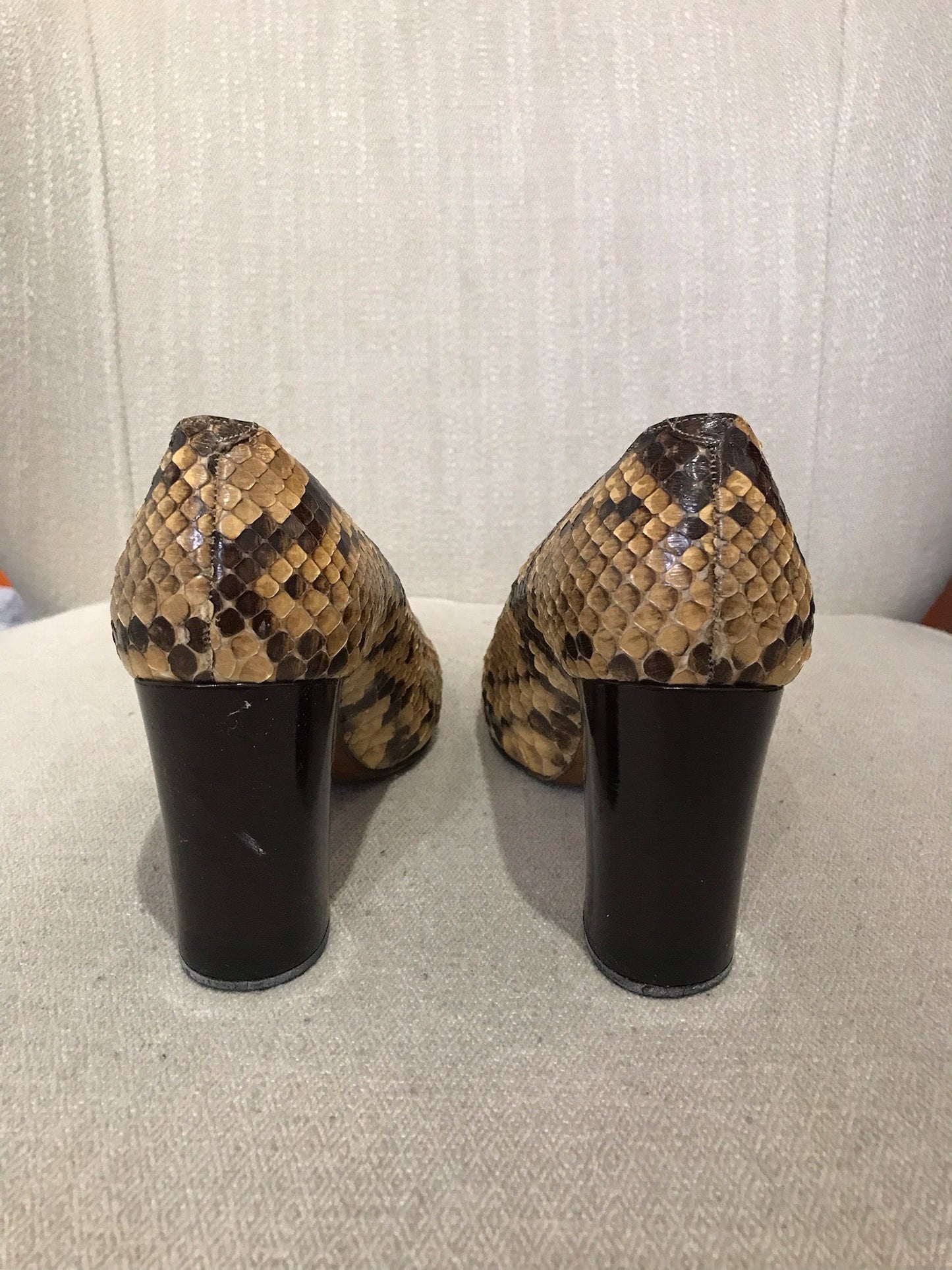 Escarpins en python beige avec bout en cuir marron.