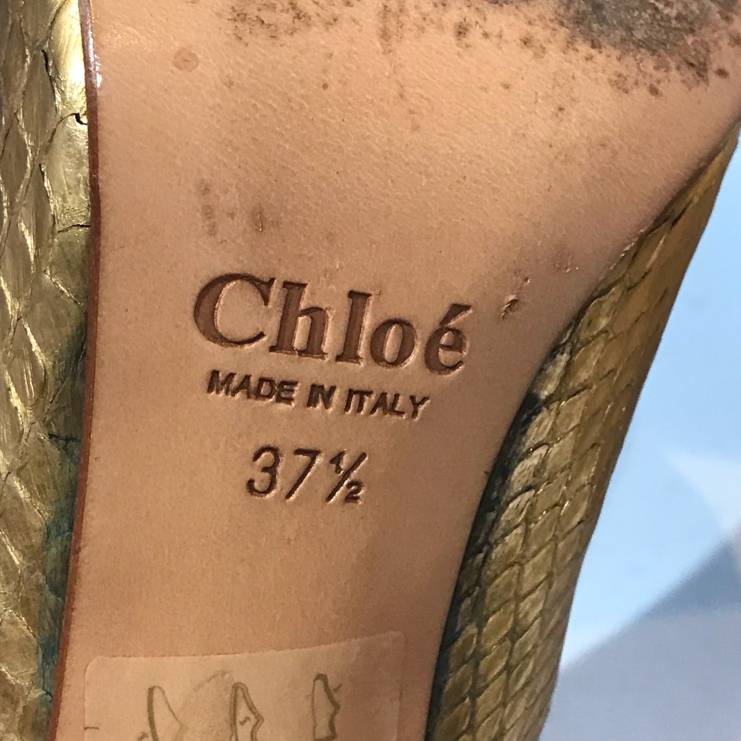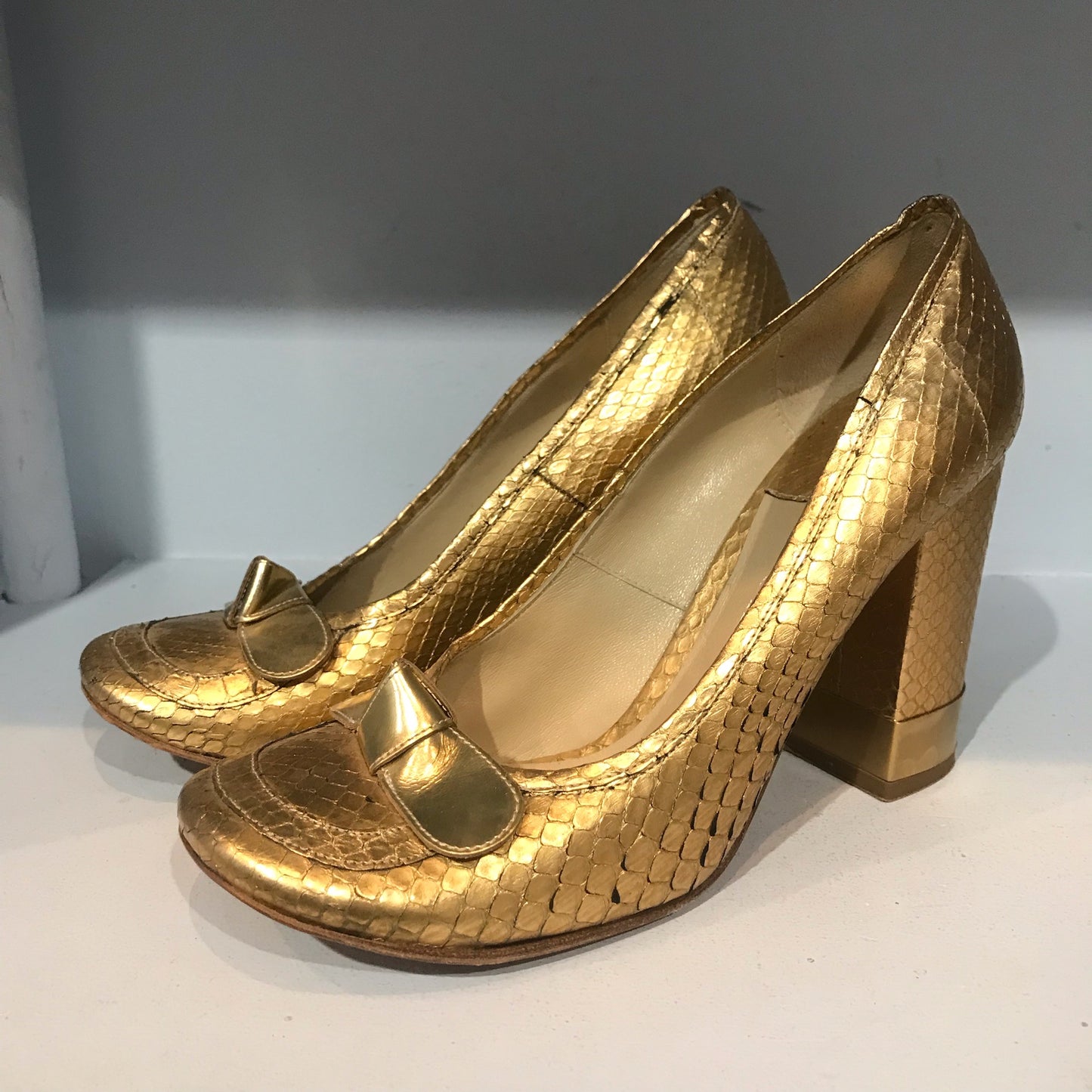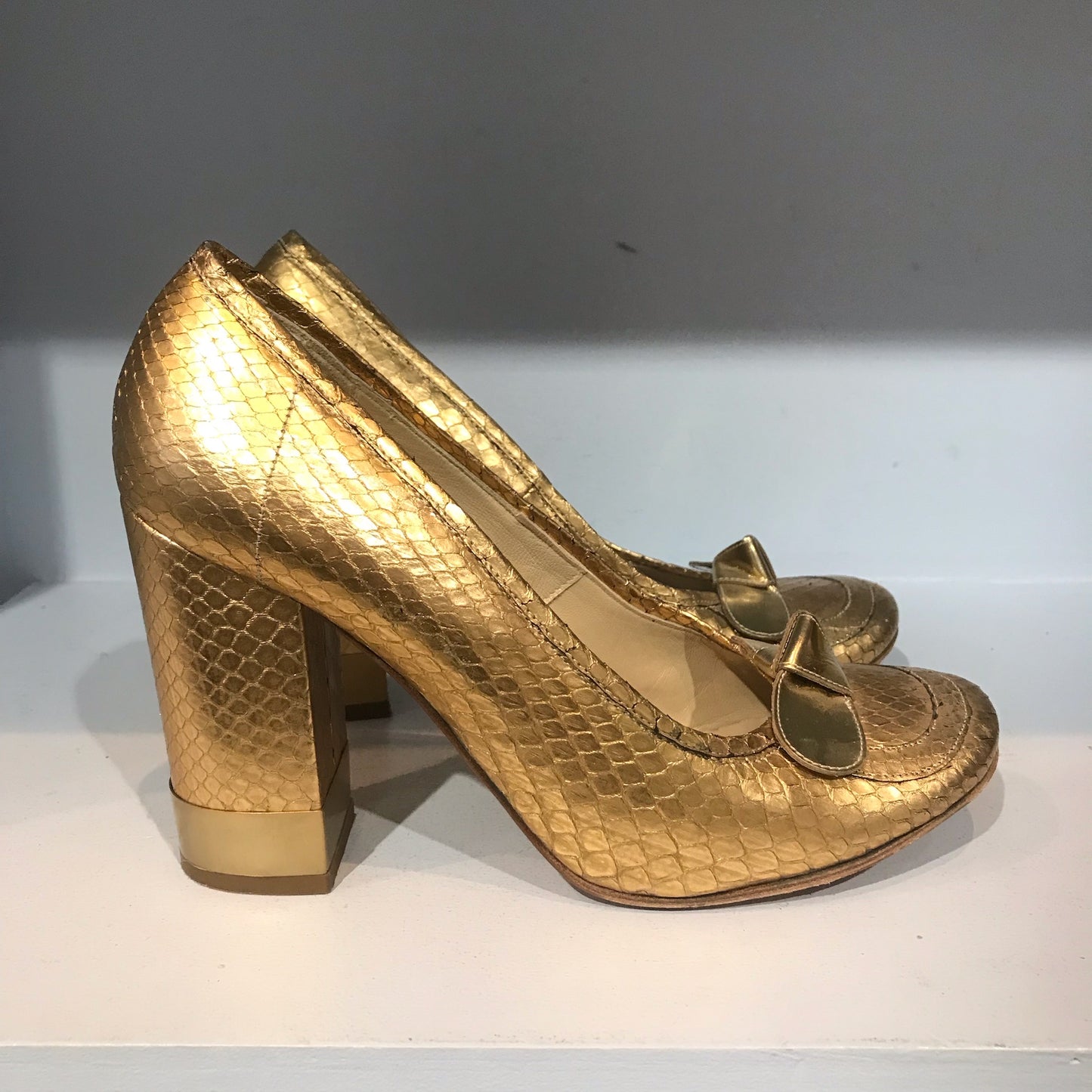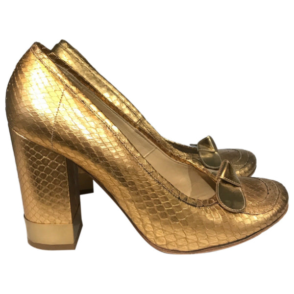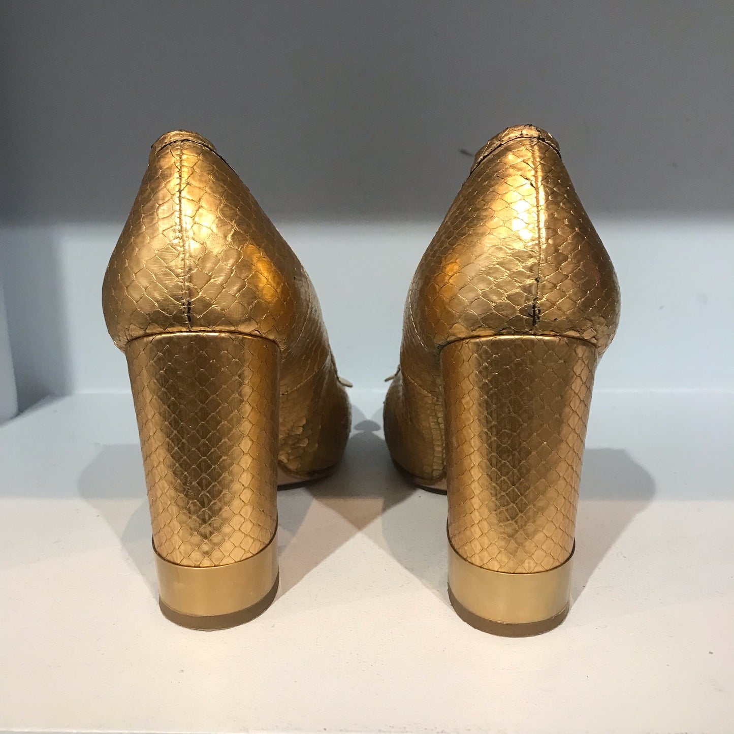 Escarpins en python doré décorés d'un petit noeud à l'avant.