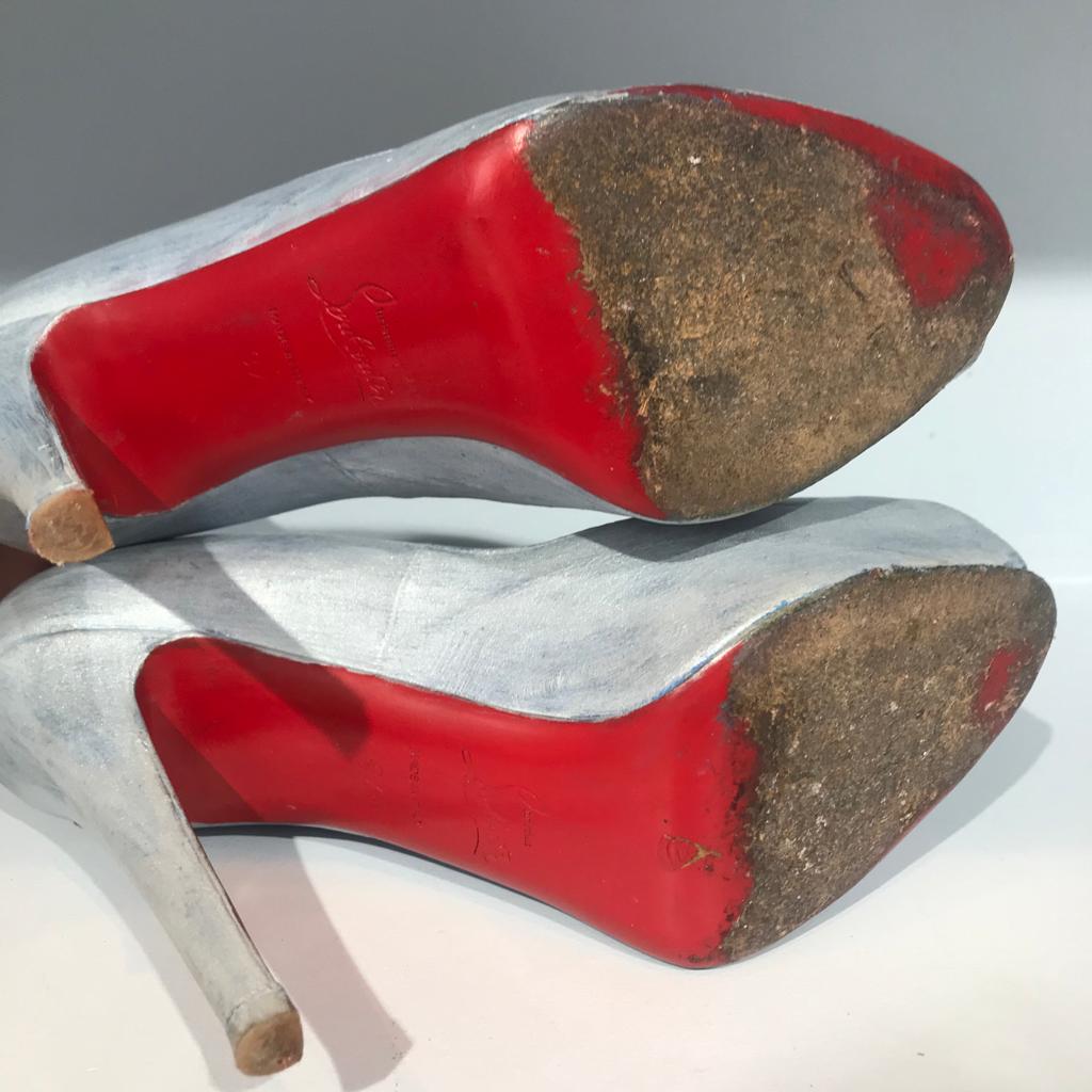 Escarpins en cuir repeint bleu ciel à bouts ouverts.