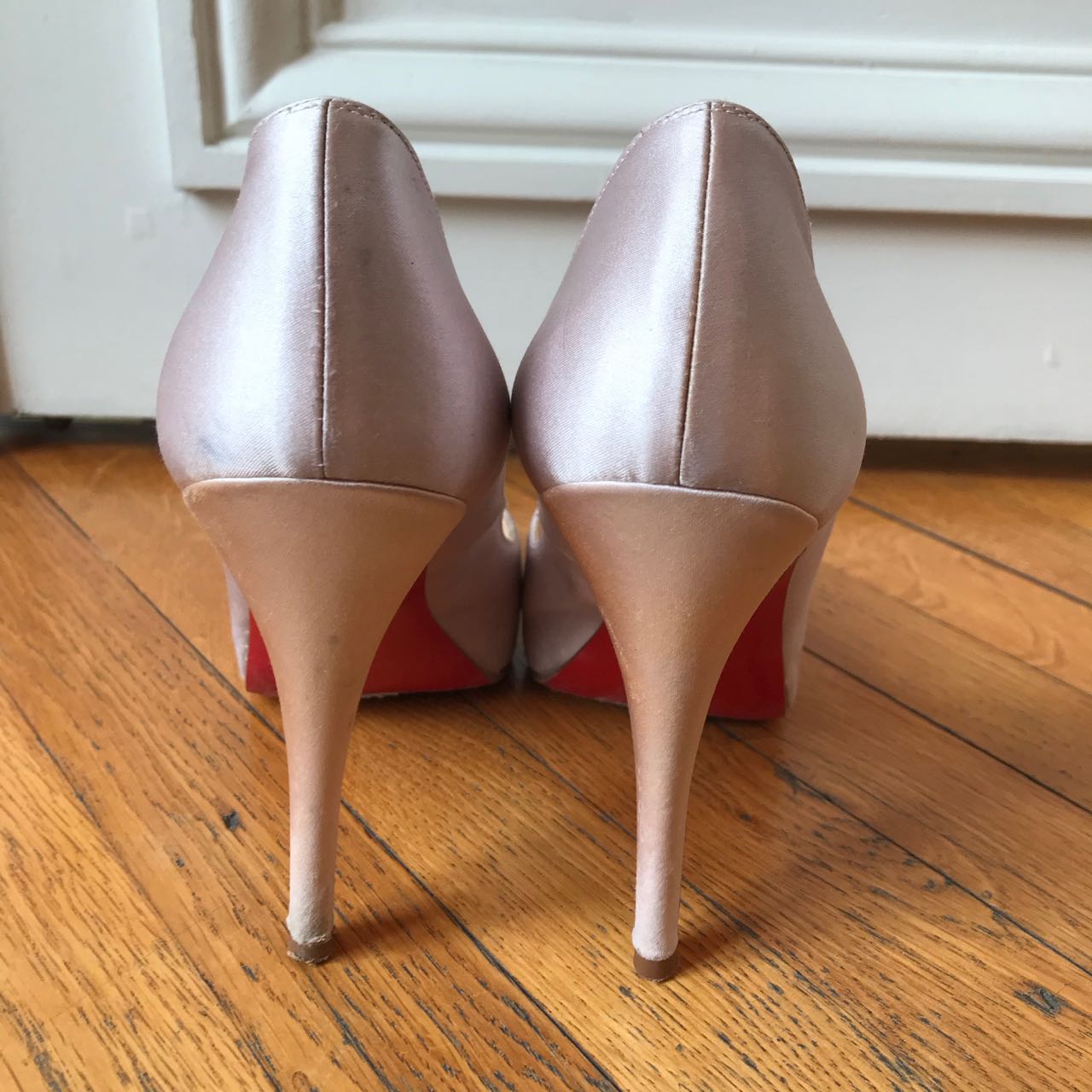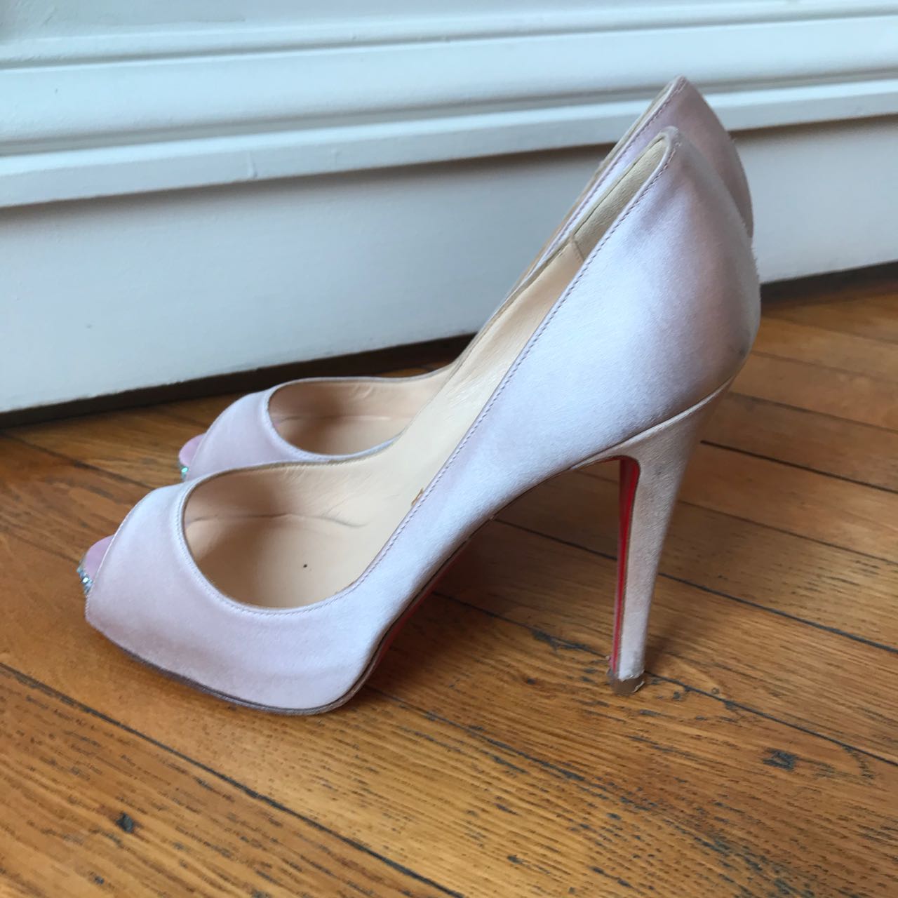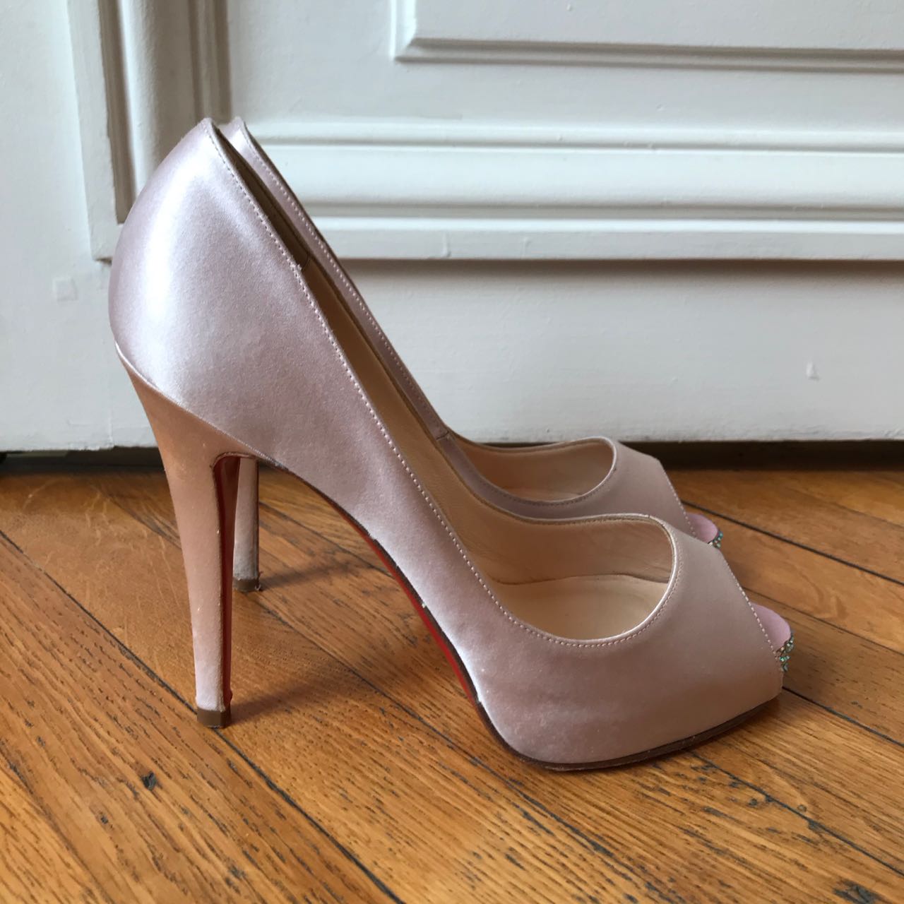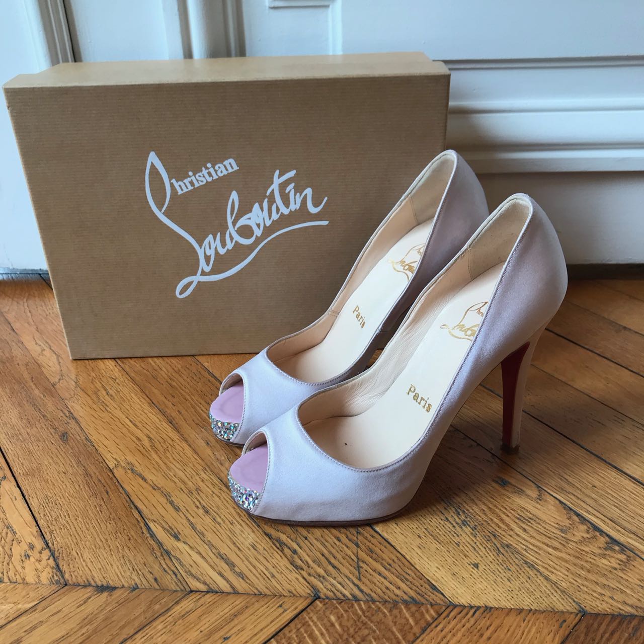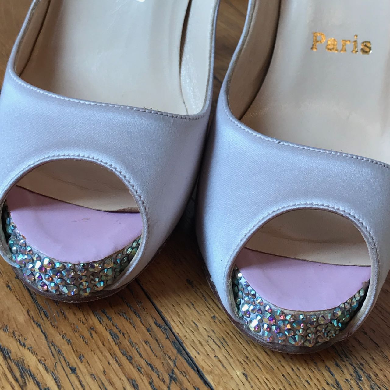 Escarpins en satin rose pale et strass Swaroswki sur les bouts ouverts.