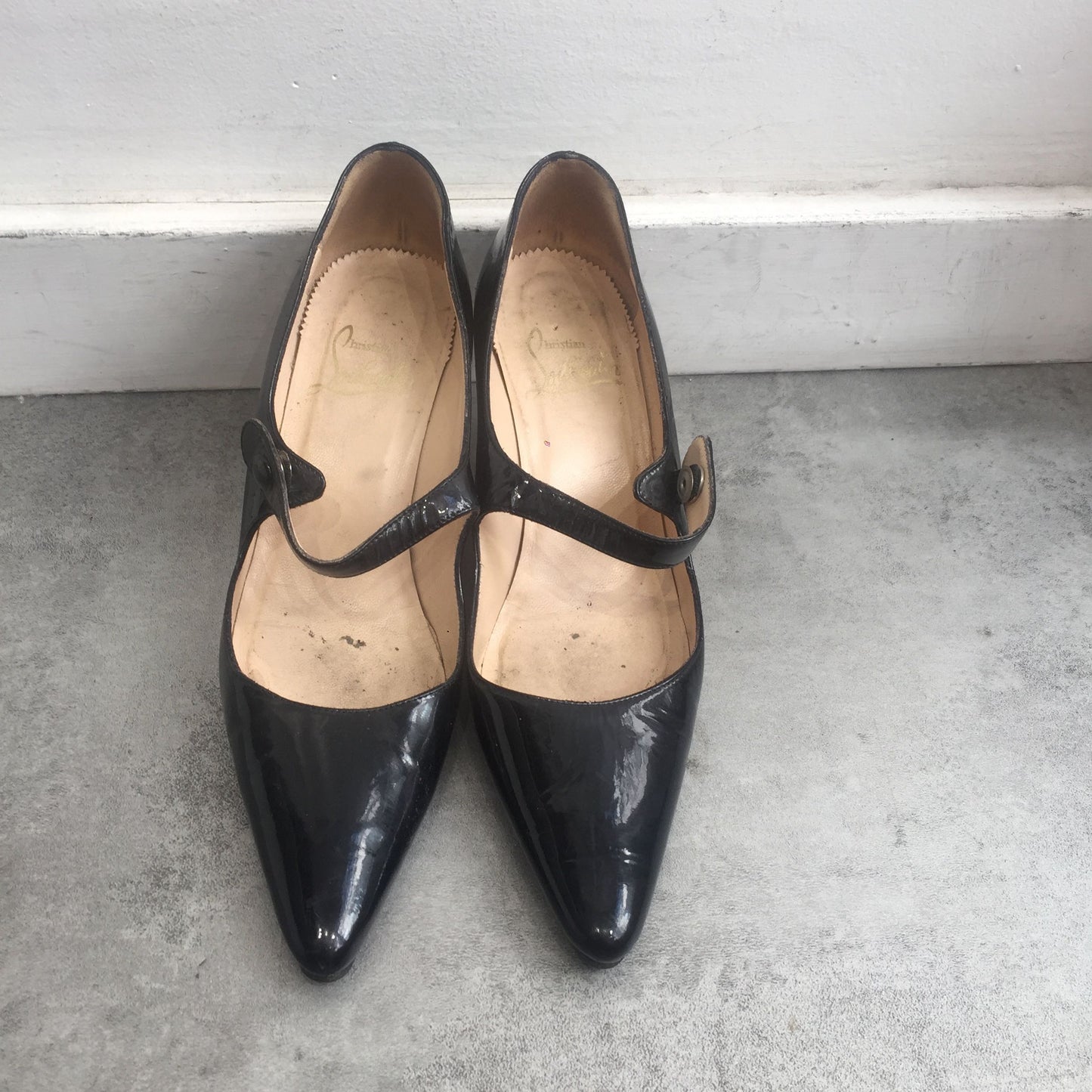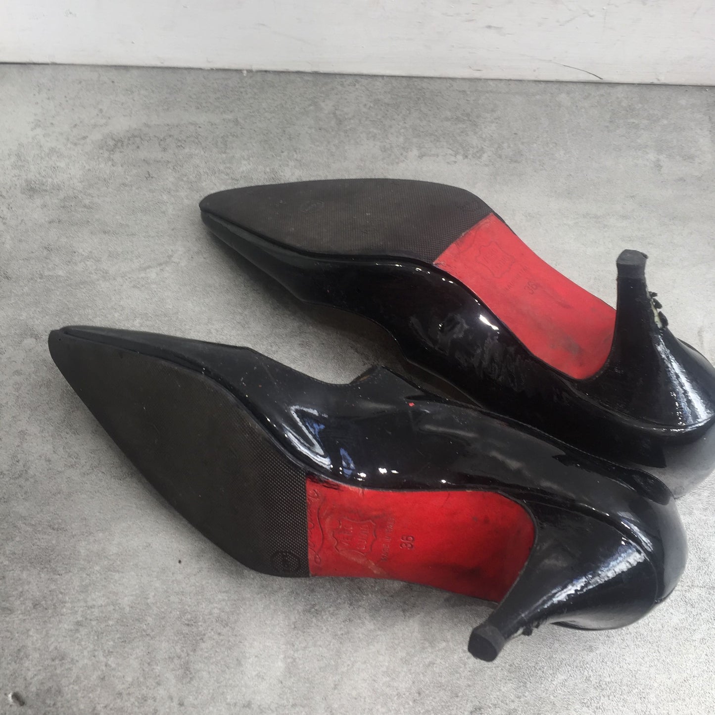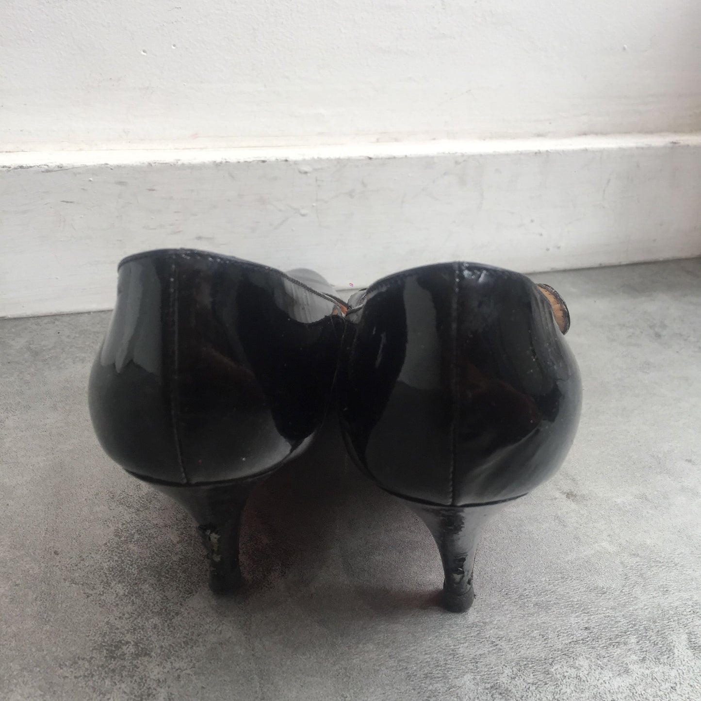 Escarpins en cuir vernis noir, bouts pointus et bride.