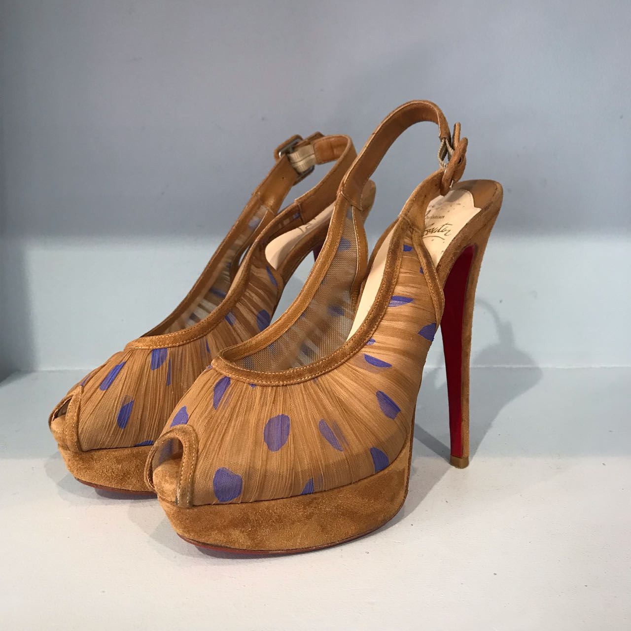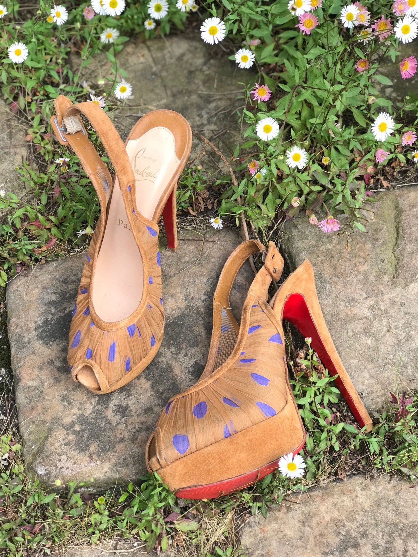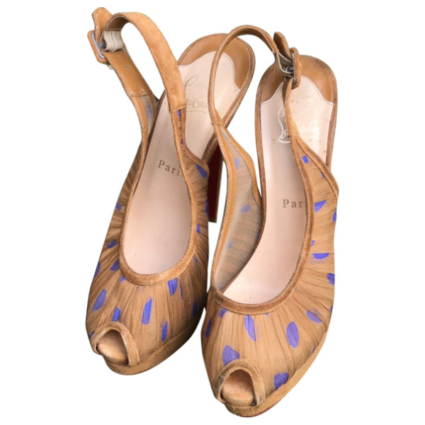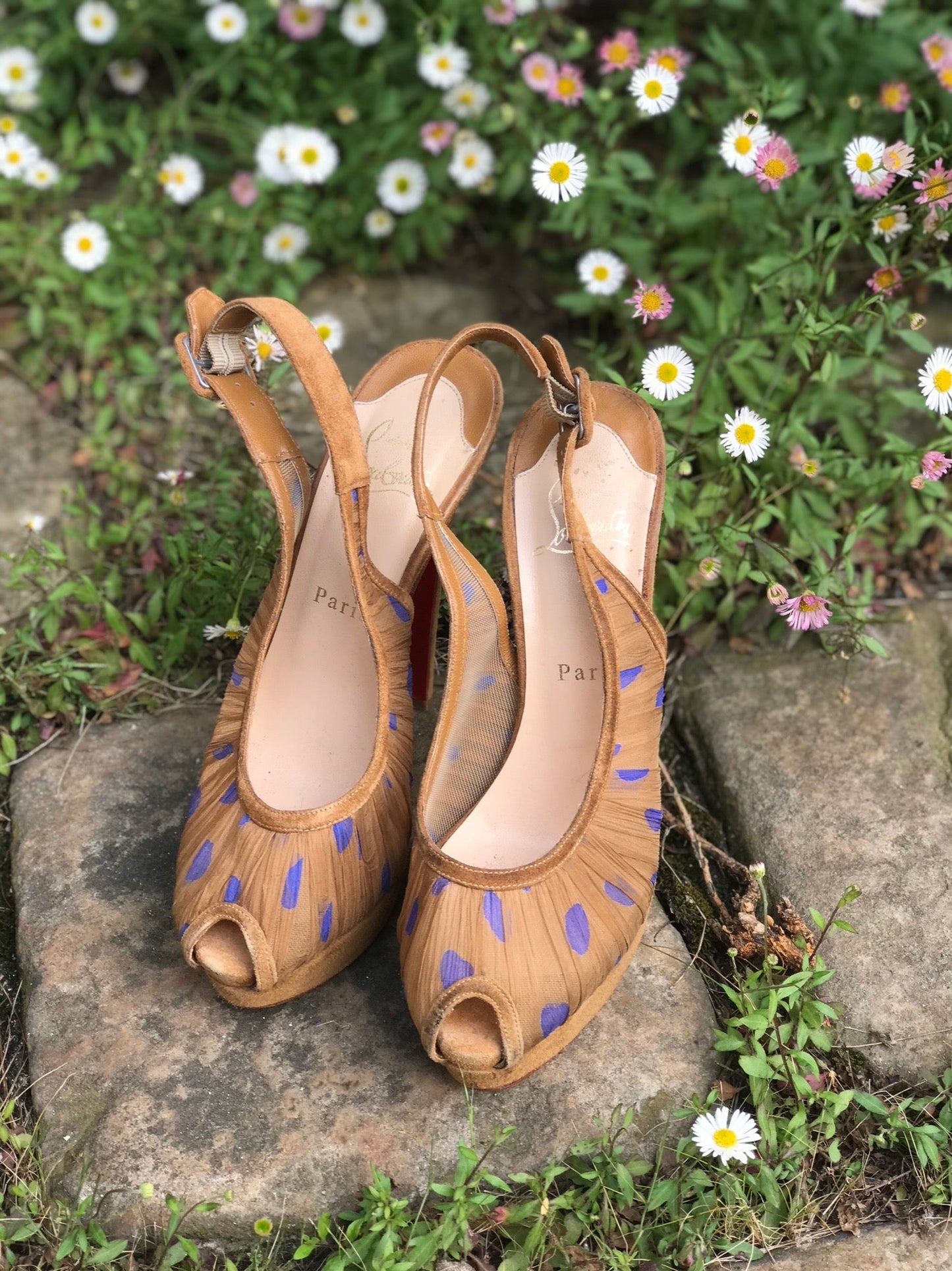Escarpins à talons hauts, en daim camel et tulle camel avec pois bleus. Bouts ouverts et bride réglable au talon.