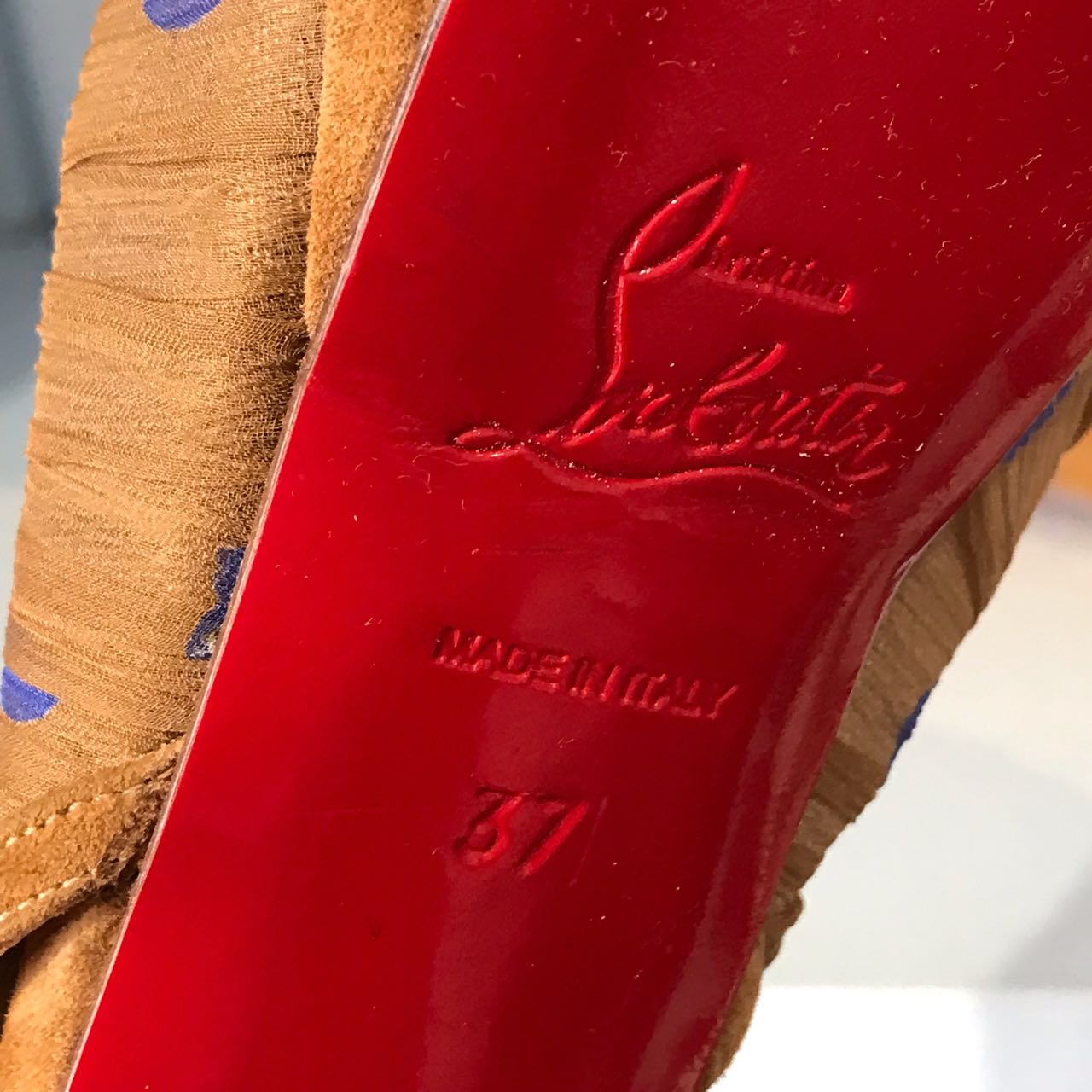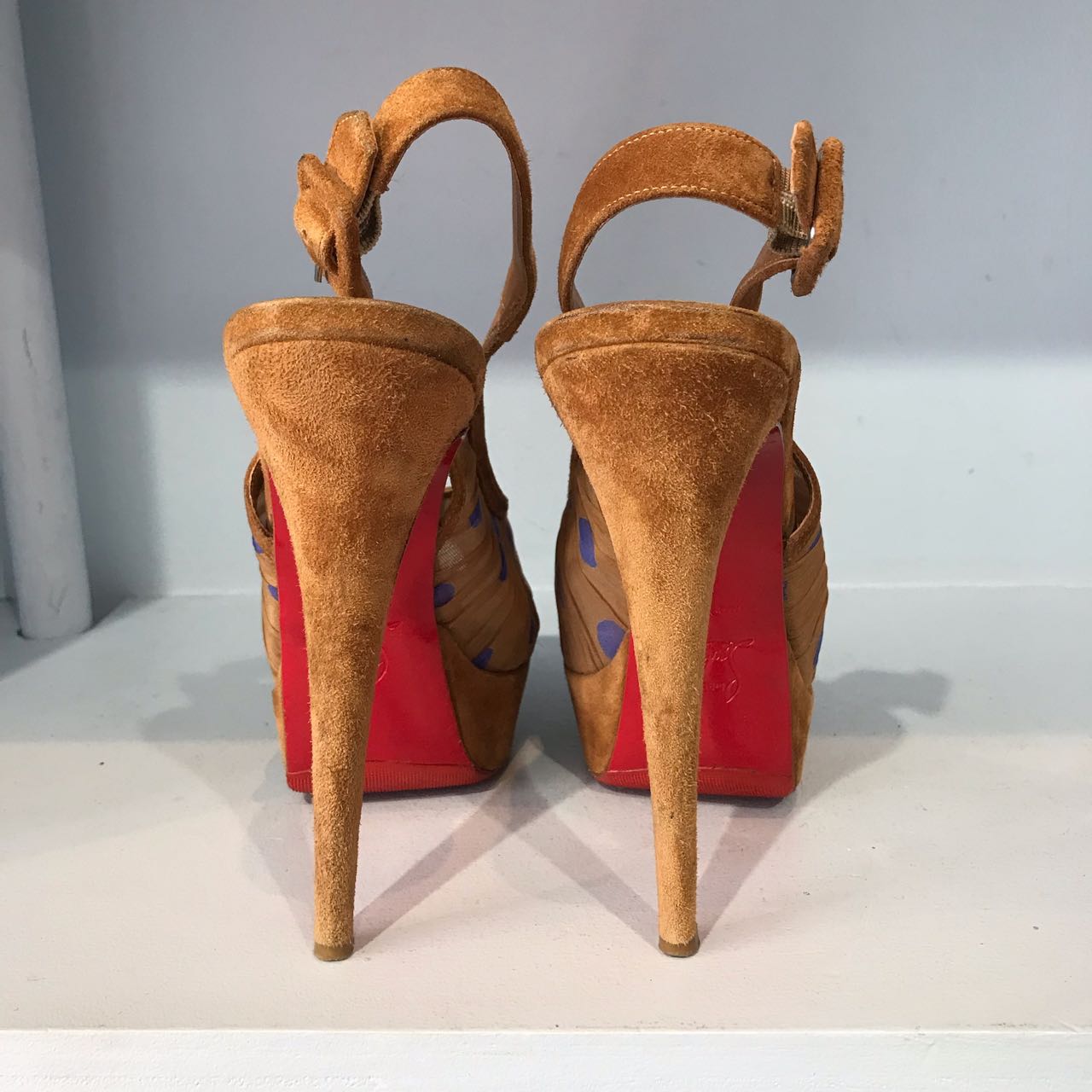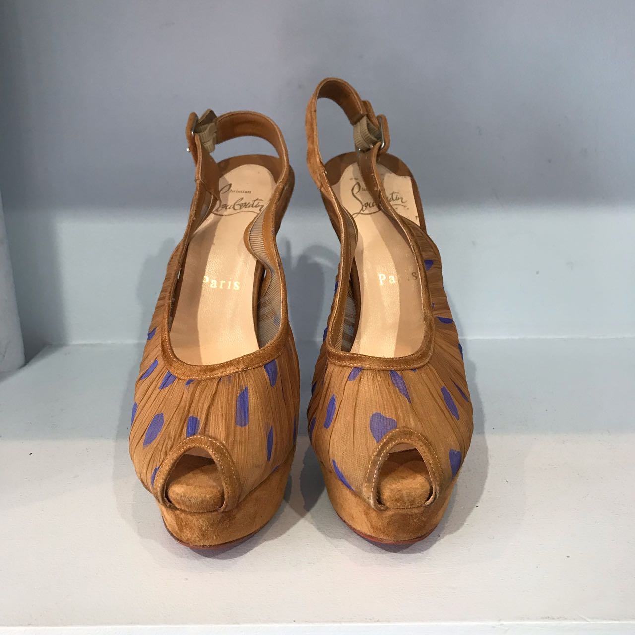 Escarpins à talons hauts, en daim camel et tulle camel avec pois bleus. Bouts ouverts et bride réglable au talon.