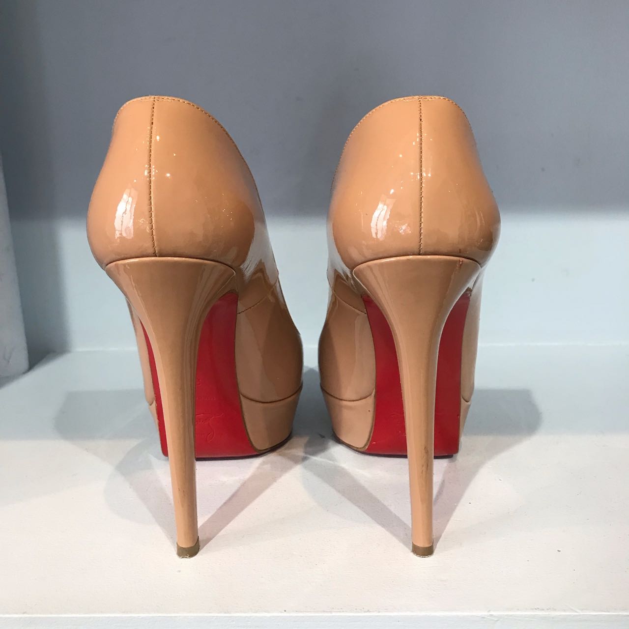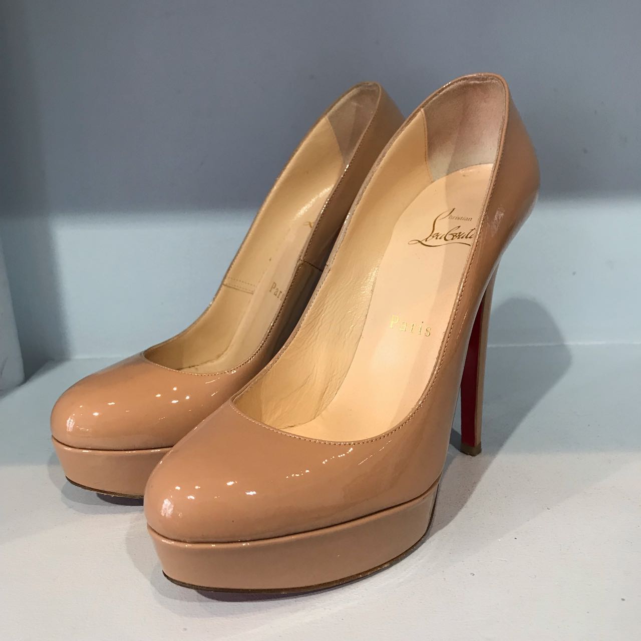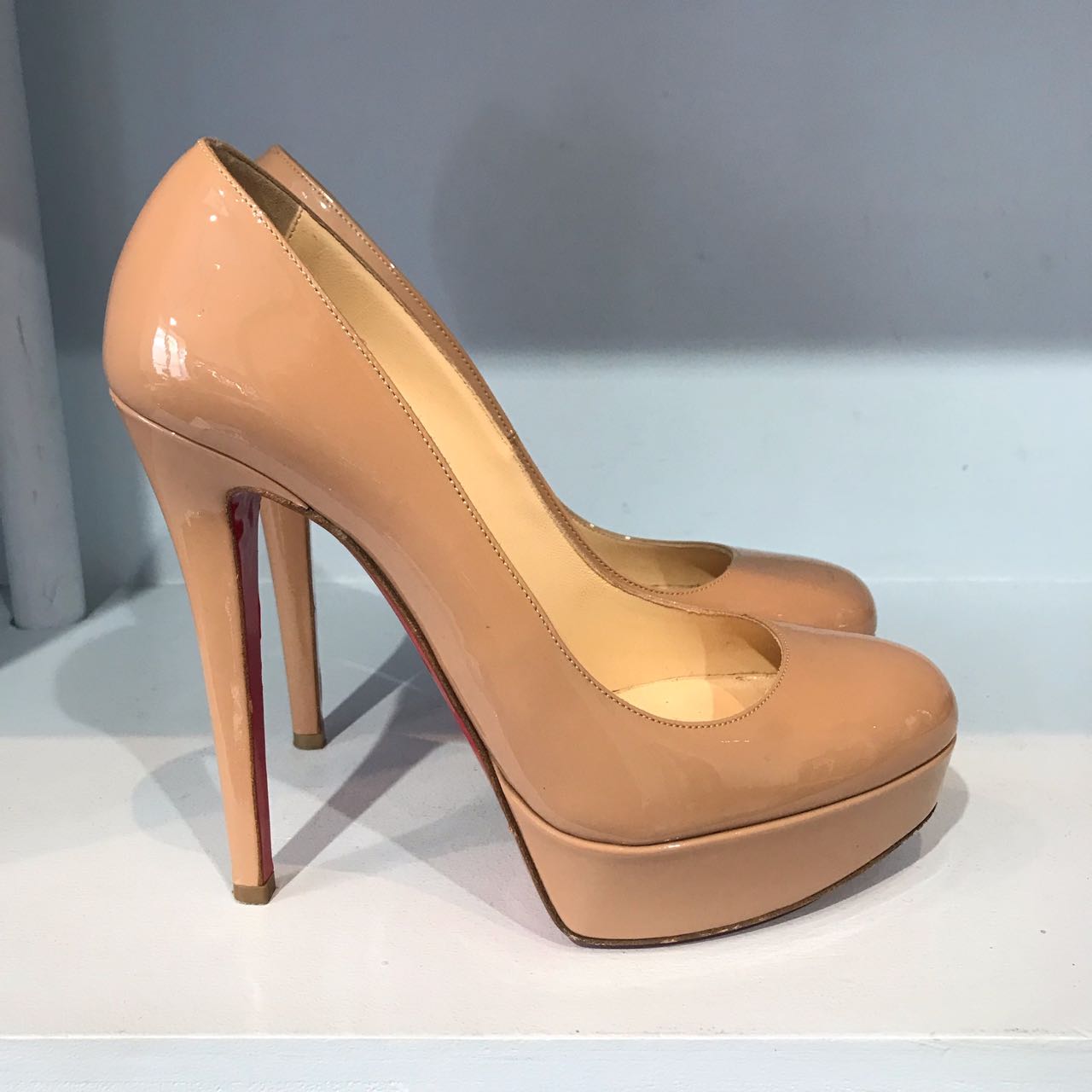 Modèle Bianca, escarpins en cuir vernis beige nude, bouts arrondis.