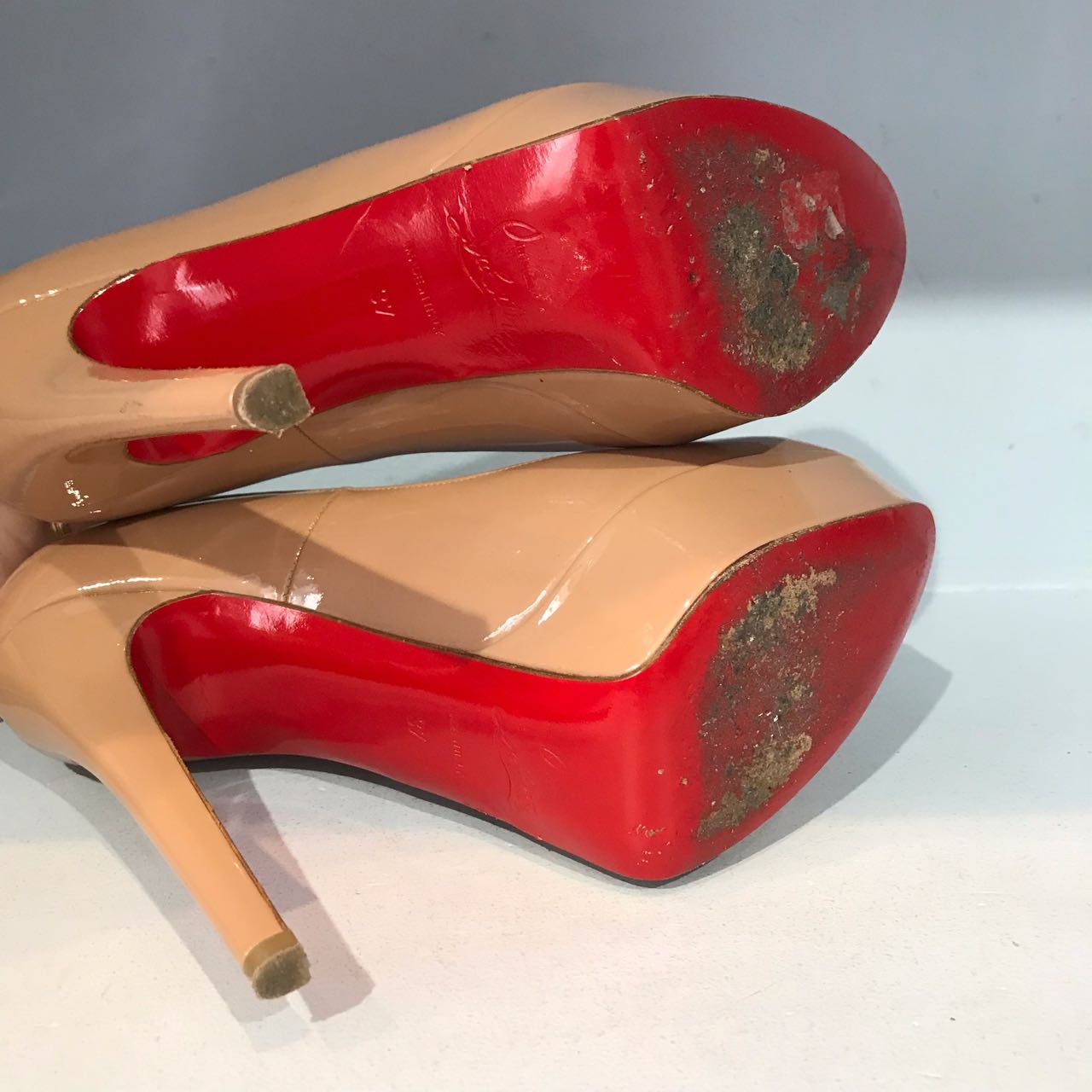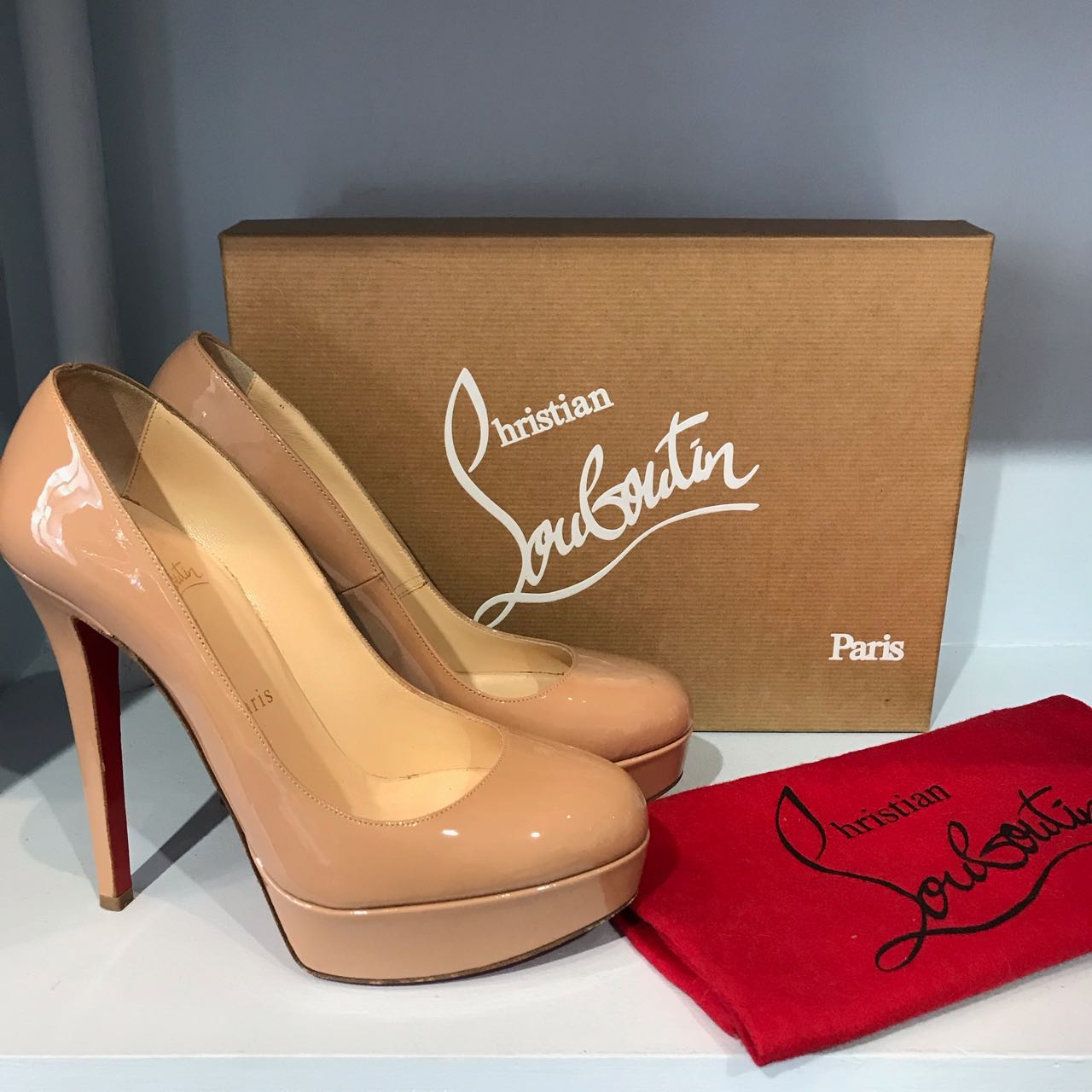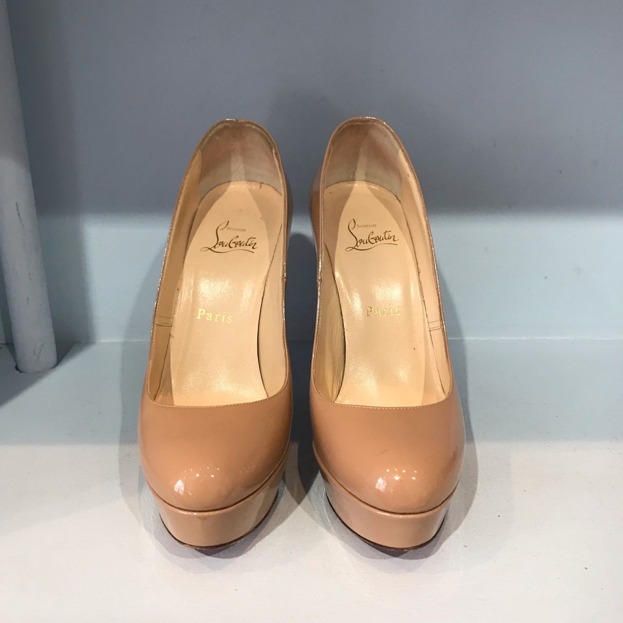 Modèle Bianca, escarpins en cuir vernis beige nude, bouts arrondis.