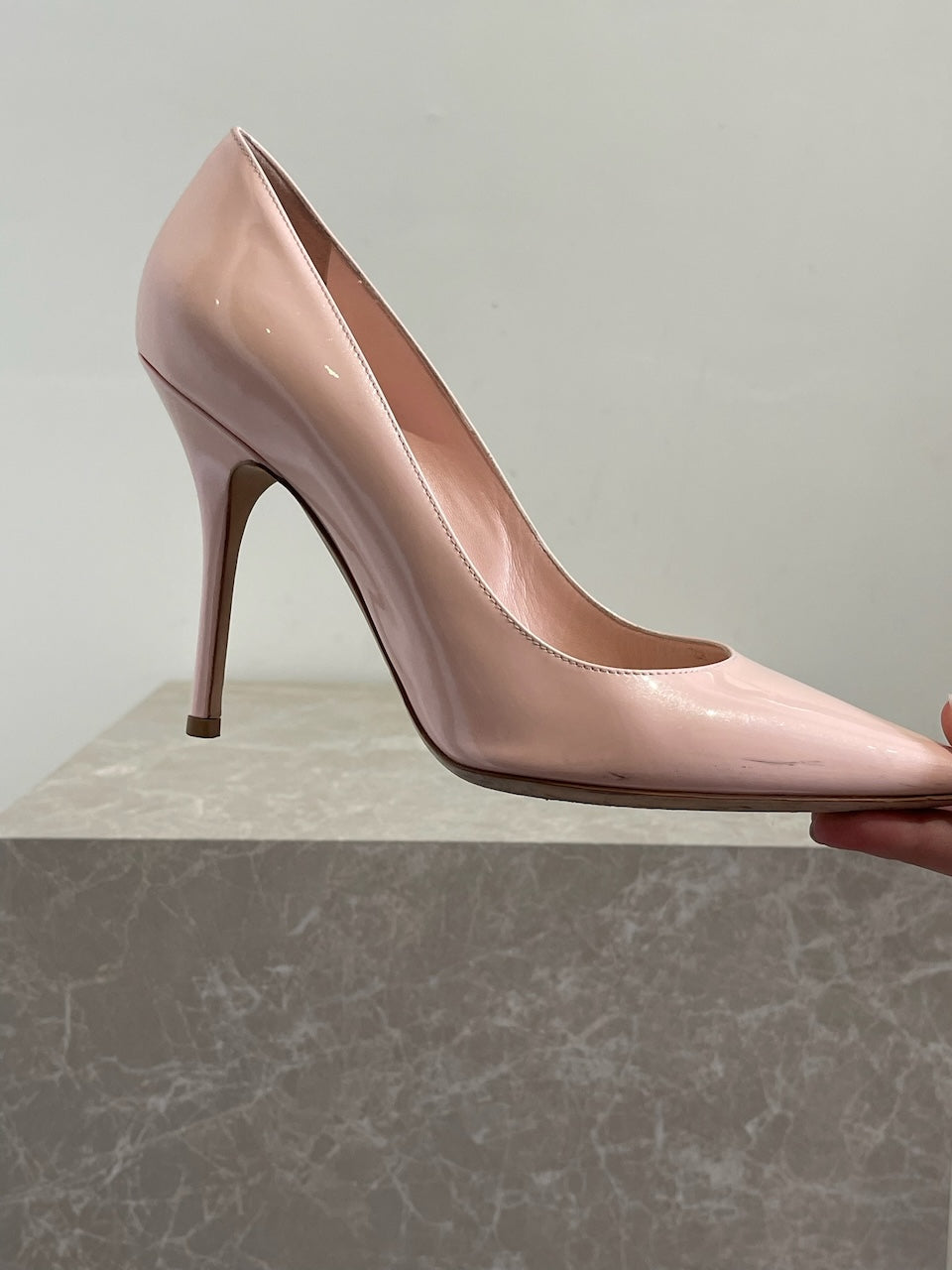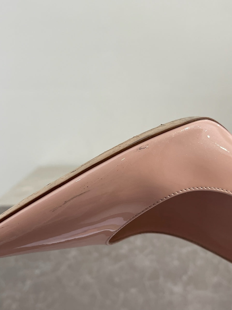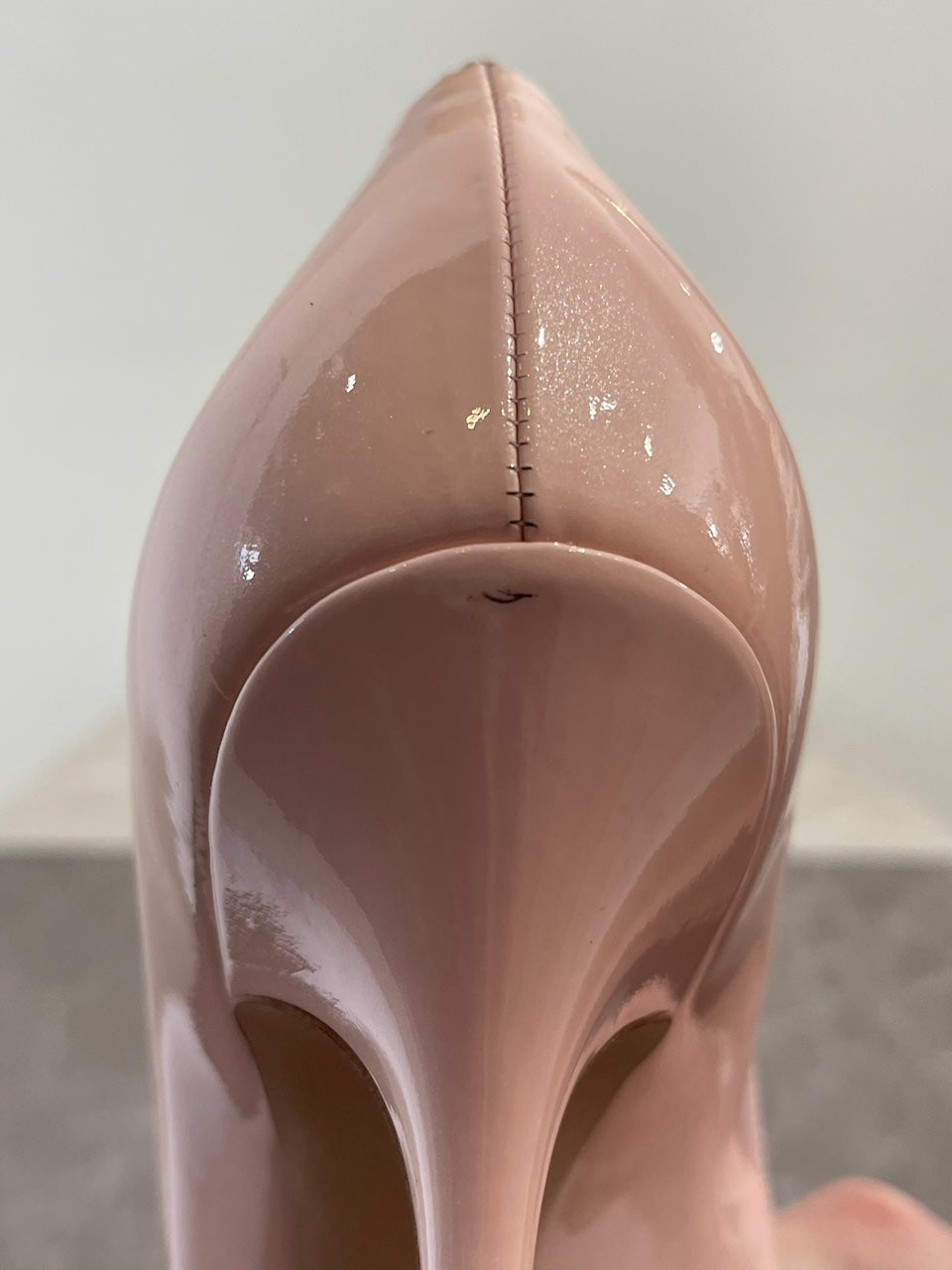Escarpins en cuir verni pailleté rose pâle avec bouts pointus.