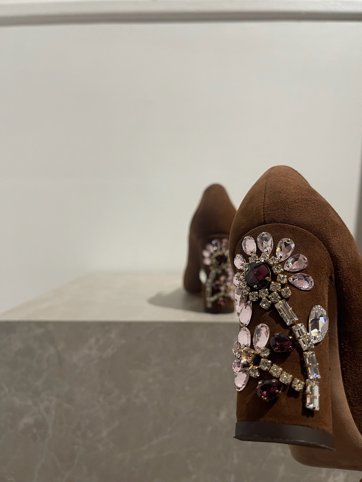 Escarpins en daim marron, motif floral en cristaux colorés sur le talon et fleur sur la bride principale.